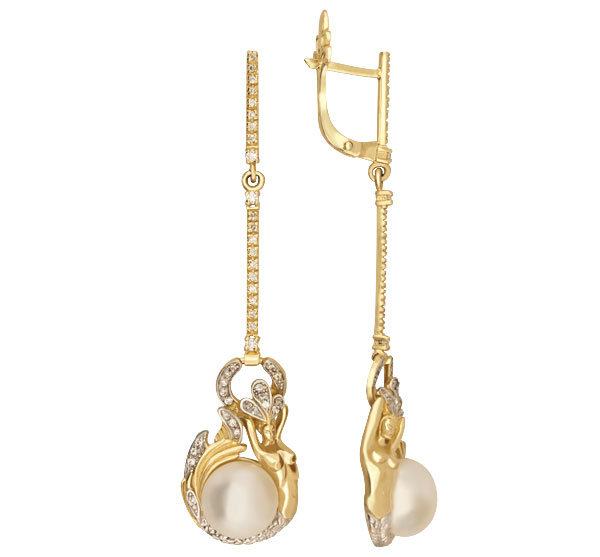 Серьги из лимонного золота c бриллиантами и жемчугом