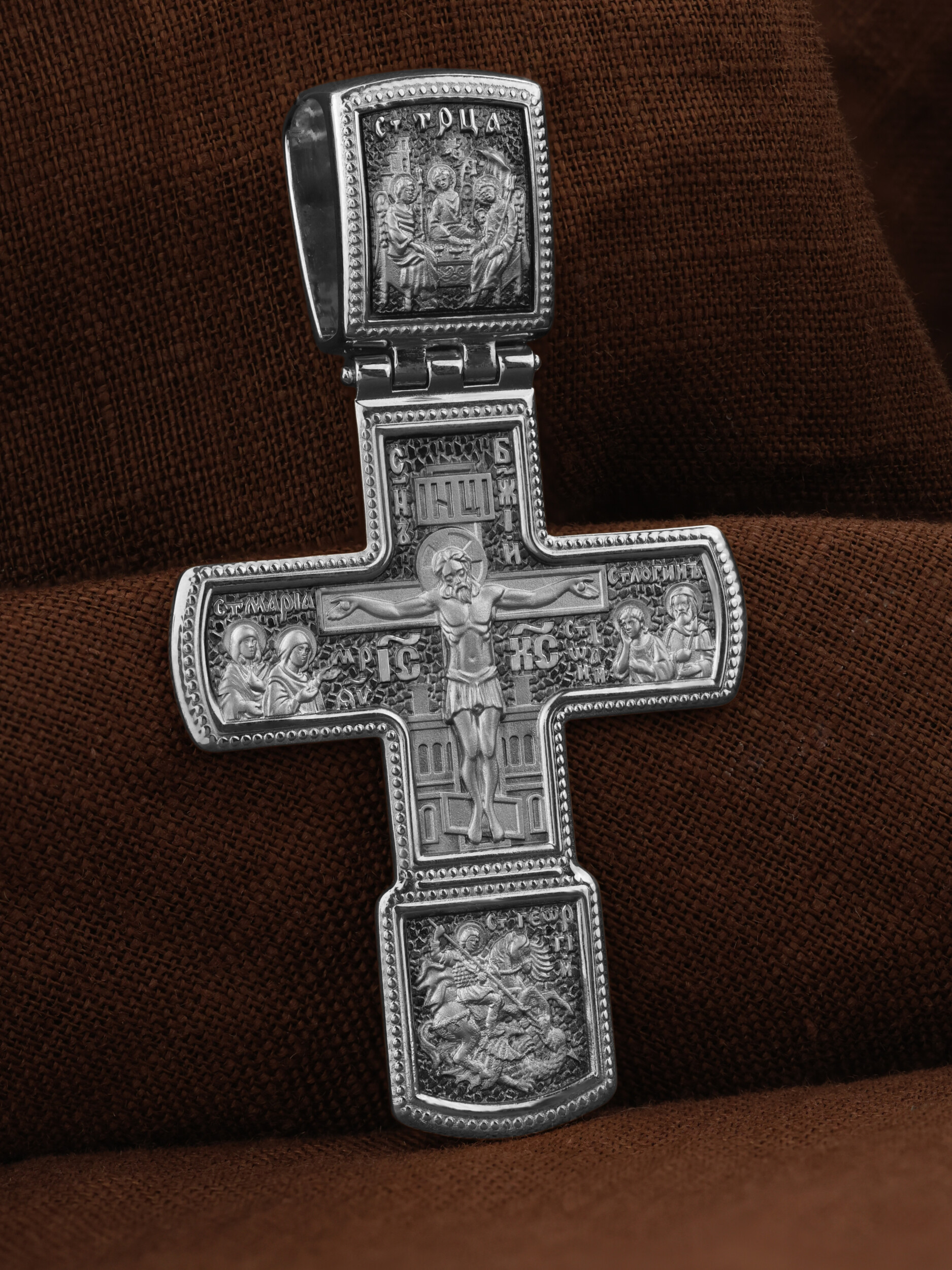 На кресте изображено Распятие Господа нашего Иисуса Христа. Ему предстоят Святая Мария Магдалина, Пресвятая Богородица, апостол Иоанн и Святой Иосиф, свидетели крестных страданий Господа. Вверху — икона Святой Троицы, на которой запечатлено явление Триединого Бога праотцу Аврааму в виде трех ангелов. В нижнем клейме изображено Чудо Святого Георгия о змие. Великомученик Георгий почитается как покровитель воинов, защитник от злых сил, помощник в духовной борьбе.