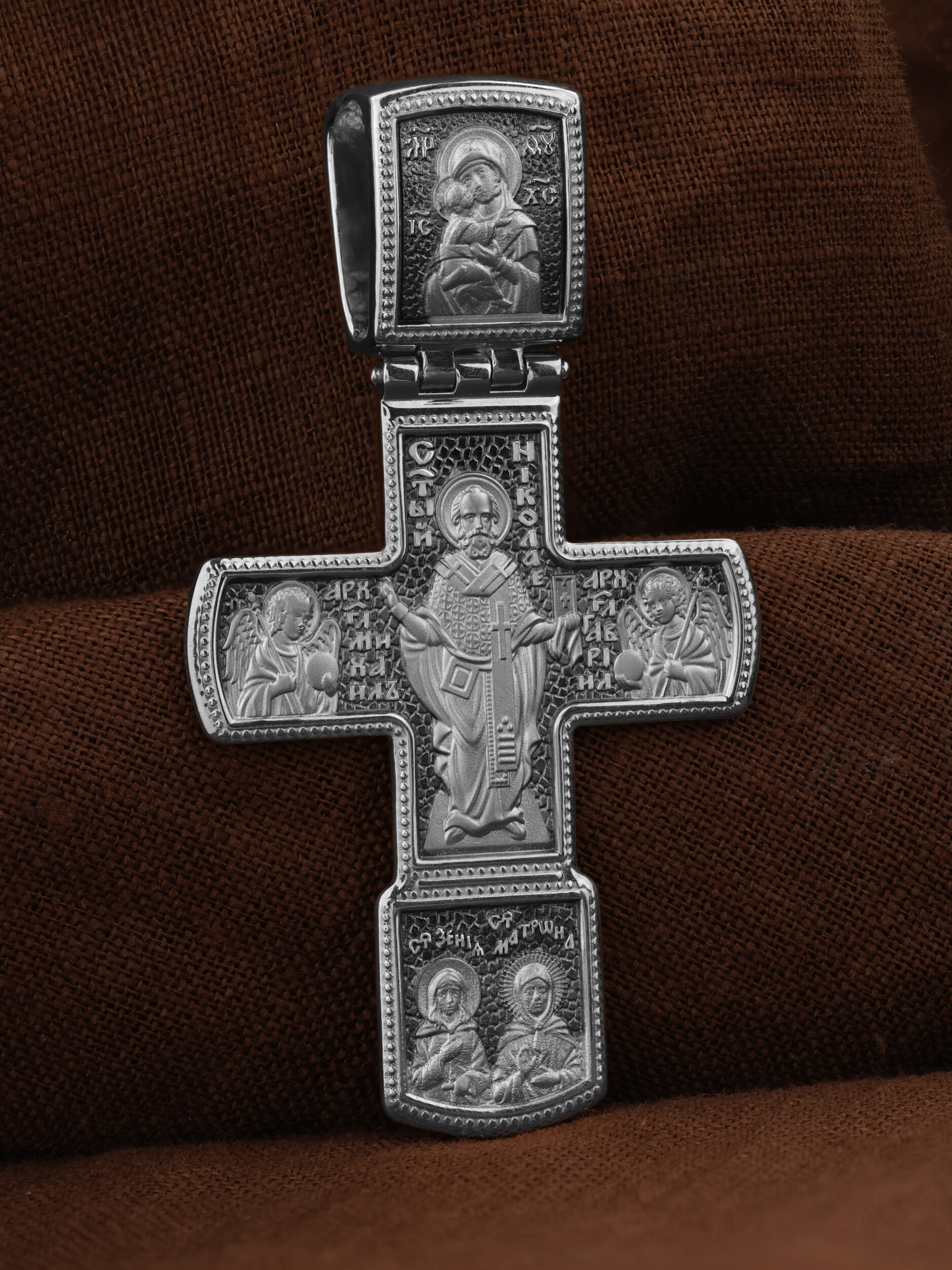 В центре на обороте — самый почитаемый в Православной Церкви святой, Николай Чудотворец, которого еще называют Николай Угодник за то, что он угодил своей жизнью Богу. Ему молятся, отправляясь в путешествие, особенно по морю, просят исцеления в различных недугах, помощи в торговых делах, учебе и поисках достойного супруга. С двух сторон от Николая Чудотворца помещены образы архангелов Михаила и Гавриила. Вверху — Владимирская икона Божией Матери — самая великая русская святыня, многие века бывшая олицетворением нашей земли. Перед ней венчались на царство государи, избирались патриархи. Пречистой Богородице Владимирской клялись в верности Отечеству солдаты и за нее умирали на поле брани. Именно на ее защиту более всего уповала Россия в самые страшные периоды своей истории. В нижнем клейме — иконы двух святых помощниц от всех недугов, блаженных Ксении Петербургской и Матроны Московской.