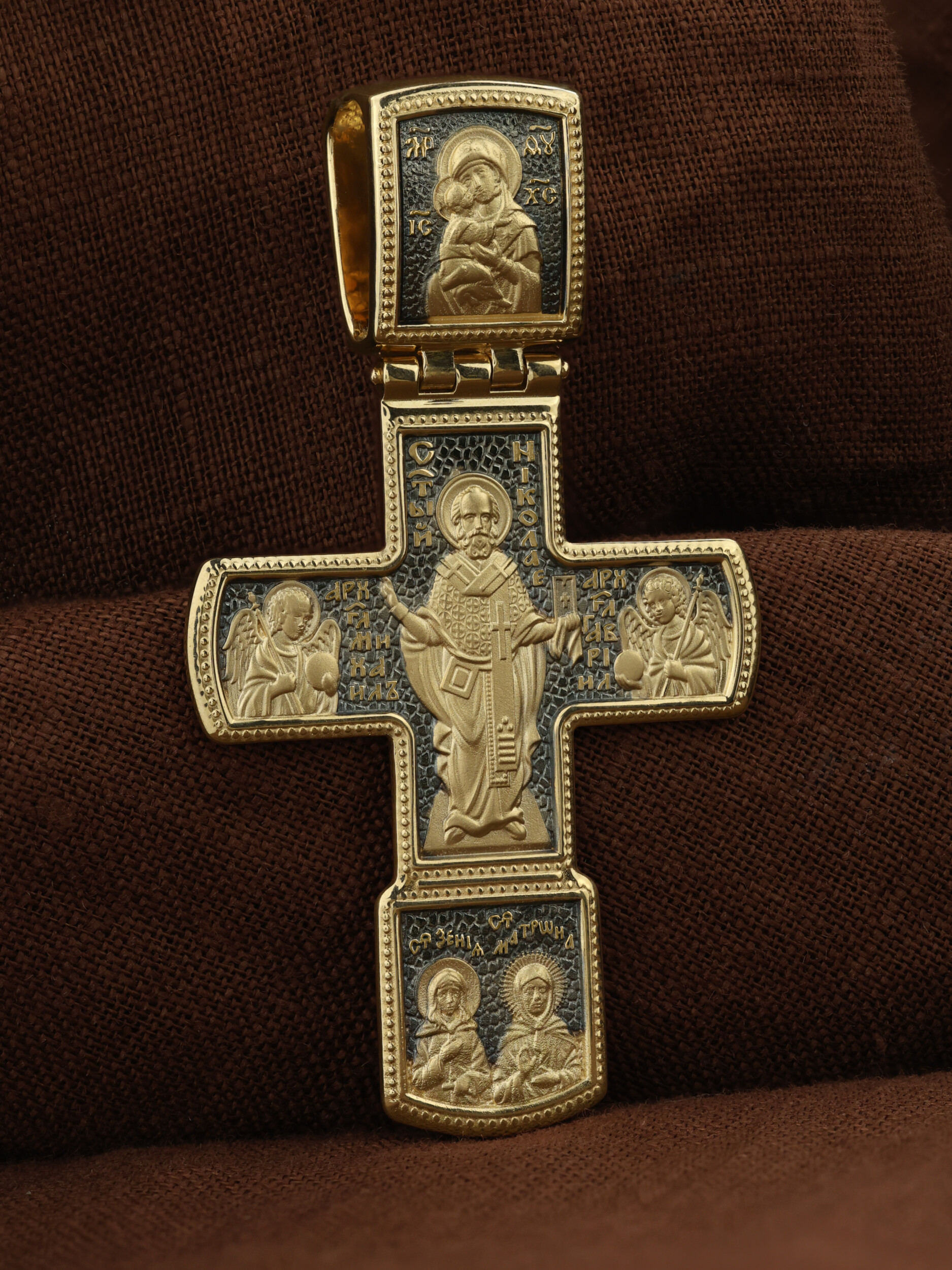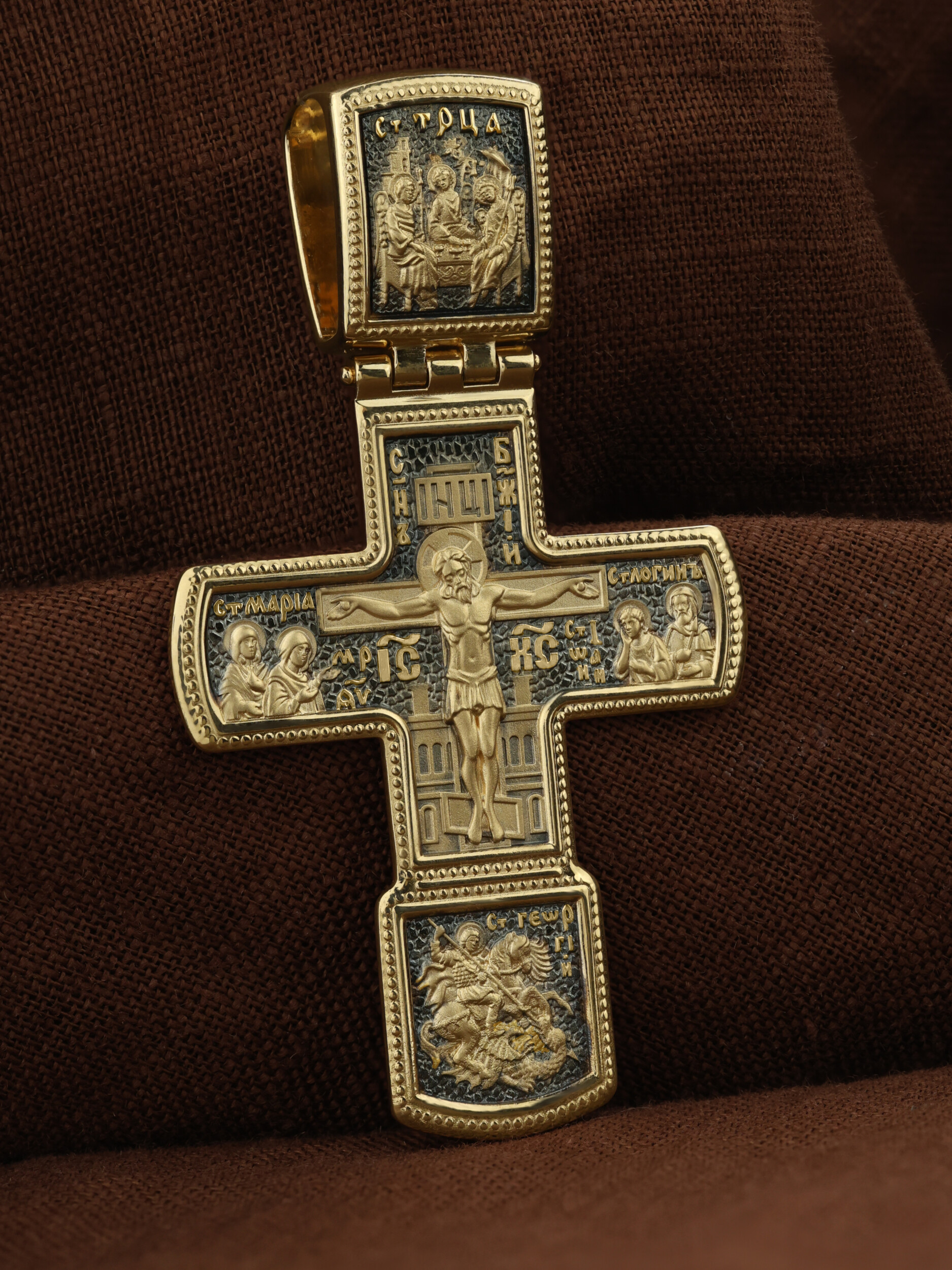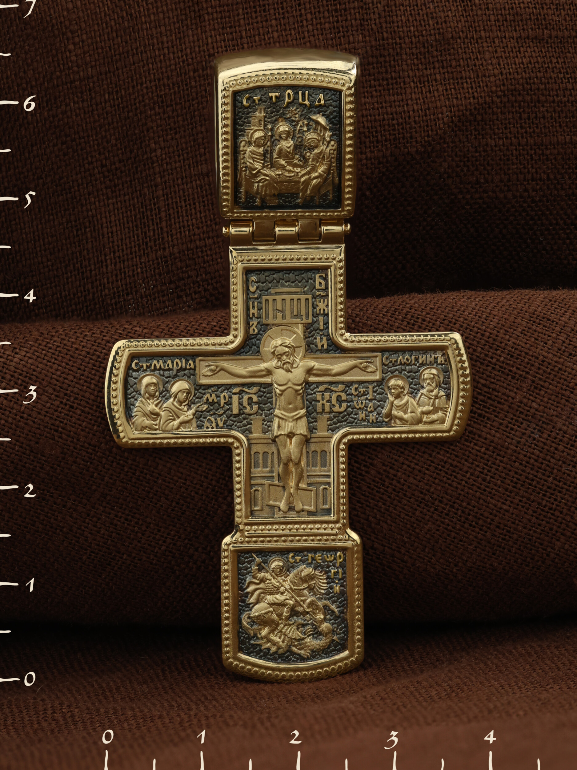 На кресте изображено Распятие Господа нашего Иисуса Христа. Ему предстоят Святая Мария Магдалина, Пресвятая Богородица, апостол Иоанн и Святой Иосиф, свидетели крестных страданий Господа. Вверху — икона Святой Троицы, на которой запечатлено явление Триединого Бога праотцу Аврааму в виде трех ангелов. В нижнем клейме изображено Чудо Святого Георгия о змие. Великомученик Георгий почитается как покровитель воинов, защитник от злых сил, помощник в духовной борьбе.