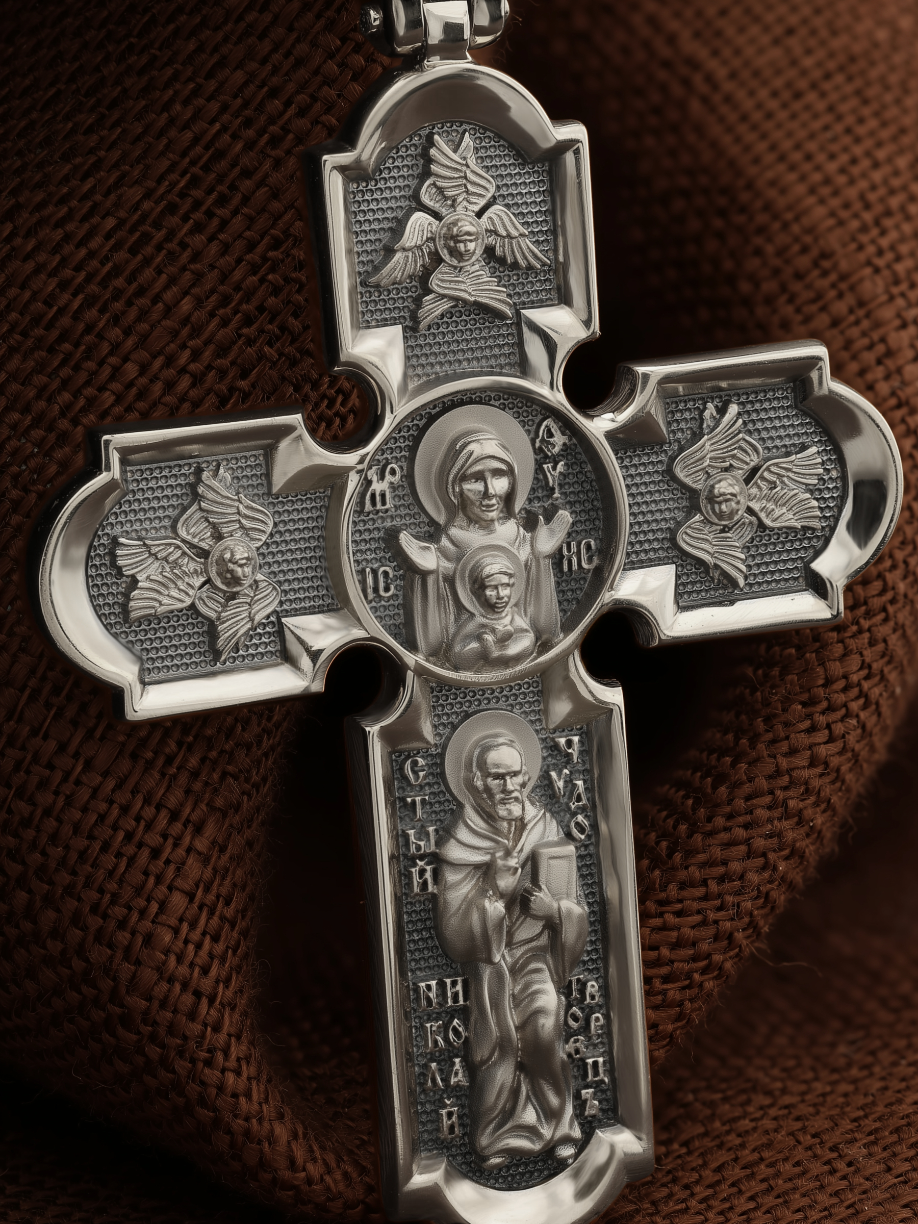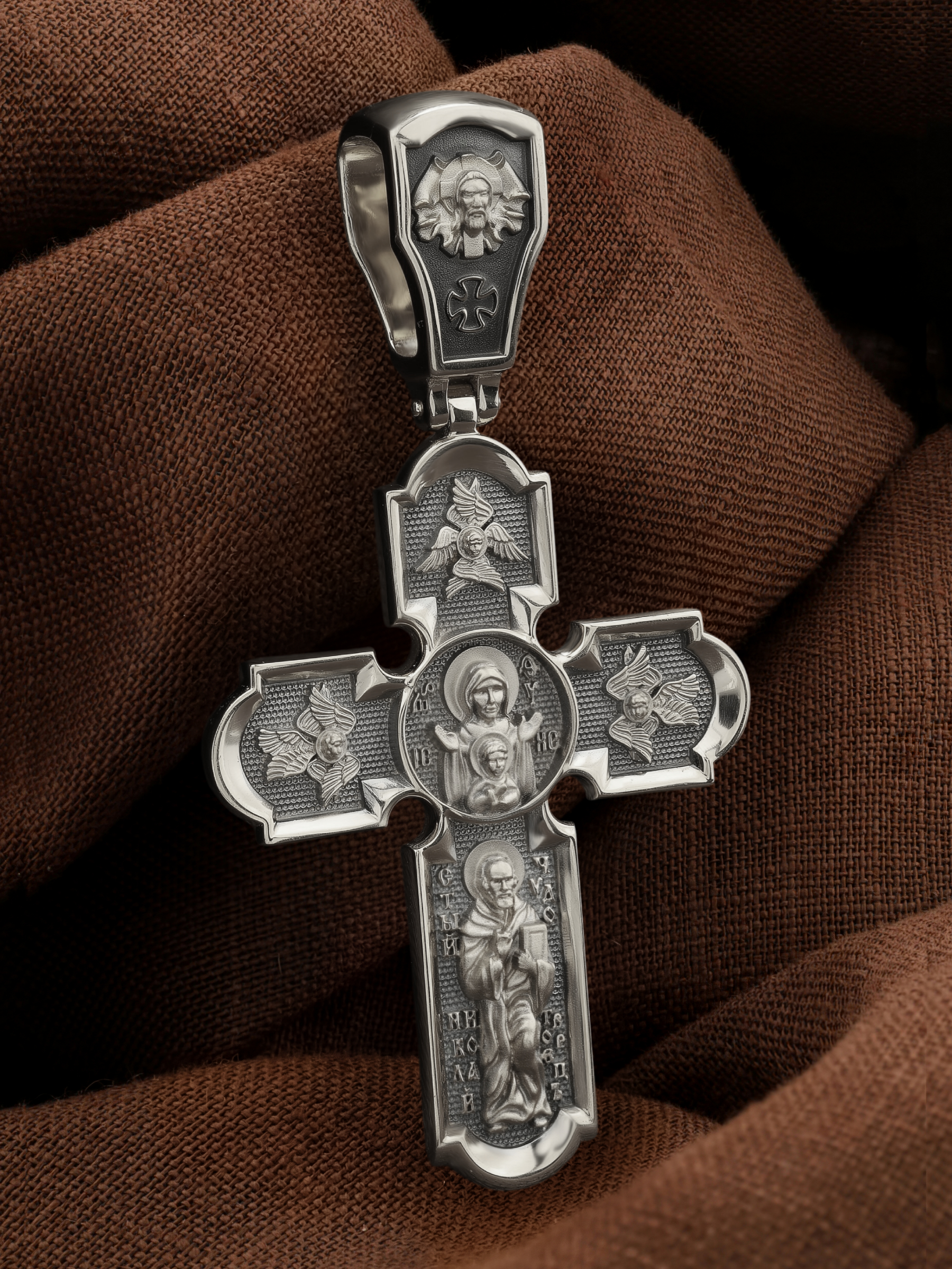 У основания креста в полный рост изображен самый любимый святой Православной Церкви — Николай Чудотворец. Святой почитается как целитель болезней, покровитель путешествующих, особенно по морю, помощник в торговле, учебе, а также в поисках достойного супруга.