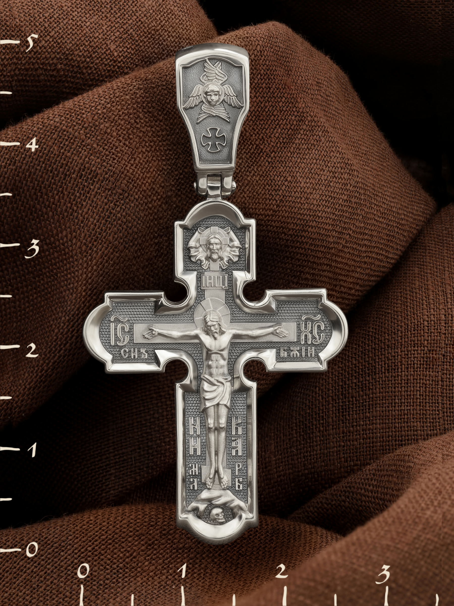 На лицевой стороне нательного креста по традиции изображено Распятие Господа нашего Иисуса Христа. Крест Господень стоит на небольшом каменистом возвышении, символизирующем гору Голгофу, которая обозначена буквами МЛРБ (Место Лобное Рай Бысть). Над головой Господа на поперечной перекладине написано «ИНЦИ», что символизирует табличку, которая была прибита к Кресту, с надписью «Иисус Назорей Царь Иудейский». Этим иудеи хотели посмеяться над Христом, не зная, что распинают истинного Царя всех царей. По сторонам основной перекладины расположены позолоченные рельефные инициалы Христа «ИС ХС». Под перекладиной, по сторонам древа, находится надпись «СЫН БОЖИЙ», а в основании креста — надпись «НИКА» (Победитель).