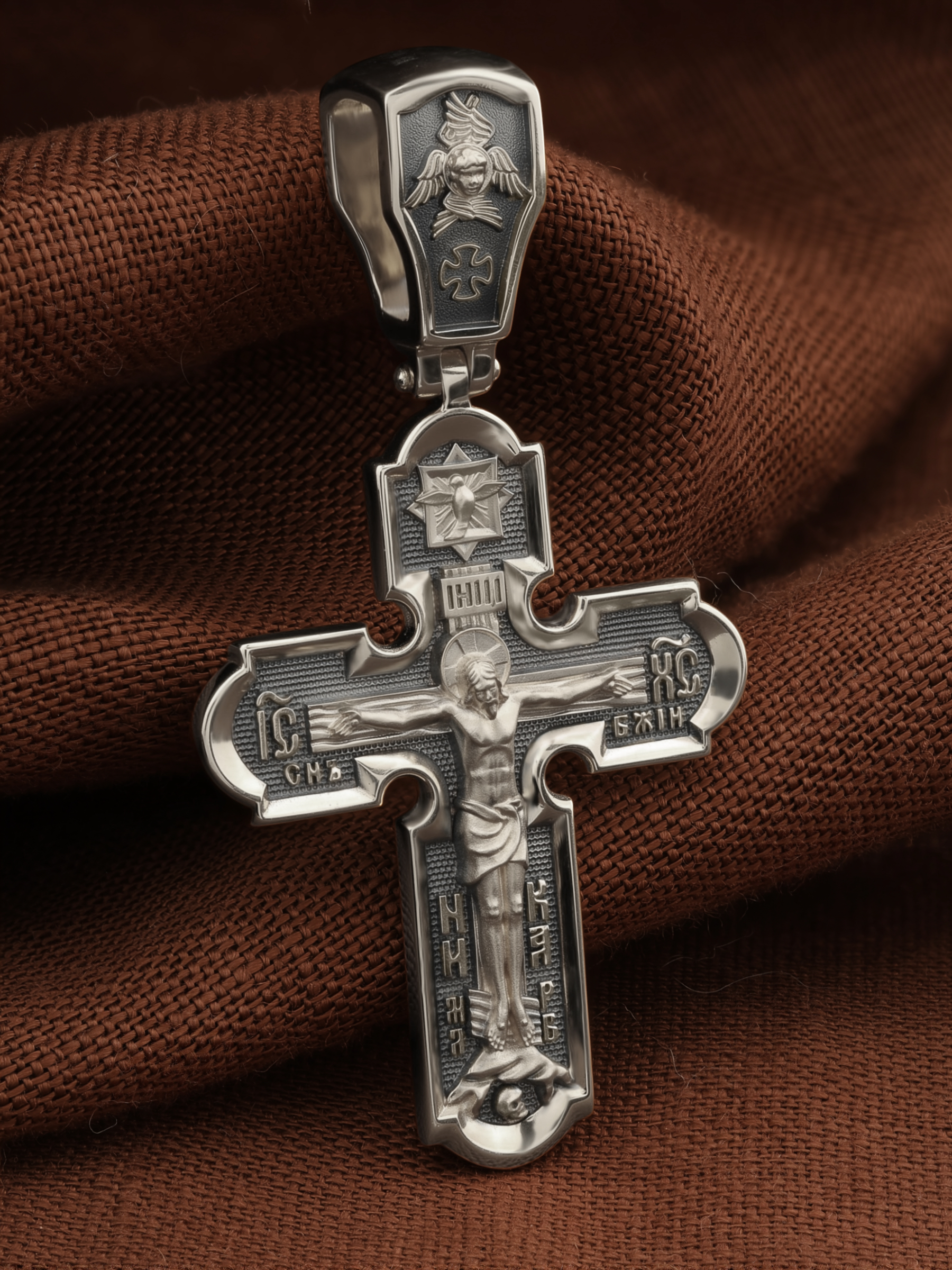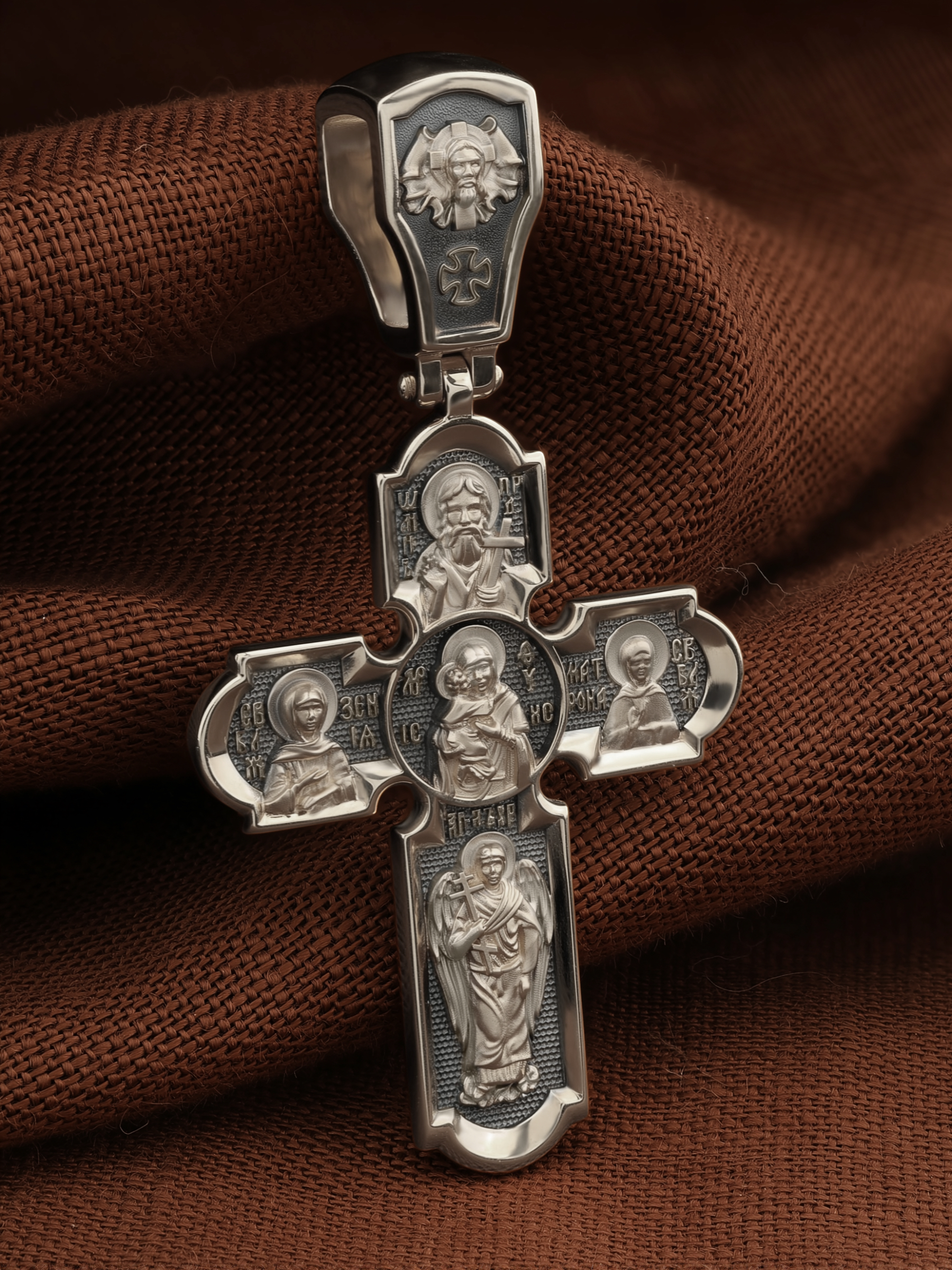 На кресте внизу изображен Ангел Хранитель, слева — Святая Блаженная Ксения, справа — Святая Блаженная Матрона, вверху — пророк, почитающийся в христианстве, Предтеча Господень Иоанн Креститель. На кулонном кольце помещено изображение Спаса Нерукотворного — образ Спасителя, который Он запечатлел на плате и передал для исцеления больному проказой царю Эдессы. Ему придается победное и защитное значение.