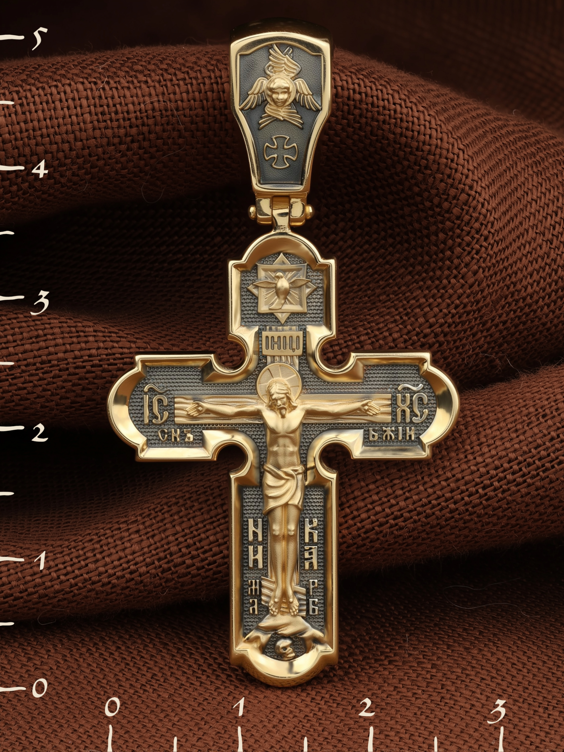 На кресте внизу изображен Ангел Хранитель, слева — Святая Блаженная Ксения, справа — Святая Блаженная Матрона, вверху — пророк, почитающийся в христианстве, Предтеча Господень Иоанн Креститель. На кулонном кольце помещено изображение Спаса Нерукотворного — образ Спасителя, который Он запечатлел на плате и передал для исцеления больному проказой царю Эдессы. Ему придается победное и защитное значение.