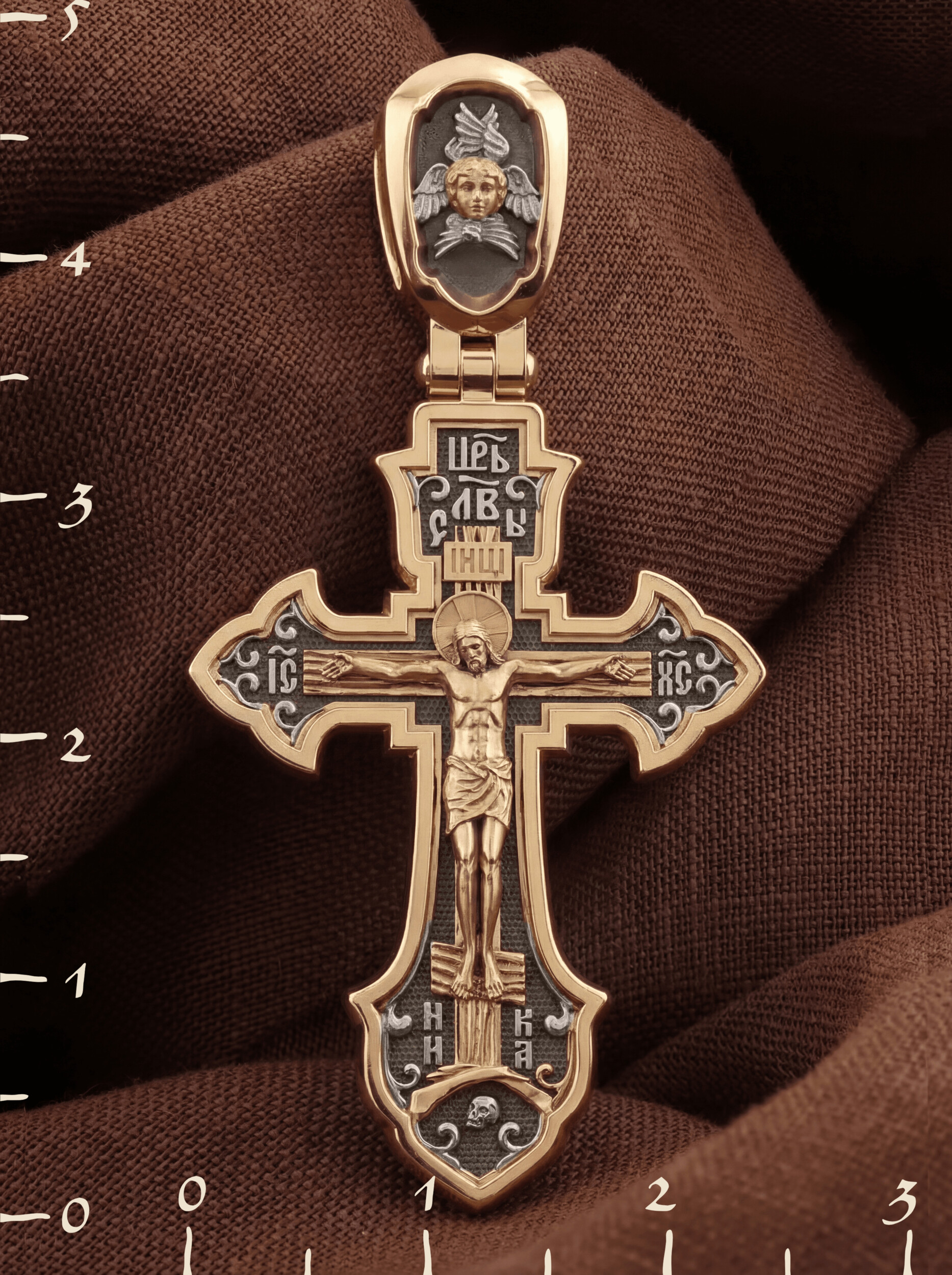 На лицевой стороне этого креста центральную часть занимает икона Распятия Христа — образ жертвы, принесенной Господом за грехи людей. Именно ко Христу, сошедшему на землю ради нашего спасения, возносятся все молитвы. Рядом с Его образом помещены слова — «НИКА» и «Царь Славы». Эти слова характеризуют Господа как Великого Архиерея, победителя смерти. Также Распятие сопровождается надписями, олицетворяющими Христа — это святое имя Христа «IC» (Иисус) «ХС» (Христос). Венчает лицевую сторону креста надпись «Царь Славы». На кулонном кольце помещено изображение Спаса Нерукотворного.