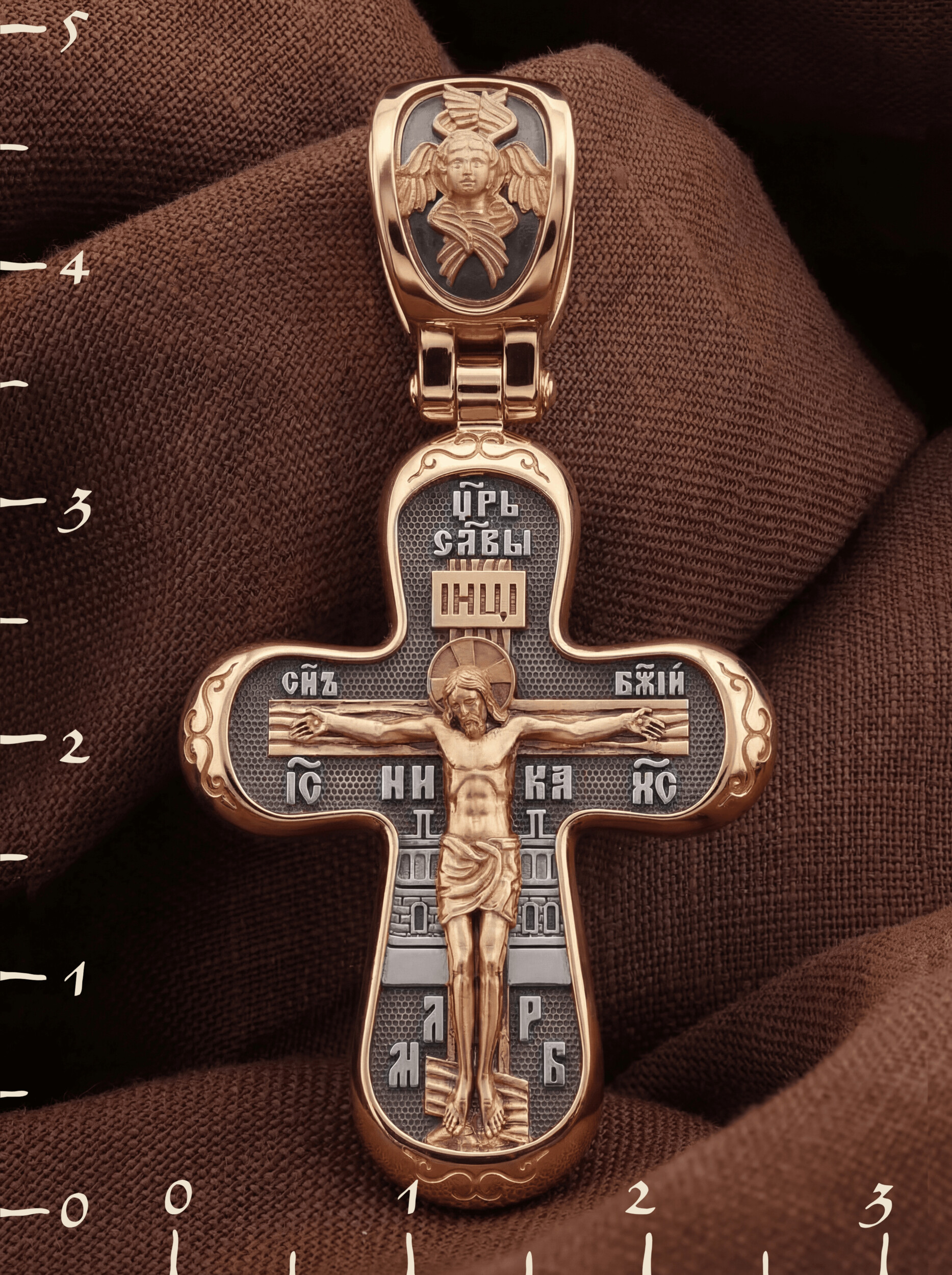 На обороте креста изображена икона Покрова Пресвятой Богородицы. Праздник Покрова Божией Матери является воспоминанием чуда, которое произошло во Влахнернской церкви 1 (14) октября 910 года: Пресвятая Богородица явилась верующим над алтарем храма и распростерла над ними Свое покрывало. В этот день Божья Матерь открыла людям, что Она является Ходатаицей за них перед Богом. Богородица простирает Свой молитвенный покров над всеми православными христианами и умоляет Сына Своего о даровании вечного спасения каждому человеку. На кулонном кольце изображен Спас Нерукотворный — Символ вочеловечившегося Божества и шестикрылый Серафим — самый приближенный к Господу Ангел.