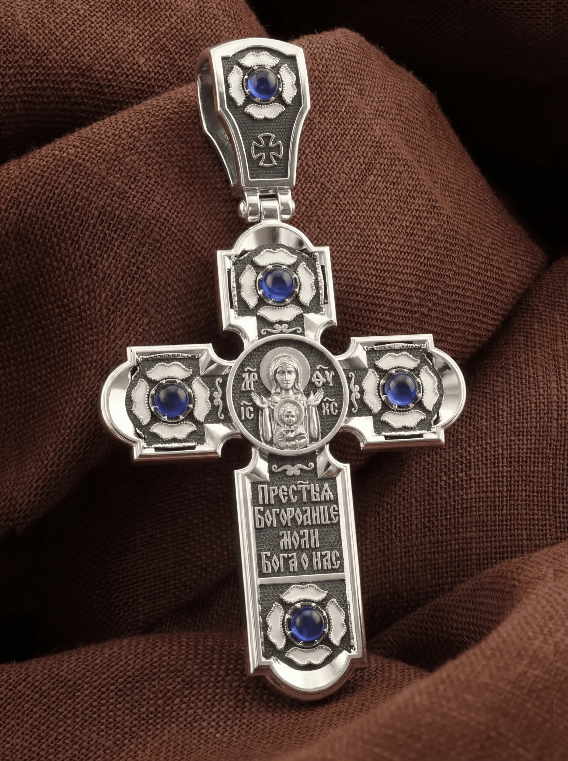 На оборотной стороне креста изображена икона Божией Матери «Знамение». Икона изображает Пресвятую Богородицу, молитвенно поднимающую Свои руки: на груди Ее, на фоне круглого щита, — благословляющий Божественный Младенец — Спас-Эммануил. Богоматерь изображена по пояс. Иконы Божией Матери, известные под именем «Знамение», появились на Руси в XI — XII веках, а называться так стали после чудесного знамения от Новгородской иконы, случившегося в 1170 году. Многочисленные списки с иконы Знамения известны по всей России. Многие из них просияли чудесами в местных храмах и были наименованы по месту явления чудес.