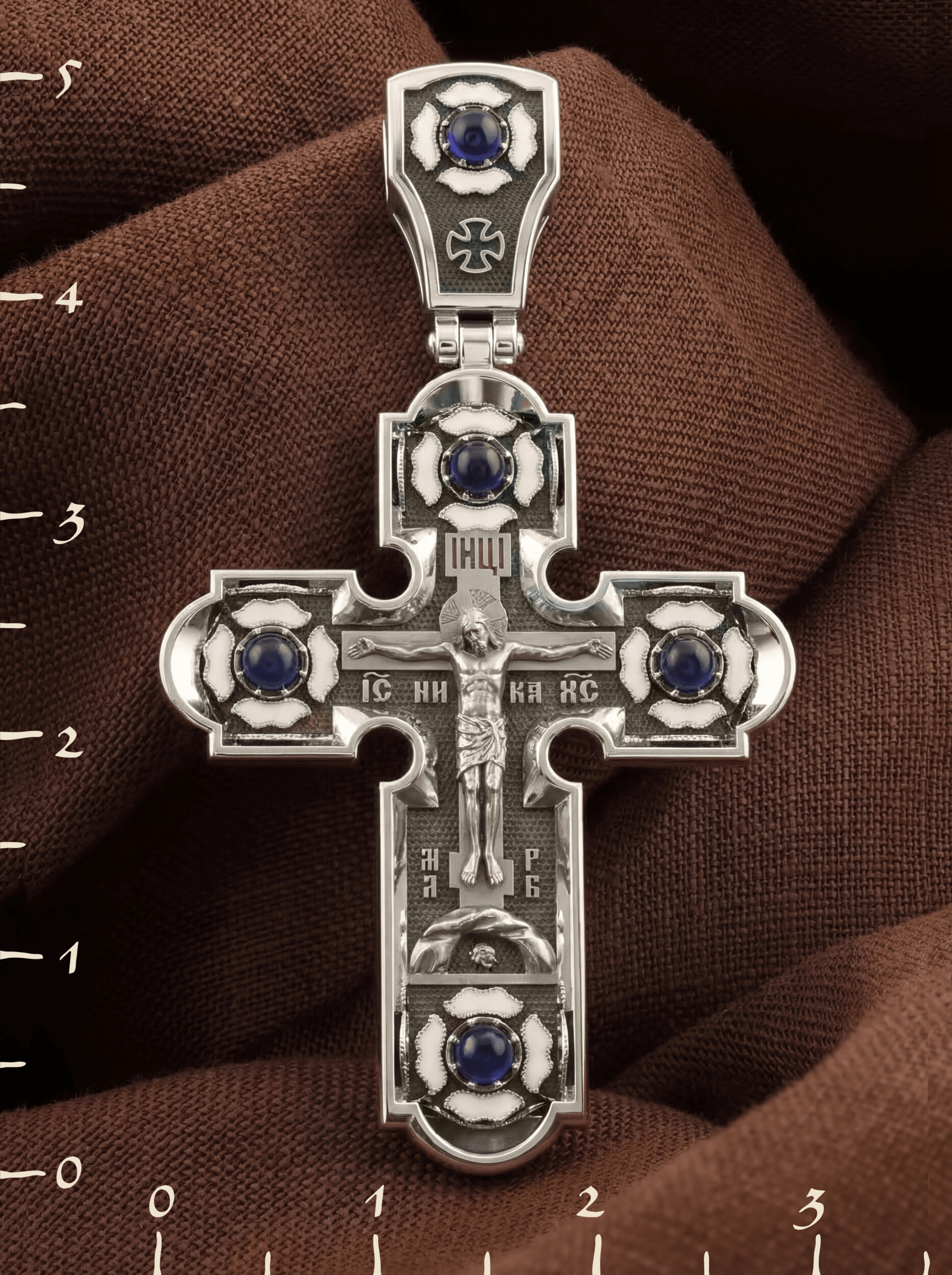 На лицевой стороне креста изображено Распятие Господа и Спасителя нашего Иисуса Христа. Христос, подвергнутый на кресте мучительной казни, своими страданиями искупил нас от древнего греха и даровал нам жизнь вечную. На верхней табличке, выше головы Иисуса, расположена надпись, составленная Понтием Пилатом — «IНЦI». Она означает «Иисус Назорей, Царь Иудейский». Надпись «IС» « ХС» означает Иисус Христос и слово «НИКА», что означает «победитель», помещаются на разных сторонах поперечной перекладины креста. В нижней части креста находится надпись «МЛРБ» — «место лобное рай бысть» означает, что место лобное стало раем. Крест стоит на горе камней, символизирующих Голгофу. Под подножием Креста изображена покоящаяся голова (череп) Адама, грехи которого Христос омыл Своею Кровью. Христос в Своей Божественной любви, над которой смерть не властна и которая, страдая, и не страдает в обычном смысле, простирает к людям со Креста Свои объятия, в которые призывается и привлекается весь мир.