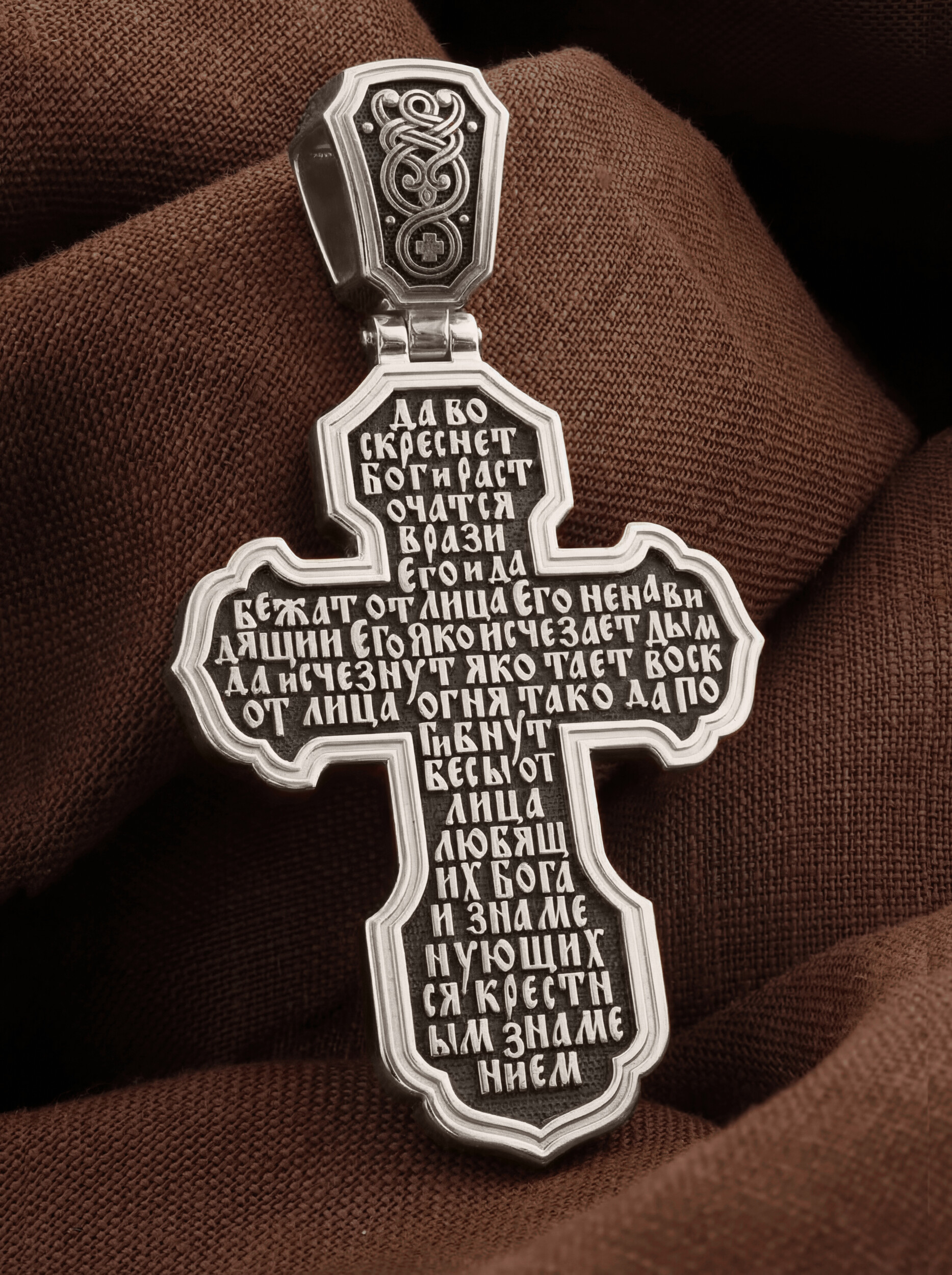 На оборотной стороне креста написана молитва Честному Кресту Господню: «Да воскреснет Бог, и расточатся врази Его, и да бежат от лица Его ненавидящии Его. Яко исчезает дым, да исчезнут; яко тает воск от лица огня, тако да погибнут беси от лица любящих Бога и знаменующихся крестным знамением…».