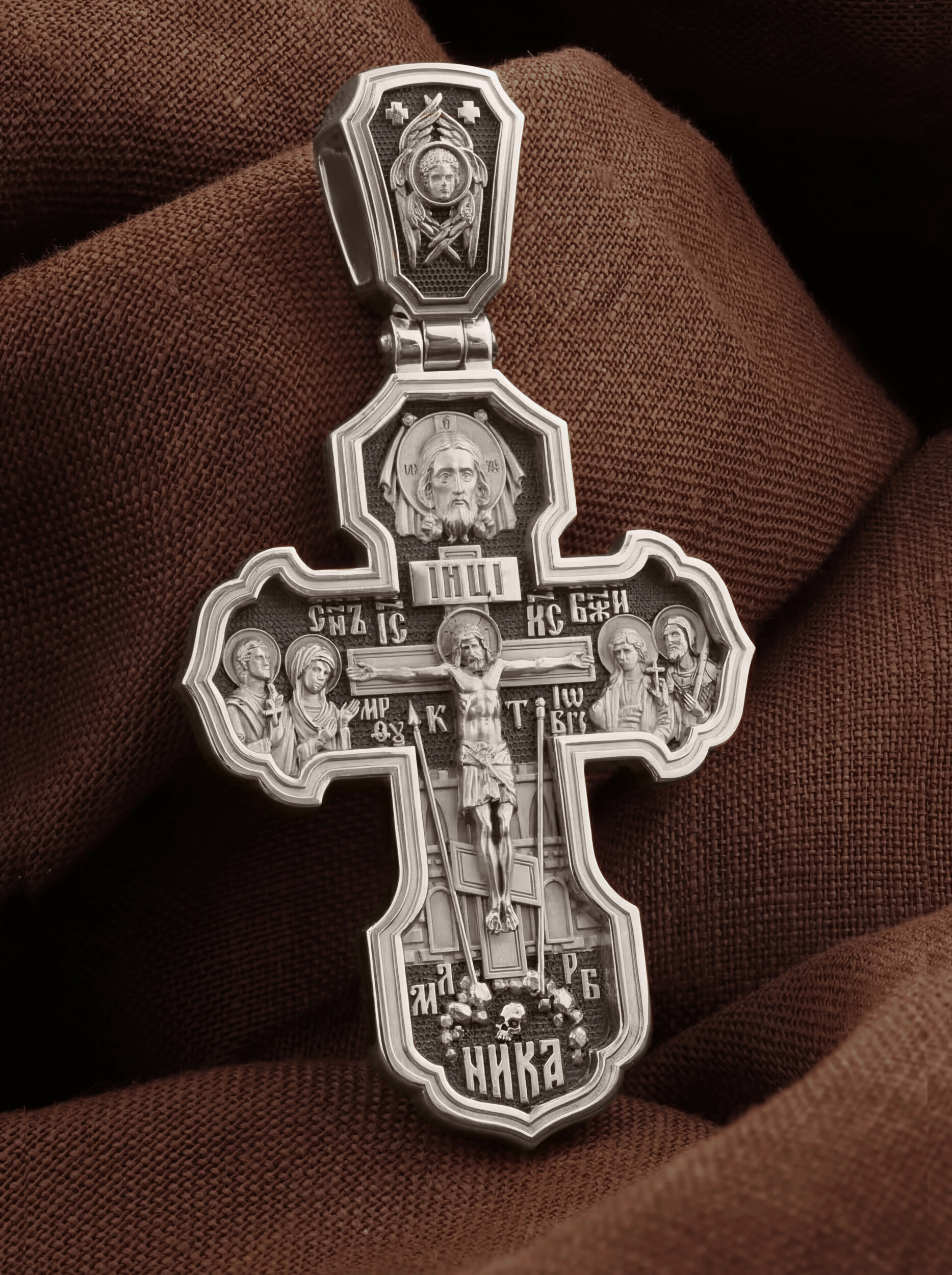 На лицевой стороне креста изображено Распятие Господа и Спасителя нашего Иисуса Христа. Крест- символ спасения и искупления рода человеческого, знамение победы над смертью и адом. Иисус Христос, как искупительная жертва освобождения человечества от власти греха, умер крестной смертью и в третий день воскрес. На верхней табличке, выше головы Иисуса, расположена надпись, составленная Понтием Пилатом — «IНЦI». Она означает «Иисус Назорей, Царь Иудейский». Надпись «IС» « ХС» означает Иисус Христос и помещается на разных сторонах поперечной (большой) перекладины креста. Рядом расположена надпись «Сын Божий». Выше Распятия изображен Нерукотворный образ Господа и Спасителя нашего Иисуса Христа. Слева от Распятия — Пресвятая Богородица и святая мироносица Мария Магдалина с крестом в руке. Справа — апостол и евангелист Иоанн Богослов, один из ближайших учеников Иисуса Христа и сотник Лонгин с крестом в правой руке и копьем — в левой. За крестом высится Иерусалимская стена. Крест стоит на горе камней, символизирующих Голгофу. В ее основании различается череп — это голова Адама. Вдоль креста изображены копие сотника Лонгина и трость с губкой и буквы «К» и «Т». Надпись «МЛРБ» — «место лобное рай бысть» означает, что место лобное стало раем и помещаются в нижней части креста. Рядом — слово «НИКА», что означает «победитель». На православном кресте Христос не умирает, а свободно простирает руки, ладони Иисуса открыты, будто он хочет обнять все человечество, даря им свою любовь и открывая путь к вечной жизни. На кулонном кольце изображен шестикрылый Серафим.