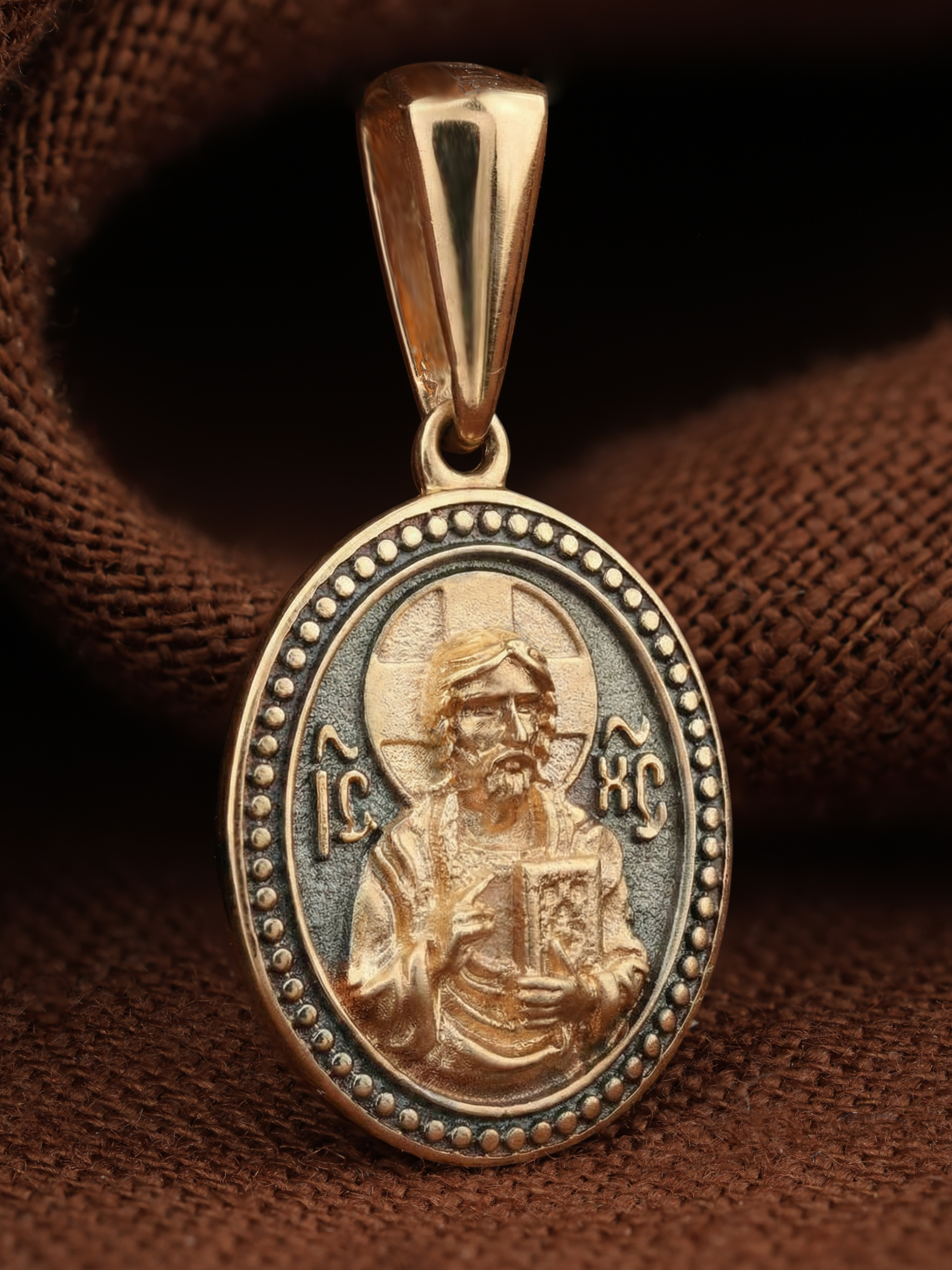 На лицевой части образка изображен Спас Вседержитель или Пантократор (от греч. «панратос» — всевластный, всесильный) — центральный образ в иконографии Христа, представляющий Его как Небесного Царя и Судию. Господь правой рукой благословляет, а в левой держит Книгу Жизни, в которой для каждого человека есть своя страница.