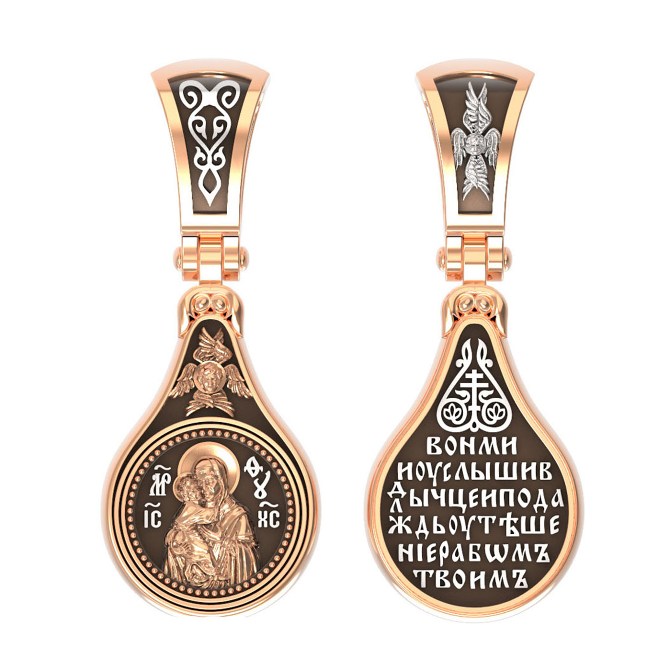 Лицевую сторону образка и кулонное кольцо украшает шестикрылый Серафим — самый приближенный к Господу Ангел.