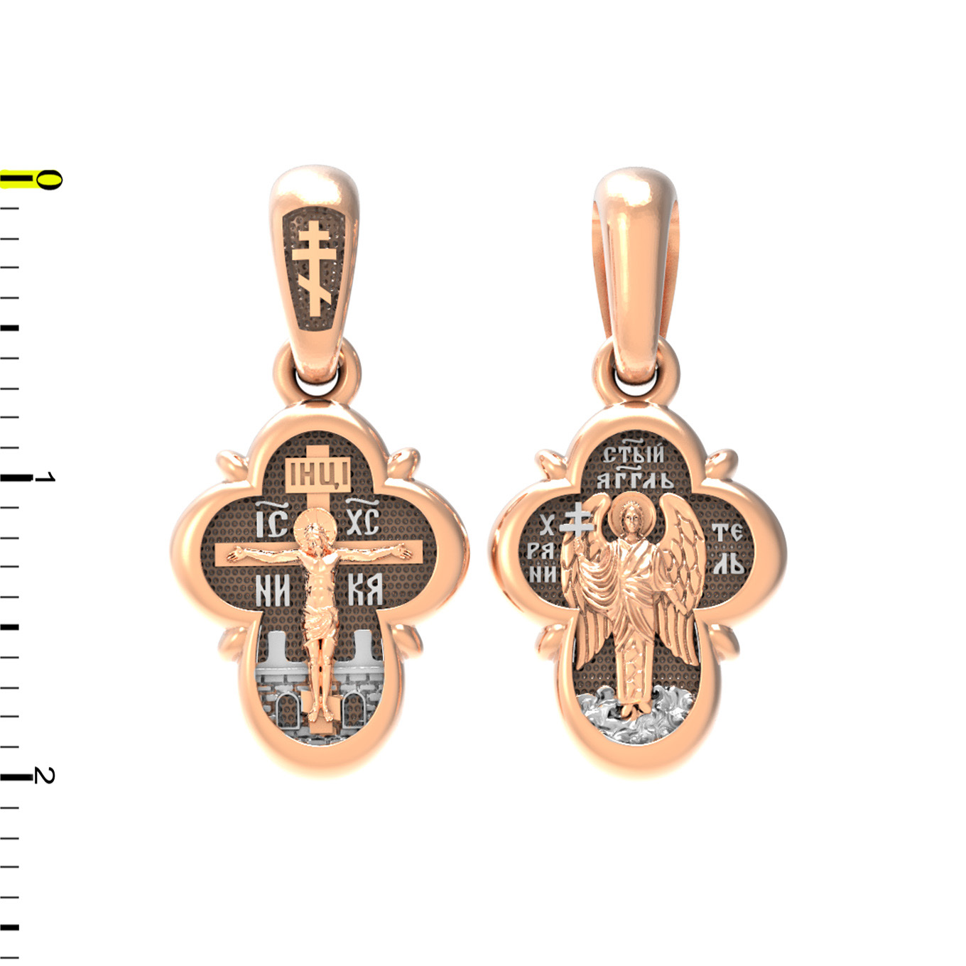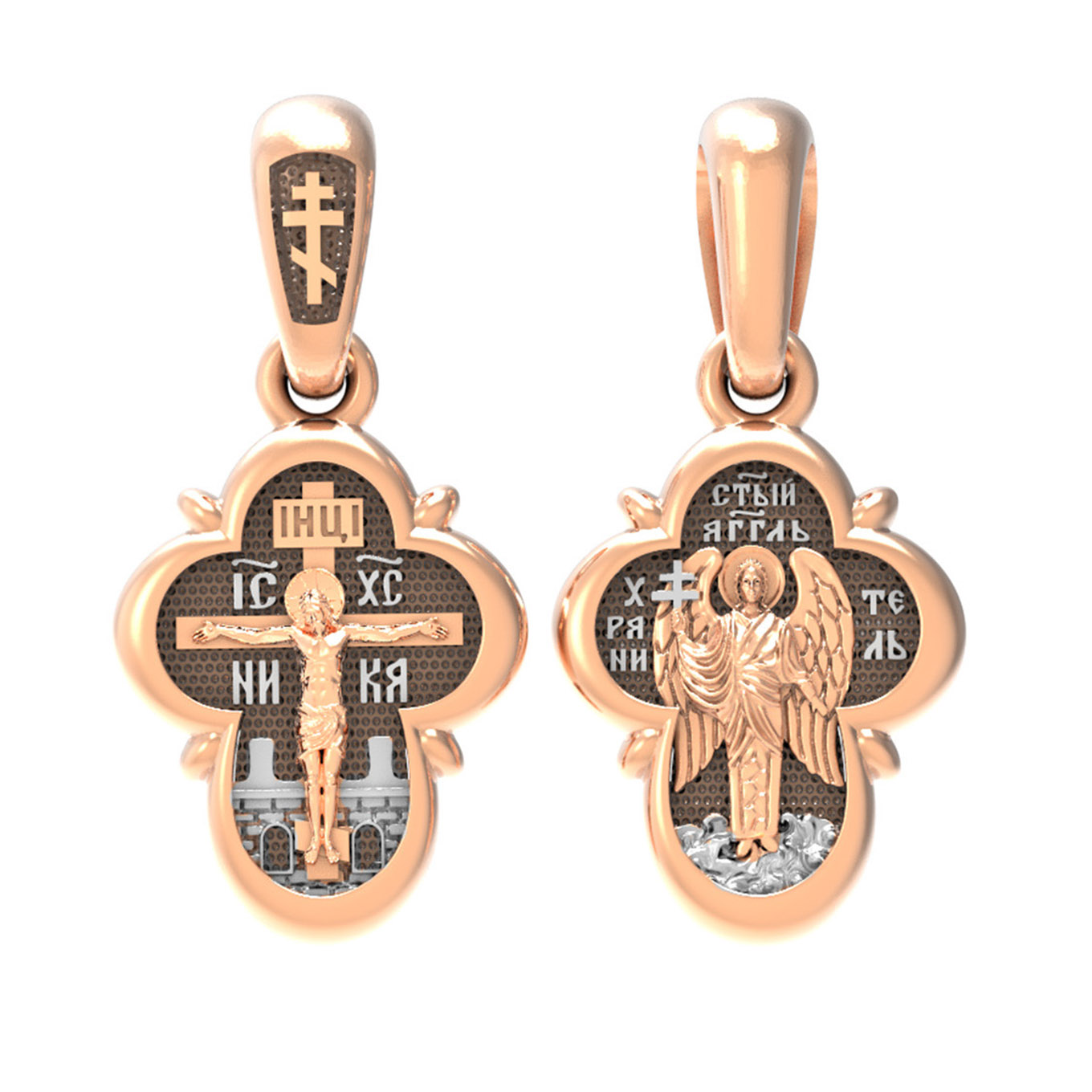 На оборотной стороне креста изображен Святой Ангел-Хранитель держащий в правой руке крест. Ангел-Хранитель — это Ангел приставляемый Богом к человеку при крещении для охраны и помощи в добрых делах. Он невидимо находится при человеке на протяжении всей его жизни, если человек сохраняет в себе любовь к Богу и истинную веру перед Ним. Ангел-Xранитель делают для нас все, что служит к истинному нашему благу и спасению. Невидимо пребывая при нас постоянно, он, руководствуя нас ко спасению, не только по нашему желанию таинственно наставляет нас на все доброе и полезное, не только возносит наши молитвы к Богу, но еще и сам от себя охраняют и защищают нас от врагов видимых и невидимых и ходатайствует за нас пред Богом. Ангел-Хранитель так любит нас, как никто на земле любить не может. Одного лишь каждому из нас он желает — спасения души; к этому он направляет все свои заботы.