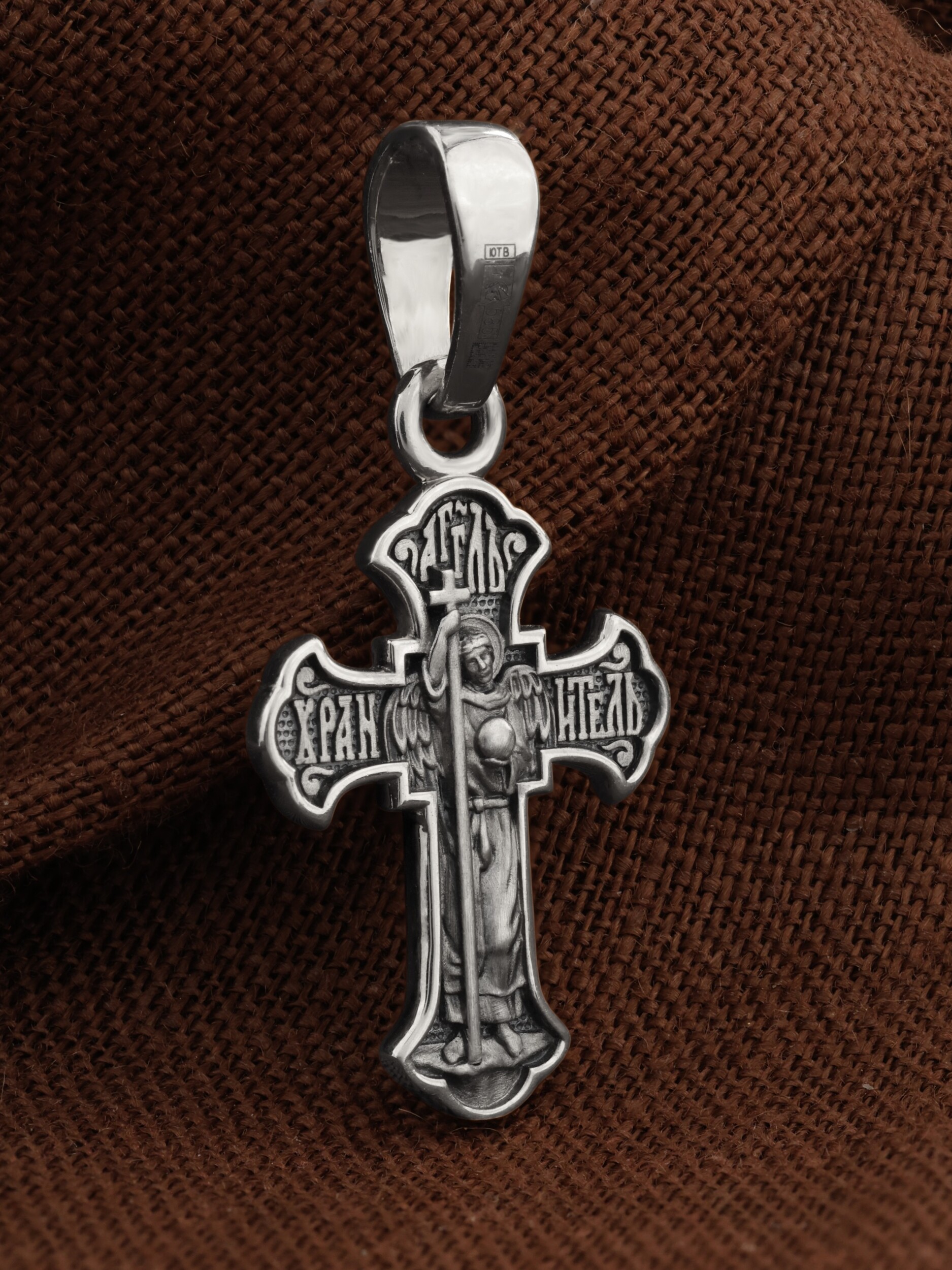 На оборотной стороне креста изображен святой Ангел-Хранитель в виде прекрасного юноши держащего в правой руке крест, а в левой — сферу. Ангел-Хранитель — это Ангел приставляемый Богом к человеку при крещении для охраны и помощи в добрых делах. Невидимо пребывая при нас постоянно, он, руководствуя нас ко спасению, не только по нашему желанию таинственно наставляет нас на все доброе и полезное, не только возносит наши молитвы к Богу, но еще и сам от себя охраняют и защищают нас от врагов видимых и невидимых, ходатайствует за нас пред Богом.