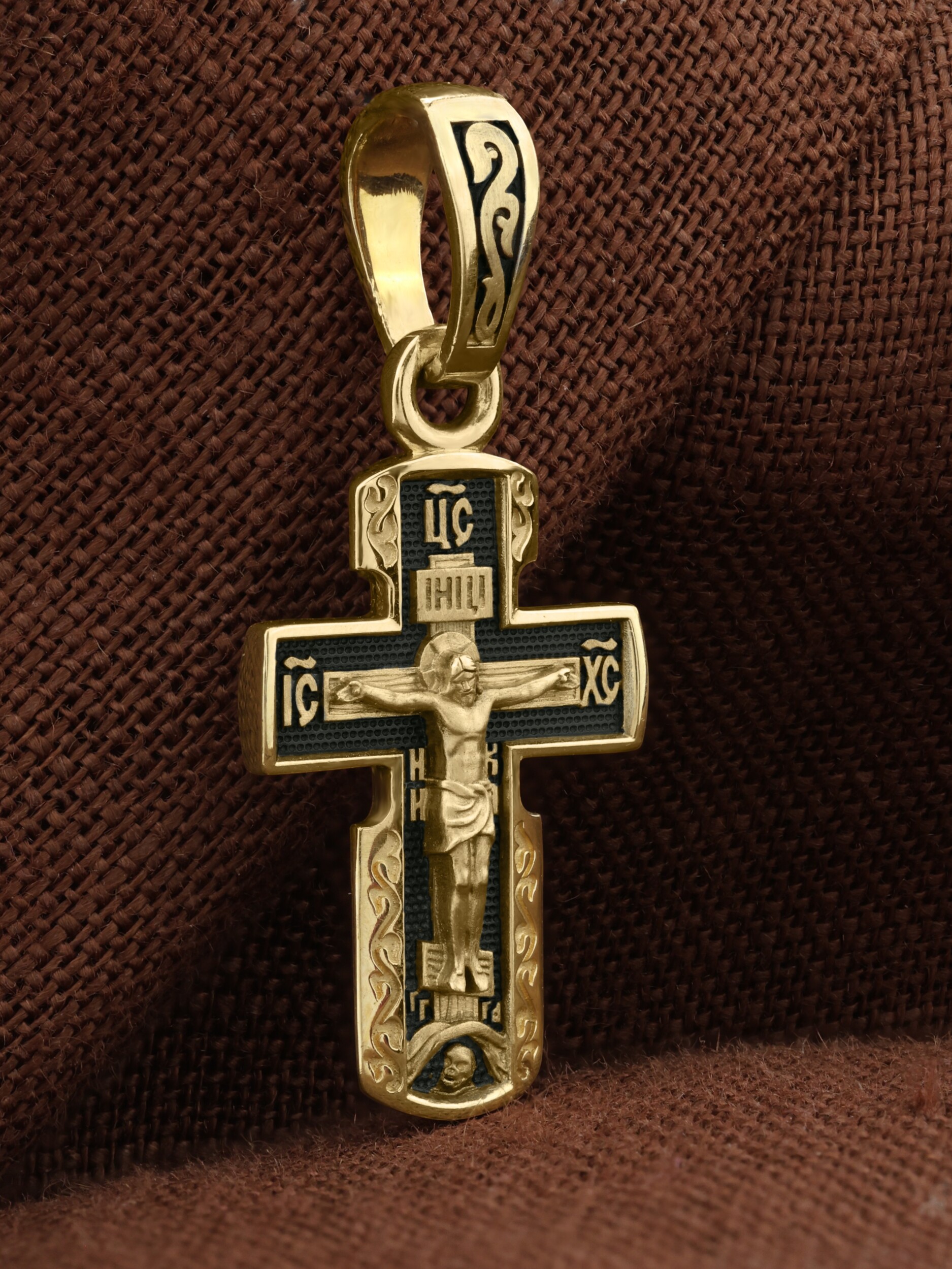 На лицевой стороне креста изображено Распятие Господа и Спасителя нашего Иисуса Христа, отдавшего Себя на смерть, для искупления грехов мира. Крест является символом жертвенной любви Всеблагого Бога к падшим людям, всепобеждающим духовным оружием христиан, основанием и средоточием церковной жизни. Над вершиной Распятия помещена надпись «Царь Славы». На верхней перекладине расположена надпись «IНЦI». Она символизирует титло — табличку, на которой, согласно Евангелию, было начертано: Иисус Назорей, Царь Иудейский. Надпись «IC» «ХC», означает Иисус Христос, помещаются на разных сторонах поперечной перекладины креста. Ниже помещена надпись «НИКА», что означает «победитель». Крест стоит на горе камней, символизирующих Голгофу. В ее основании различается череп и надписи «Г.А.» — голова Адама, «Г.Г.» — гора Голгофа.