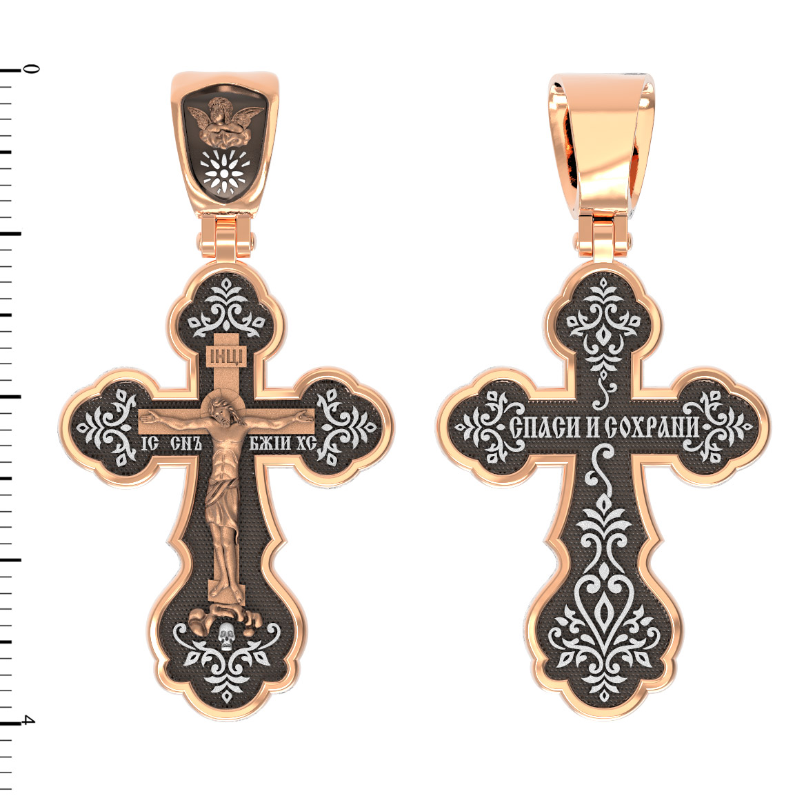 На лицевой стороне креста изображено Распятие Господа и Спасителя нашего Иисуса Христа. Христос, подвергнутый на кресте мучительной казни, своими страданиями искупил нас от древнего греха и даровал нам жизнь вечную. Крест означает своей вертикальной прямой линией справедливость и непреложность Божественных заповедей, прямоту Божией правды и истины, не допускающей никаких нарушений. Эта прямота пересекается главной поперечной перекладиной, означающей любовь и милость Божию к падшим и падающим грешникам, ради которой и был принесен в жертву Сам Господь, взявший на Себя грехи всех людей. На верхней табличке, выше головы Иисуса, расположена надпись, составленная Понтием Пилатом — «IНЦI». Она означает «Иисус Назорей, Царь Иудейский». Надпись «IС ХС» означает Иисус Христос и словосочетание «СЫН БОЖИЙ», что означает божественную природу Иисуса Христа, помещается на разных сторонах поперечной перекладины креста. Крест стоит на горе камней, символизирующих Голгофу. Под подножием Креста изображена покоящаяся голова (череп) Адама, грехи которого Христос омыл Своею Кровью. Христос в Своей Божественной любви, над которой смерть не властна и которая, страдая, и не страдает в обычном смысле, простирает к людям со Креста Свои объятия, в которые призывается и привлекается весь мир. Поэтому Тело Его не висит, а торжественно покоится на Кресте. Здесь Христос, распятый и умерший, удивительным образом жив в самой смерти Своей. На кулонном кольце изображен Ангел Херувим. Херувимы сияют всегда светом Богопознания, ведением таин и глубин премудрости Божией, сами просвещаемые и других просвещающие.