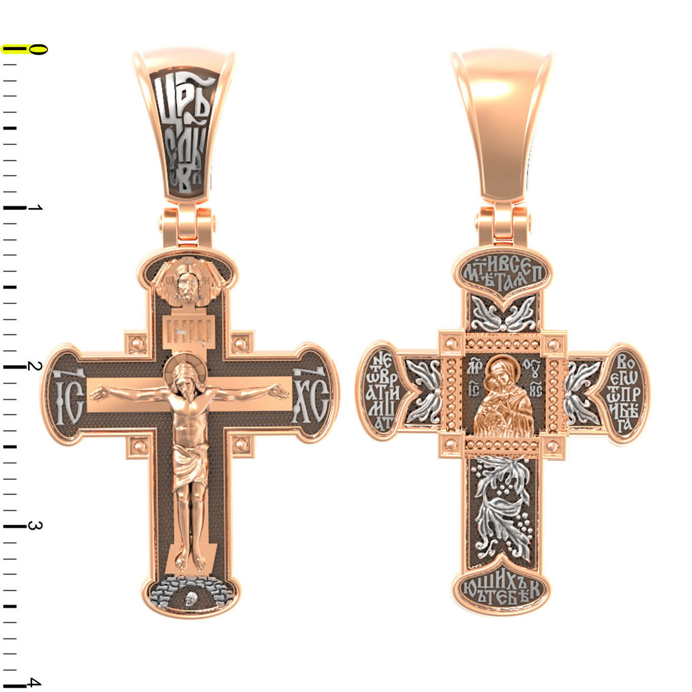 На лицевой стороне креста изображено Распятие Господа и Спасителя нашего Иисуса Христа, отдавшего Себя на смерть, для искупления грехов мира. Крест является символом жертвенной любви Всеблагого Бога к падшим людям, всепобеждающим духовным оружием христиан, основанием и средоточием церковной жизни. Господь сказал: «кто хочет идти за Мною, отвергнись себя, и возьми крест свой, и следуй за Мною». (Мк. 8: 34). На кулонном кольце помещена надпись «Царь Славы». На верхней табличке, выше головы Иисуса, расположена надпись, составленная Понтием Пилатом — «IНЦI». Она означает «Иисус Назорей, Царь Иудейский». Над ней — Нерукотворный образ Господа и Спасителя нашего Иисуса Христа, чудесно отпечатавшийся на плате, котором Христос вытер свой лик. Надпись «IC» «ХC», означает Иисус Христос, помещается на разных сторонах поперечной перекладины креста. Крест стоит на горе камней, символизирующих Голгофу. В ее основании различается череп– это голова Адама.