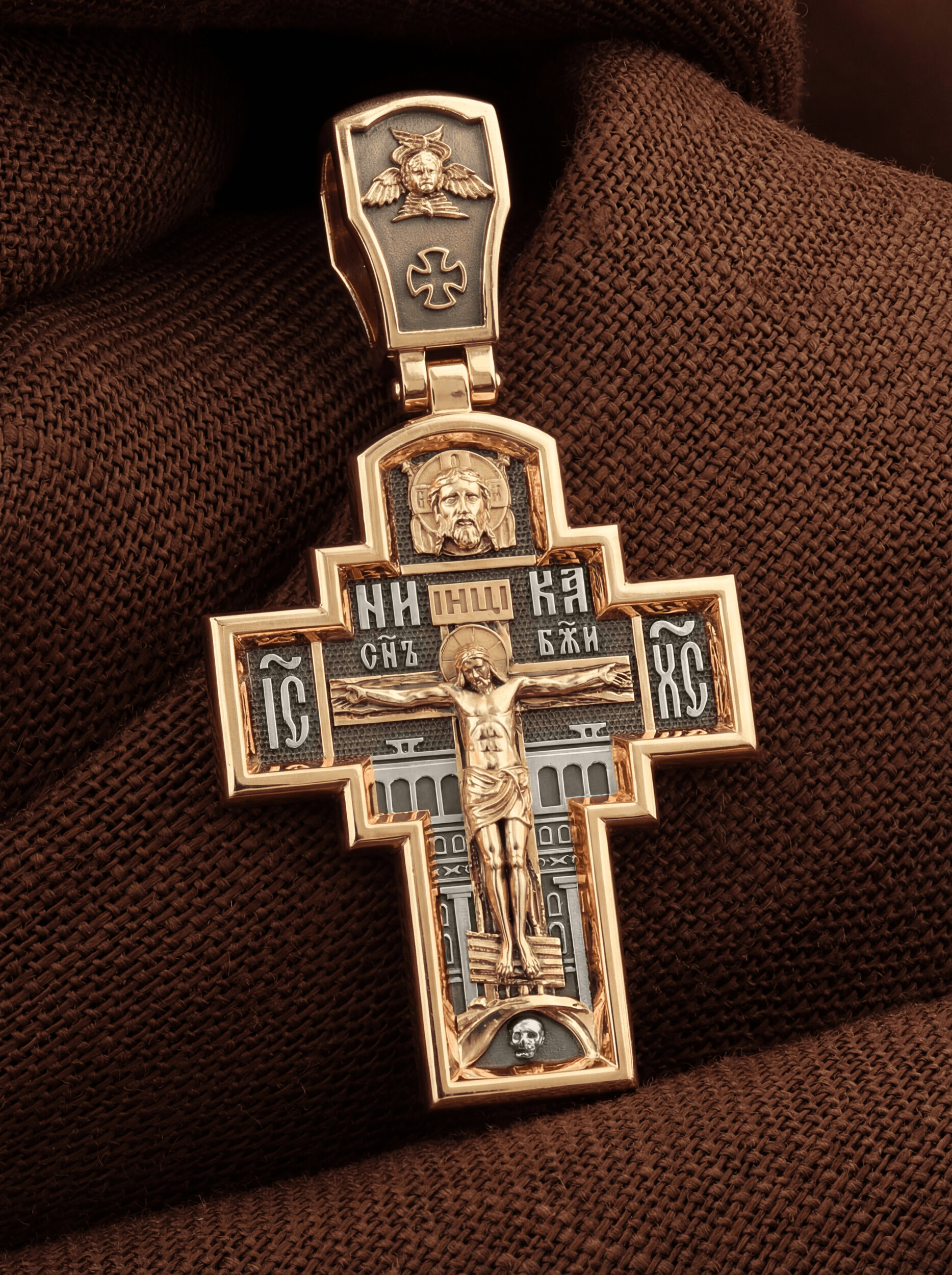Основной композицией лицевой стороны является Распитие Господа Иисуса Христа. Позади Распятия видна иерусалимская стена, знак того, что Господь был распят вне стен города. Но вместе с тем стена символизирует и Небесный Иерусалим, путь который открылся для человека через Голгофу. У подножья Господа в виде скалистой горки видна сама Голгофа с Главой Адамовой в пещере. Распятие сопровождается каноническими надписями. Это святое имя Христа, которое принято писать на иконах сокращенно — «ИС ХС», словосочетание «СЫН БОЖИЙ», что означает божественную природу Иисуса Христа, и надпись «НИКА» — «победитель». Над Распятием помещено изображение Спаса Нерукотворного — образ Спасителя, который Он запечатлел на плате и передал для исцеления больному проказой царю Эдессы.