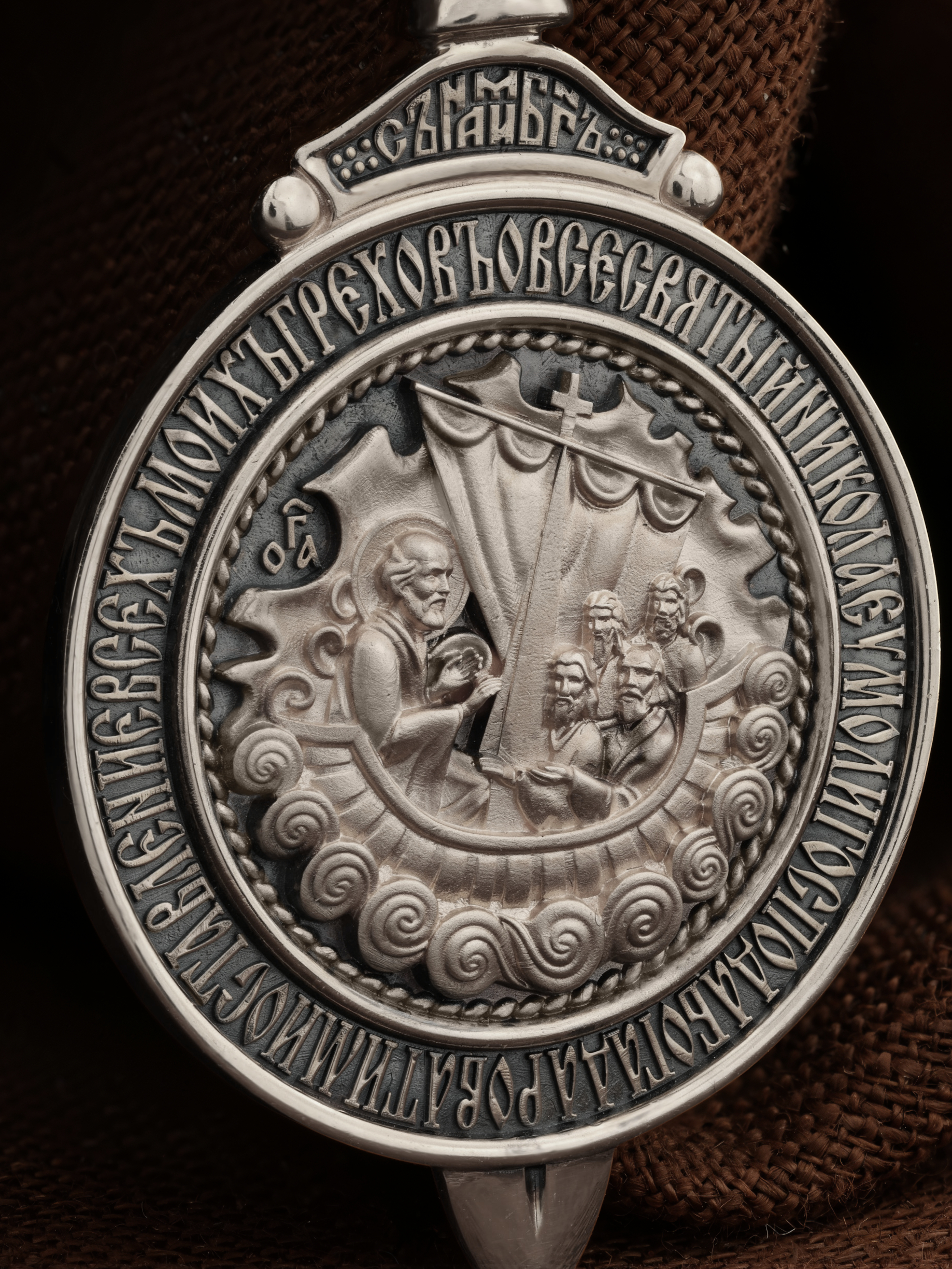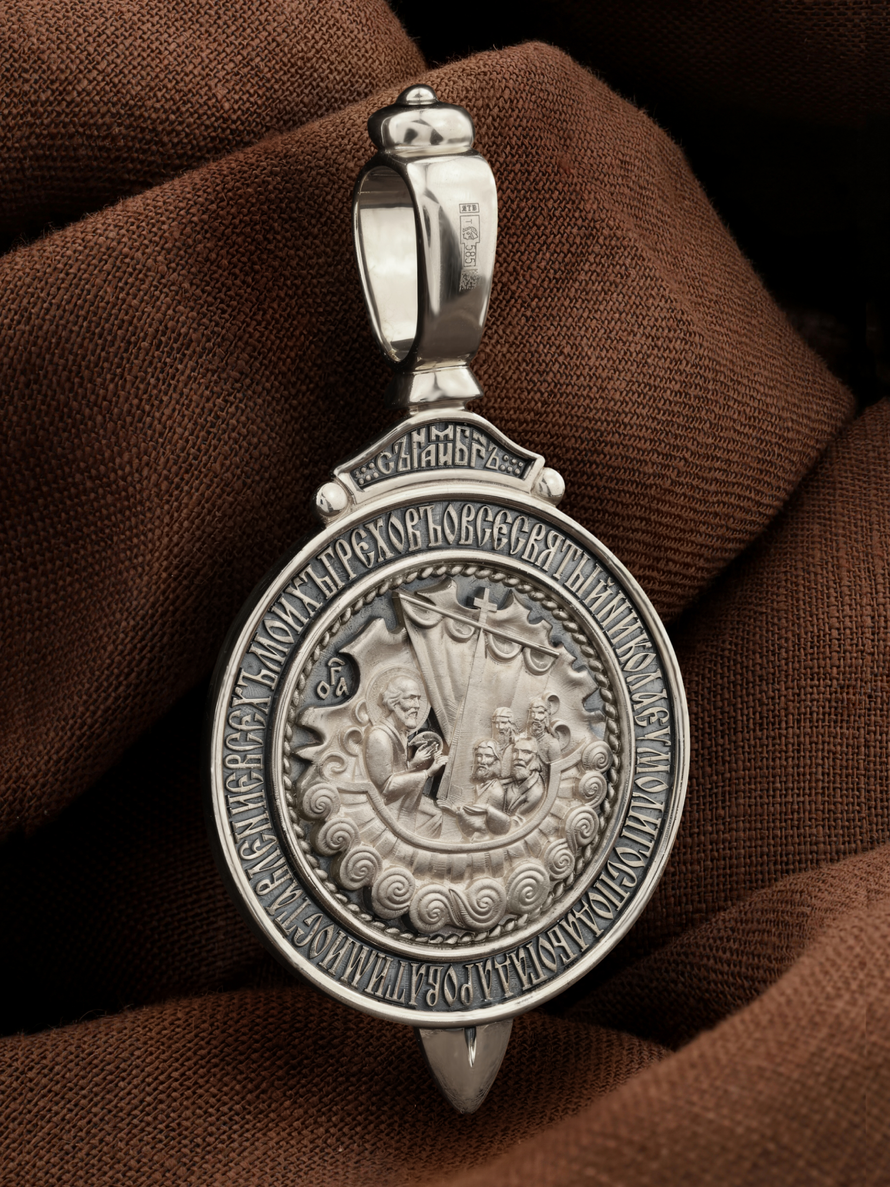 На оборотной стороне образка изображен Святитель Николай Чудотворец, архиепископ Мир Ликийских. Он является одним из самых почитаемых святых в православном мире, издревле считающийся помощником и молитвенником за всех, притекающих к нему. Вся жизнь святого Николая — это служение Богу. Чудес его исчислить невозможно. Одним из чудес было спасение Святым Угодником Николаем погибающих во время шторма моряков. Они никогда не видели епископа города Миры, но слышали о его чудесной помощи. В отчаянии они молитвенно воззвали к нему, и тот неожиданно появился на корме у руля и благополучно привел корабль в гавань. Этот сюжет изображен на образке и обрамлен словами молитвы: « О всесвятый Николае, умоли Господа Бога даровати ми оставление всех моих грехов».