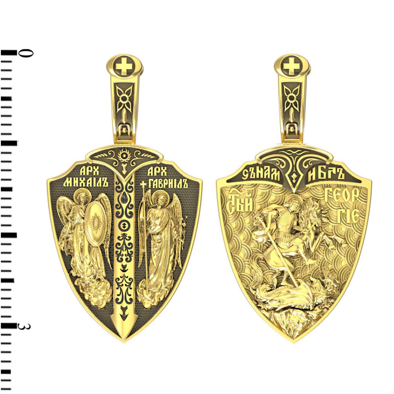 Основой композиции оборотной стороны является изображение Святого Георгия Победоносца. Святой Георгий один из наиболее почитаемых святых в Христианской Церкви. На Руси он известен как Юрий или Егорий, покровитель воинов. На образке изображено самое знаменитое чудо святого: спасение принцессы от змея, которому она предназначалась в жертву. Чудо это имеет символическое толкование. Принцесса означает душу человеческую, а змей — дьявола, желающего ее поглотить. Святой Георгий, небесный защитник, спускается с Небес, чтобы помочь душе избавиться от гибели. Образ святого воина венчают слова: «С нами Бог!». Они написаны у рукоятки меча, узорчатый клинок которого разделяет образок на две части. Сам образок имеет форму щита. Щит и меч — это символы духовной брани с дьяволом.