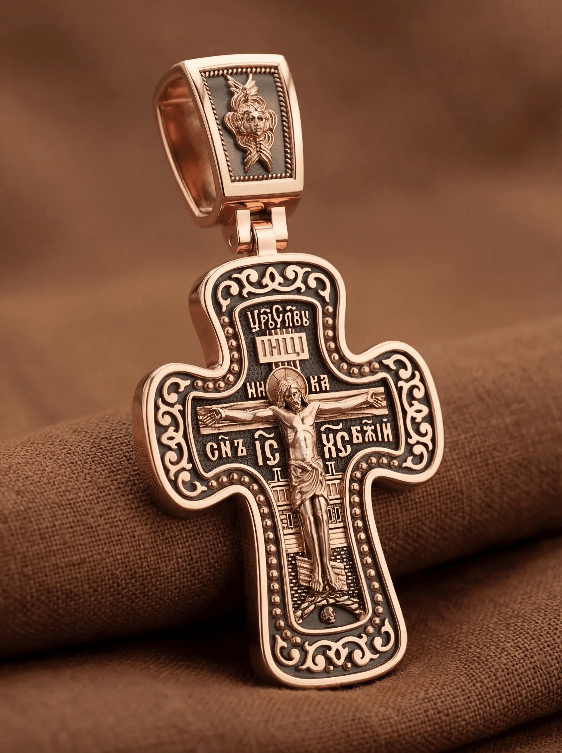 Распятие сопровождается каноническими надписями. Это святое имя Христа, которое принято писать на иконах сокращенно — «ИС ХС», словосочетание «СЫН БОЖИЙ», что означает божественную природу Иисуса Христа. Рядом с Его образом помещены слова «Царь Славы». Над головой Господа на поперечной перекладине аббревиатура «IНЦI», что символизирует табличку, которая была прибита к Кресту, с надписью «Иисус Назорей Царь Иудейский». На кулонном кольце помещено изображение Серафима.