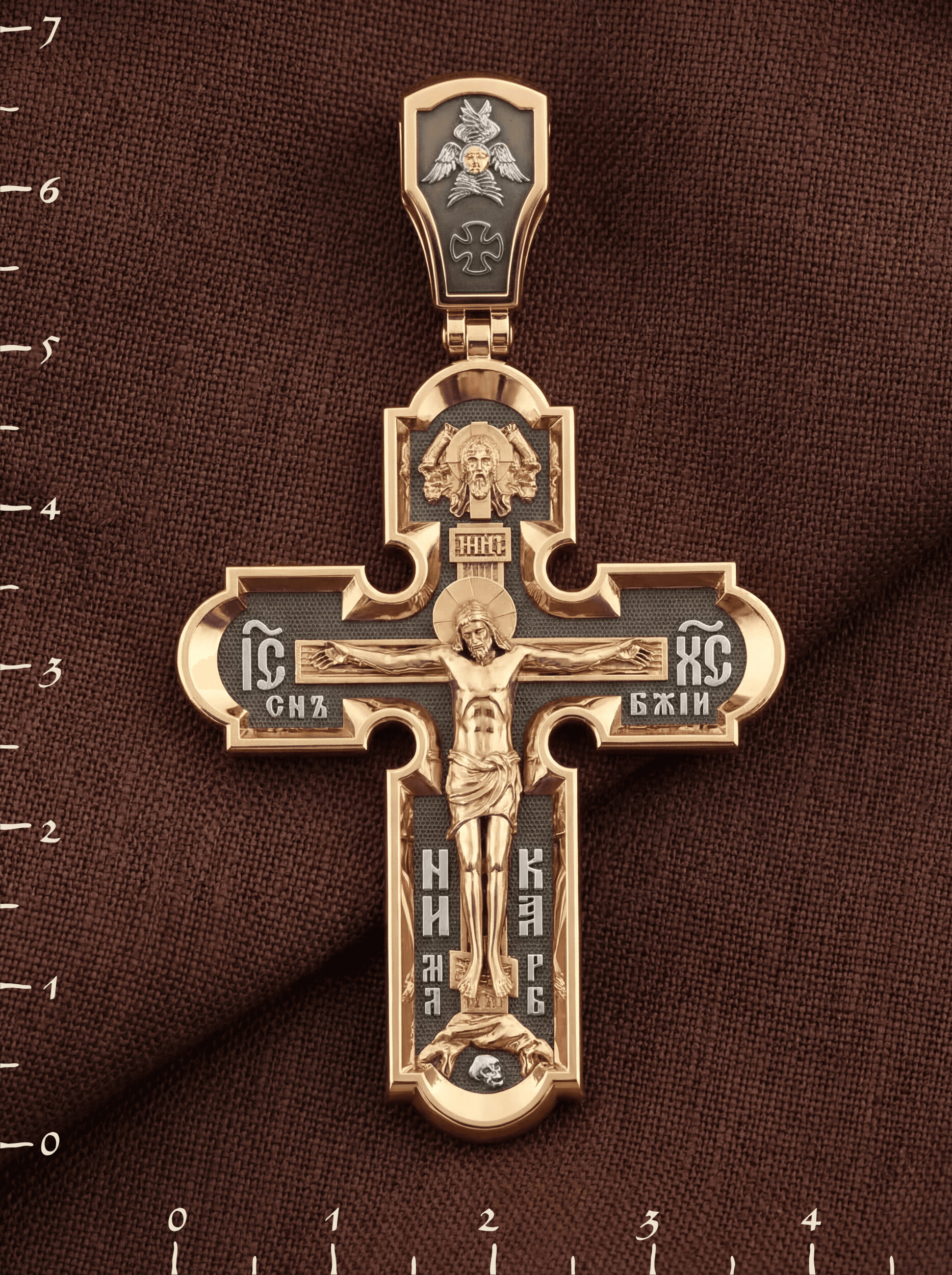 На лицевой стороне нательного креста по традиции изображено Распятие Господа нашего Иисуса Христа. Крест Господень стоит на небольшом каменистом возвышении, символизирующем гору Голгофу, которая обозначена буквами МЛРБ (Место Лобное Рай Бысть). Над головой Господа на поперечной перекладине написано «ИНЦИ», что символизирует табличку, которая была прибита к Кресту, с надписью «Иисус Назорей Царь Иудейский». Этим иудеи хотели посмеяться над Христом, не зная, что распинают истинного Царя всех царей. По сторонам основной перекладины расположены позолоченные рельефные инициалы Христа «ИС ХС». Под перекладиной, по сторонам древа, находится надпись «СЫН БОЖИЙ», а в основании креста — надпись «НИКА» (Победитель).
