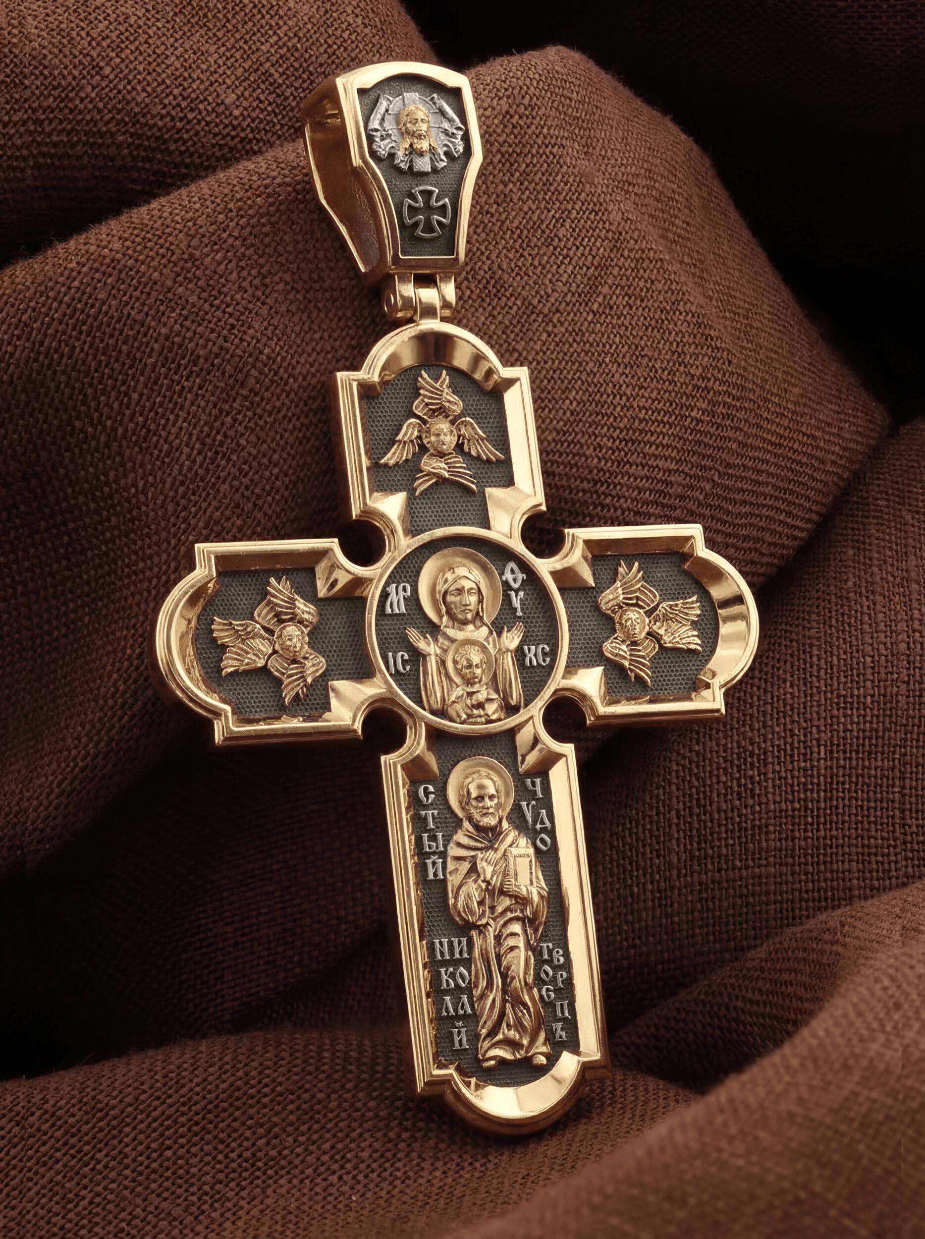 У основания креста в полный рост изображен самый любимый святой Православной Церкви — Николай Чудотворец. Святой почитается как целитель болезней, покровитель путешествующих, особенно по морю, помощник в торговле, учебе, а также в поисках достойного супруга.