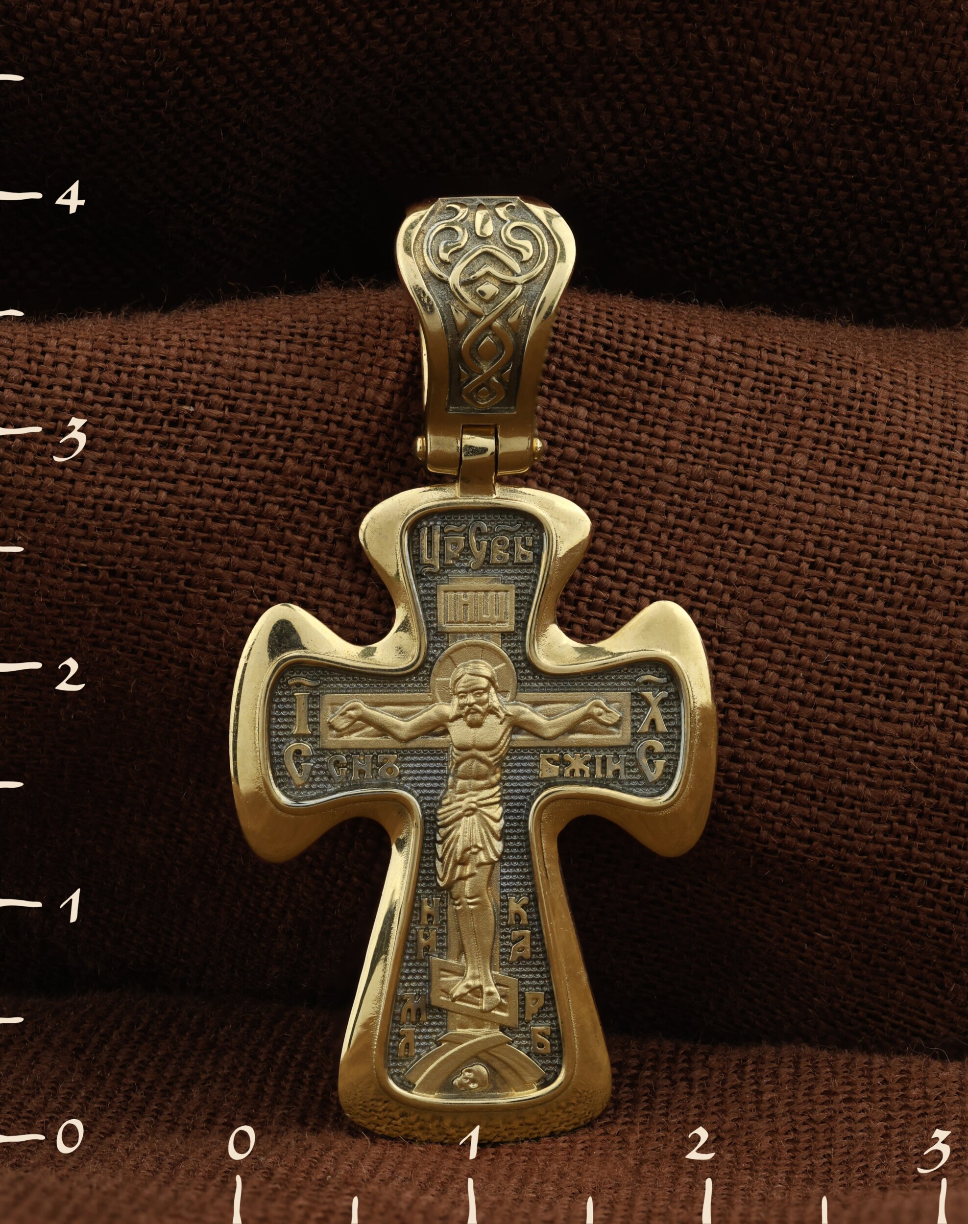 На лицевой стороне креста изображено Распятие Иисуса Христа. Господь представлен свободно покоящимся на кресте с простертыми руками и как бы обнимающим всю Вселенную. Он — Спаситель, искупивший грехи мира, «поправший смертию смерть» и призывающий к Себе «все концы земли». Поэтому рядом с Его образом помещены слова — «НИКА» и «Царь Славы». Эти слова характеризуют Господа как Великого Архиерея, победителя смерти. Также Распятие сопровождается надписями, олицетворяющими Христа. Это святое имя Христа «IC» (Иисус) «ХС» (Христос), и словосочетание «СЫН БОЖИЙ».
