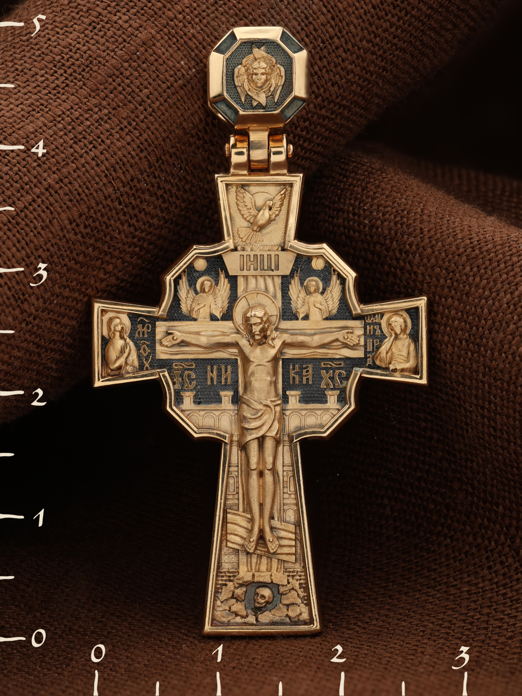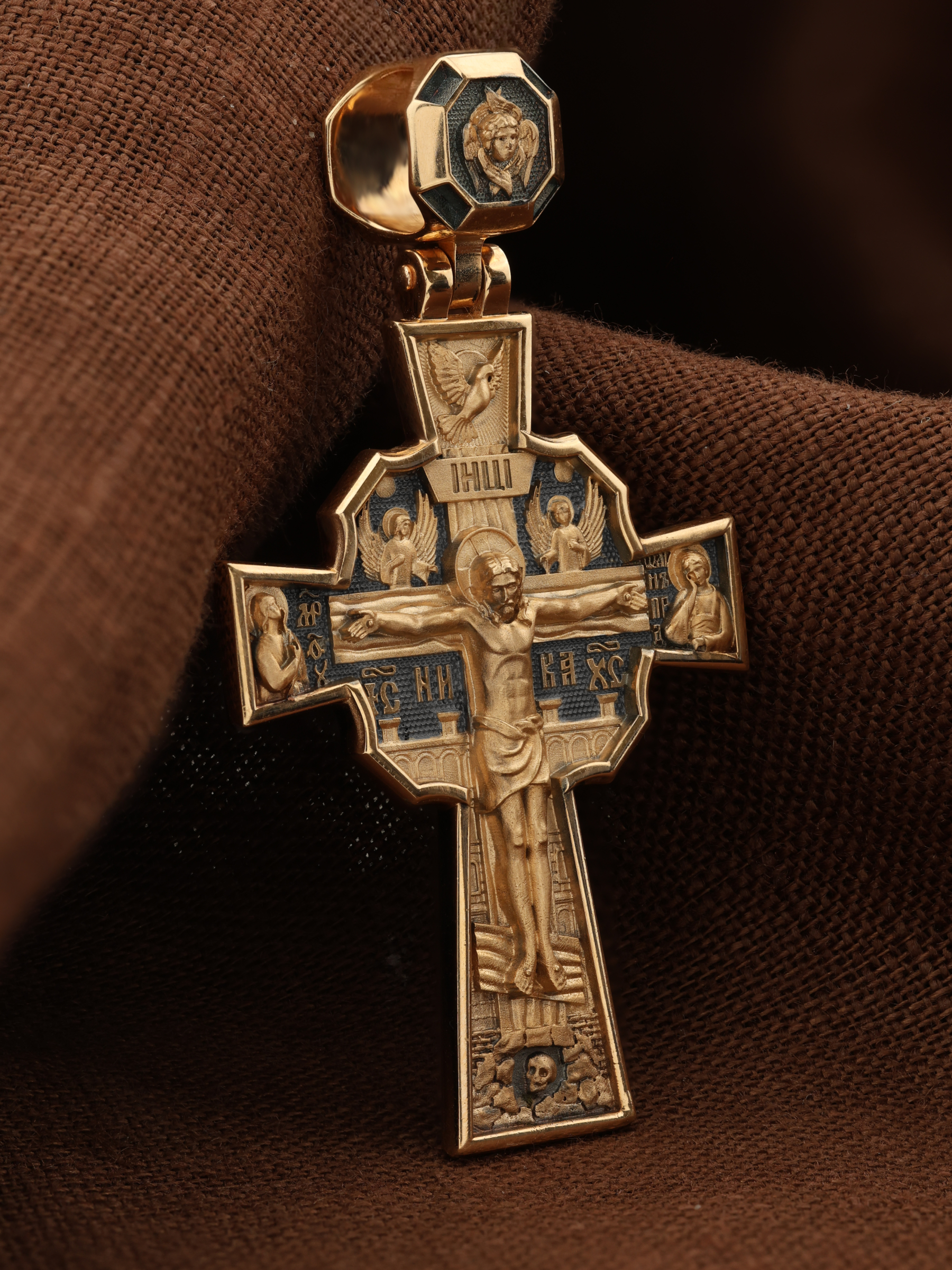 Над Распятием изображен парящий голубь — символ Святого Духа и Его благодати. На кулонном кольце изображен шестикрылый Серафим — самый приближенный к Господу Ангел.