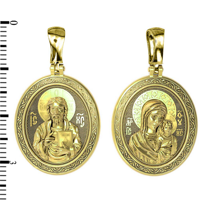 На обороте изображена Казанская икона Божией Матери — одна из самых почитаемых в России чудотворных икон Богородицы. Богословское значение Казанской иконы — указать верующим истинный Путь к спасению, который лежит через Христа. Только Божия Матерь имеет настолько сильное дерзновение к Спасителю, что может ходатайствовать перед Ним за всех верных. Именно этот образ дарится новой повенчанной паре, как хранитель очага и семейная реликвия. Молитва перед Казанской иконой Божьей Матери помогает во всех сложных случаях жизни, в болезнях, во всех печалях, невзгодах, скорбях. Уникальная история появления, чудеса, случившиеся по молитвам православных людей возле образа — все это делает Казанскую Богородицу особенной, среди тысяч других икон.