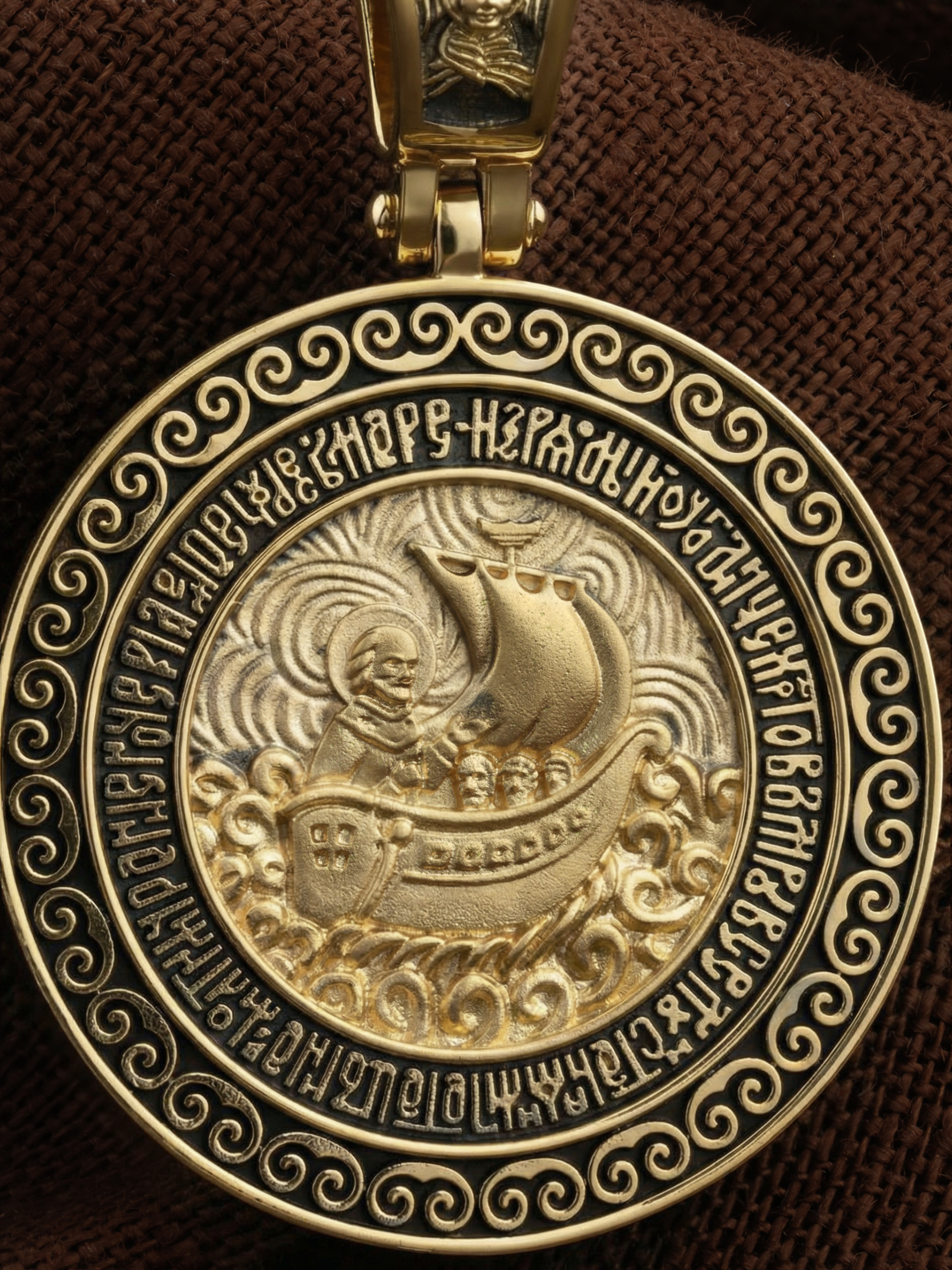 Лицевую сторону возглавляет икона Святителя Николая Чудотворца. Живший в III веке епископ Ликийского города Миры — самый почитаемый святой не только в России, но и во всем мире. Николай Чудотворец, помощник в делах, покровитель учащихся, утешитель обиженных и нуждающихся, целитель самых страшных и тяжелых недугов, предстатель и молитвенник за людей перед Богом. Также Святитель Николай Чудотворец известен своими молитвами за путешественников, когда непрестанный ветер и бушующие волны утихают и корабль заходит в спокойную гавань.