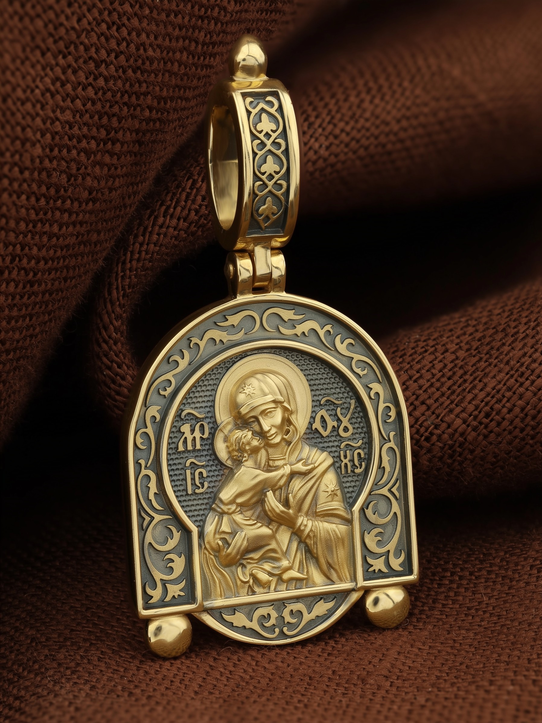 Лицевую сторону возглавляет Владимирская икона Божией Матери — самая Великая русская Святыня, многие века бывшая олицетворением нашей земли. Перед ней венчались на царство государи, избирались патриархи. Пречистой Богородице Владимирской клялись в верности Отечеству солдаты и за нее умирали на поле брани. Именно на ее защиту более всего уповала Россия в самые страшные периоды своей истории. Владимирская икона Божией Матери, по преданию, была написана на доске трапезного стола из дома Иисуса Христа. На Русь она была привезена в начале XII века и с тех пор почитается как главная святыня нашего Отечества. Перед ней молитвенно просят Богородицу об исцелении от телесных недугов, в частности, заболеваний сердца и сердечнососудистой системы. За помощью к ней обращаются во время бедствий, когда нуждаются в защите от врагов.