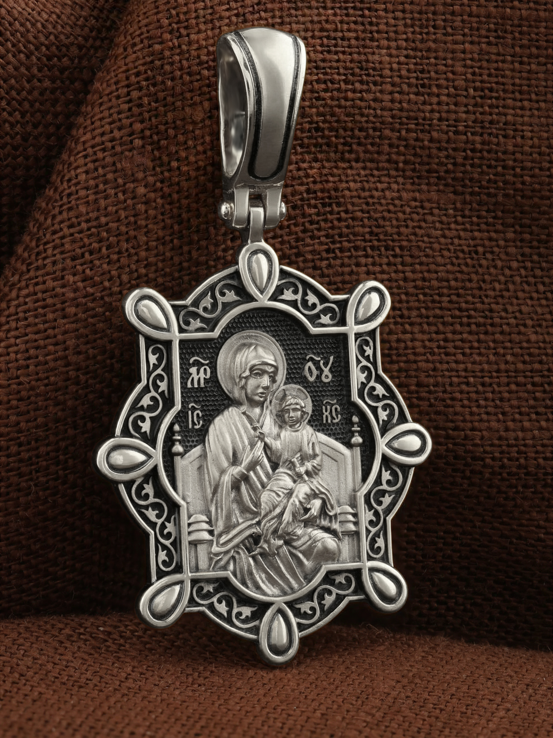 В центр образка помещен образ Божией Матери «Всецарица», восседающая на царском троне. На руках Ее — Богомладенец Иисус Христос со свитком в левой руке. Пальцы Его правой руки сложены в благословляющем жесте.