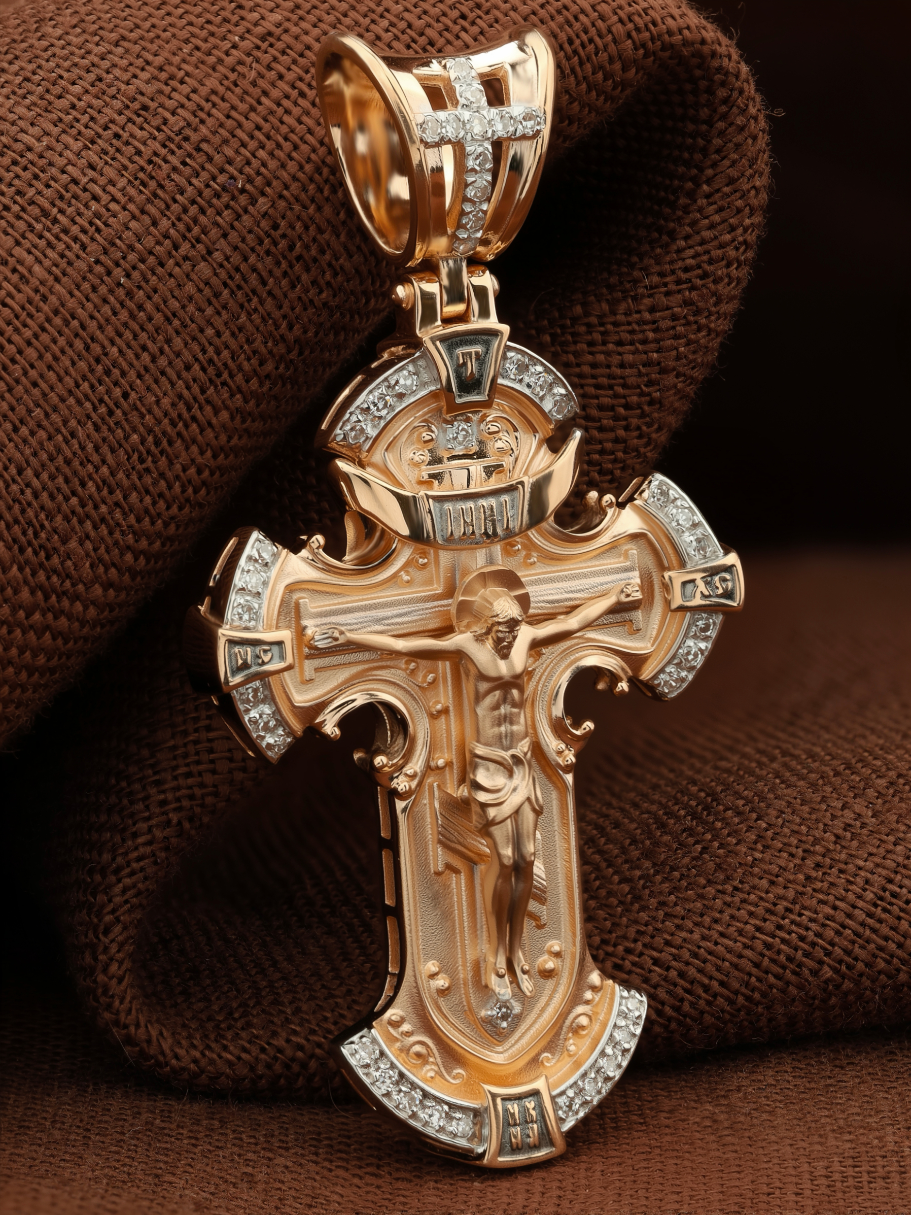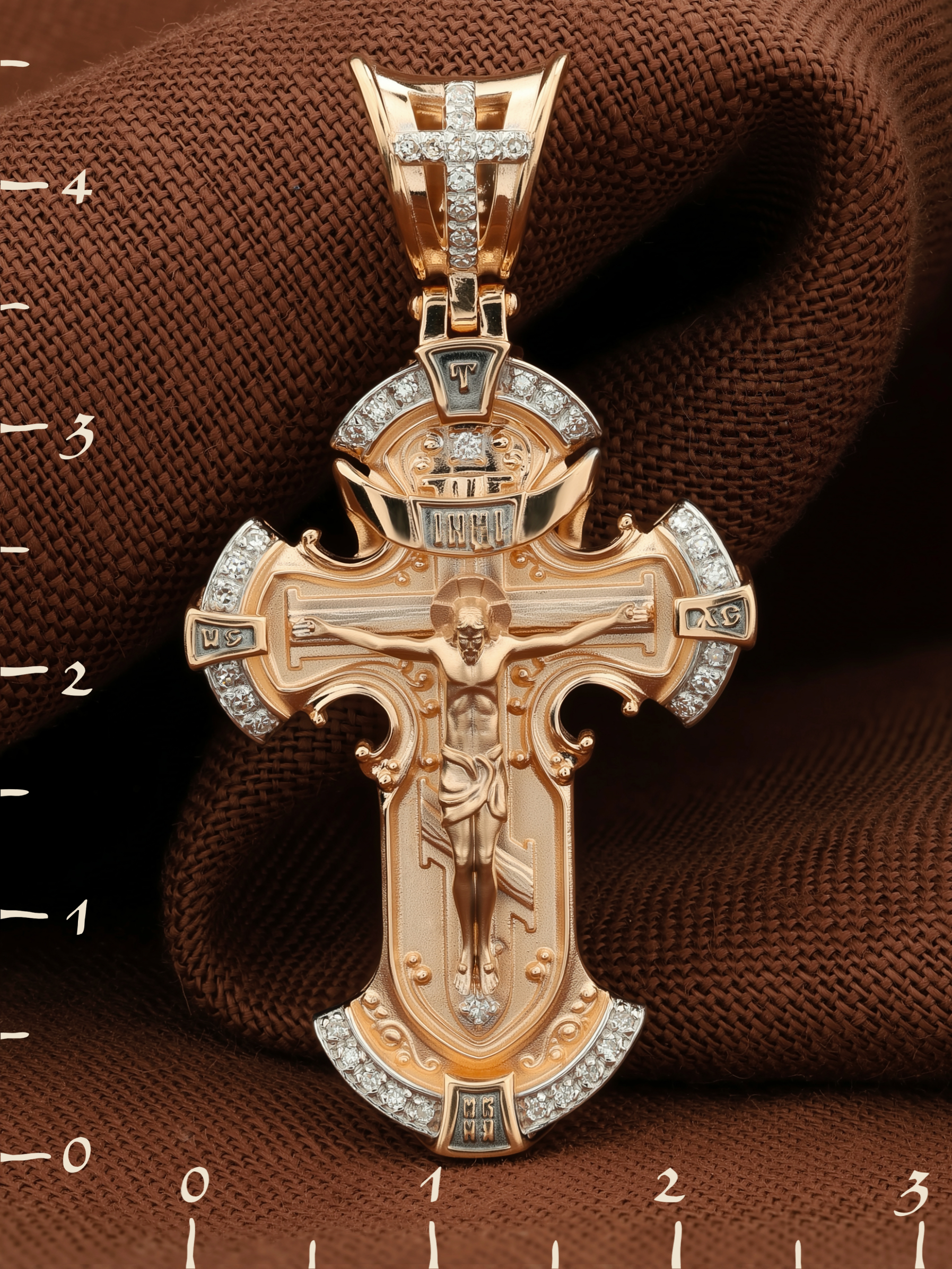 На лицевой стороне креста изображено Распятие Иисуса Христа на Голгофском Кресте, верхняя перекладина которого символизирует титло — табличку, на которой, согласно Евангелию, было начертано: Иисус Назорей Царь Иудейский (IНЦI). Справа и слева от Распятия изображены символы «IС ХС» — святое имя Христа. Внизу креста написано слово «НИКА», что значит «победитель». В верхней части креста обозначена буква «Т», которая символизирует одно из орудий страданий Господа — трость.