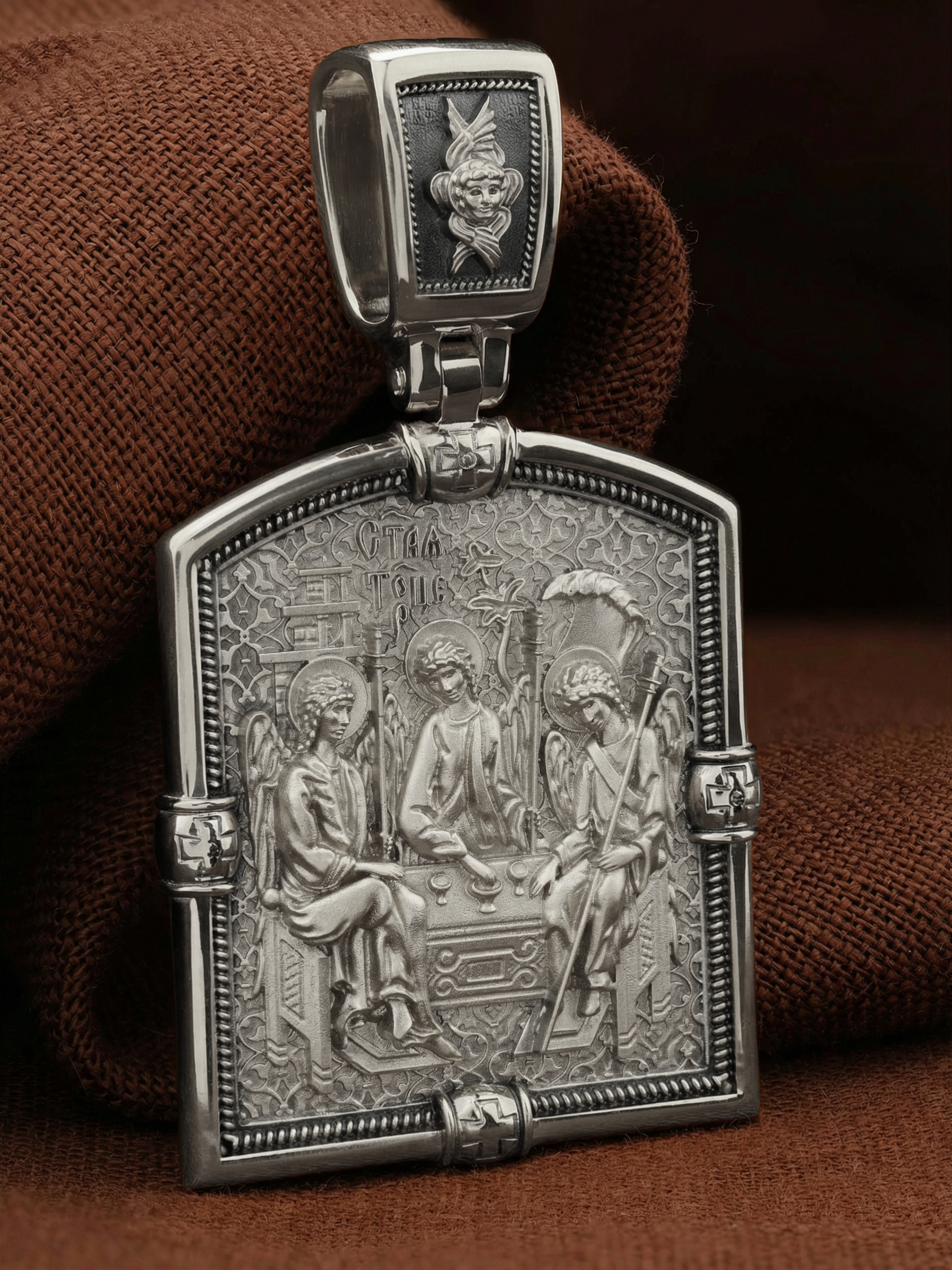 Основой композиции лицевой стороны является икона Святой Троицы.