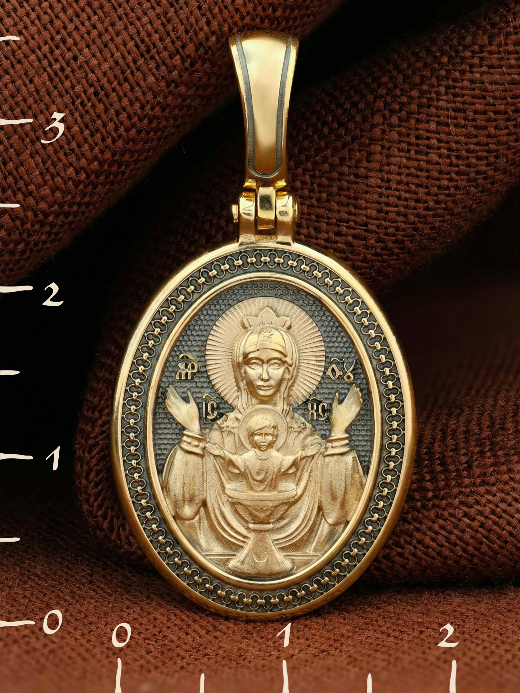 На лицевой части образка изображена икона Божией Матери «Неупиваемая чаша». Икона славится помощью в исцелении зависимостей, помогает людям обрести свободу от греховных страстей.