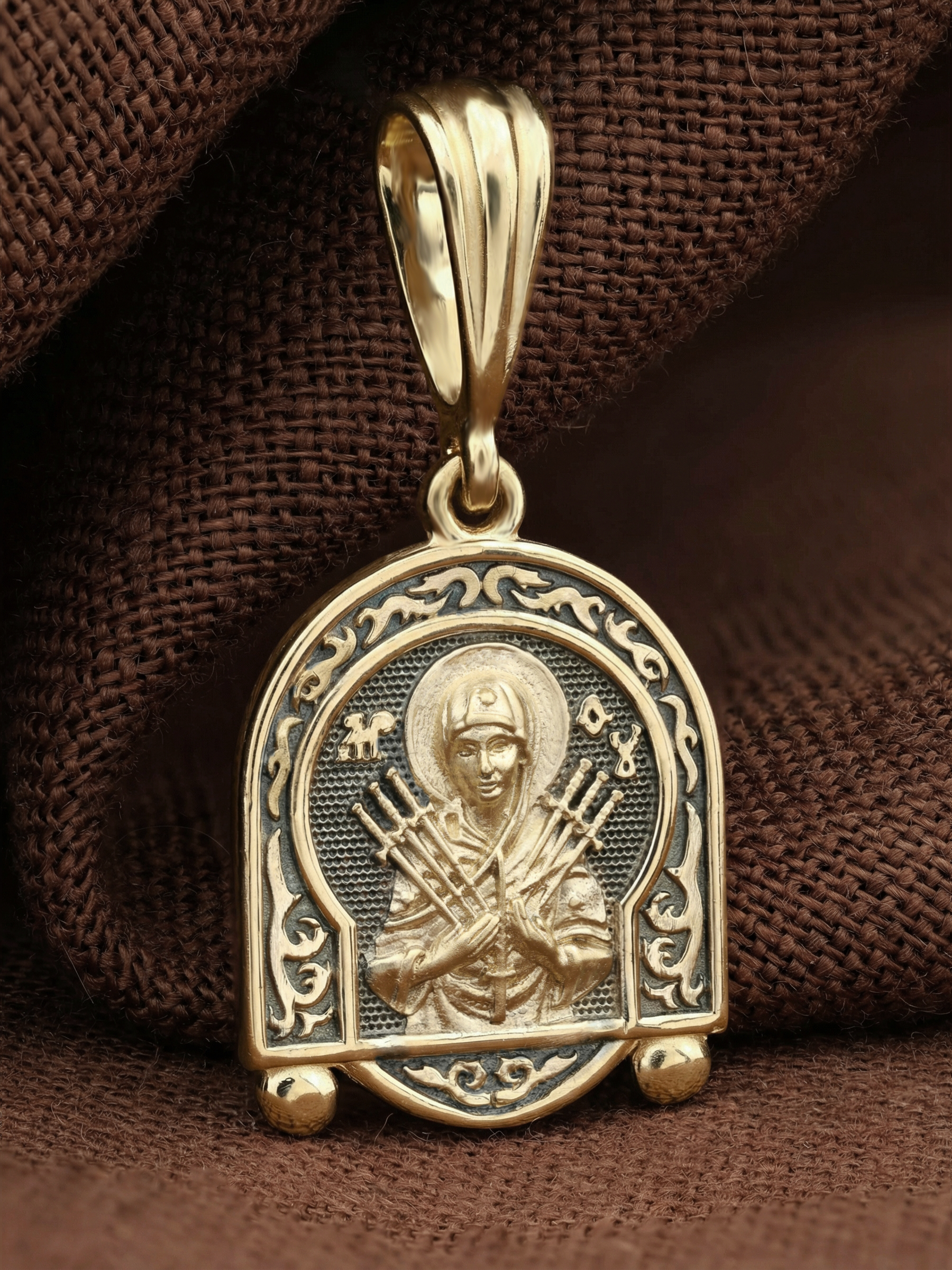 Пресвятая Богородица символически изображена пронзенной семью стрелами. Это образ скорби Матери, увидевшей страдания Своего Сына. Подобно тому, как Тело Христа пронзили гвоздями и копием, так и душу Пречистой Его Матери поразило «оружие» печали и сердечной боли. По учению Православной Церкви Господь был распят за грехи людей, и каждый день вновь распинается на Литургии за новые грехи ныне живущих. Поэтому семь стрел символически означают также семь смертных грехов человеческих, приносящих Богородице новые скорби.