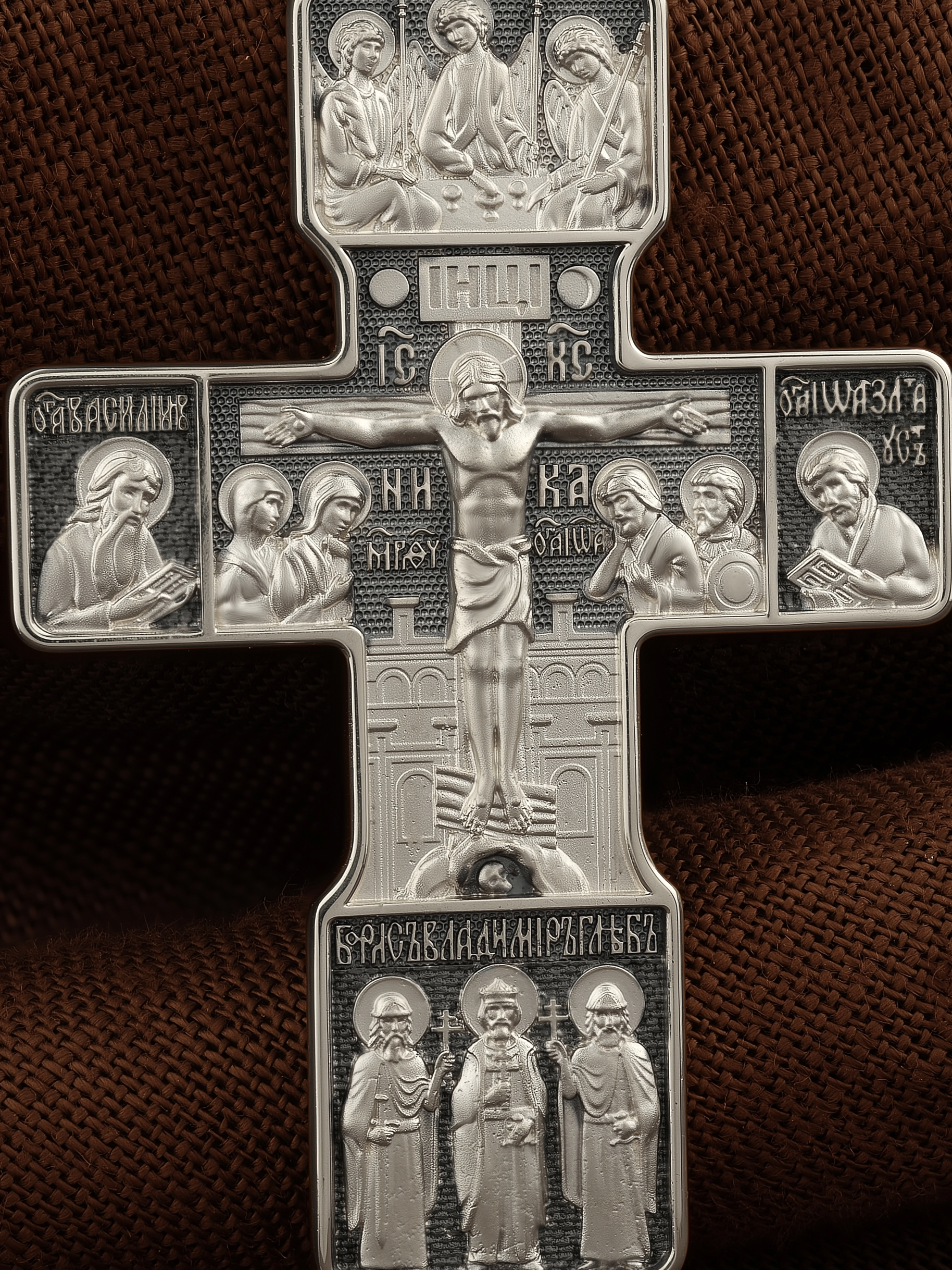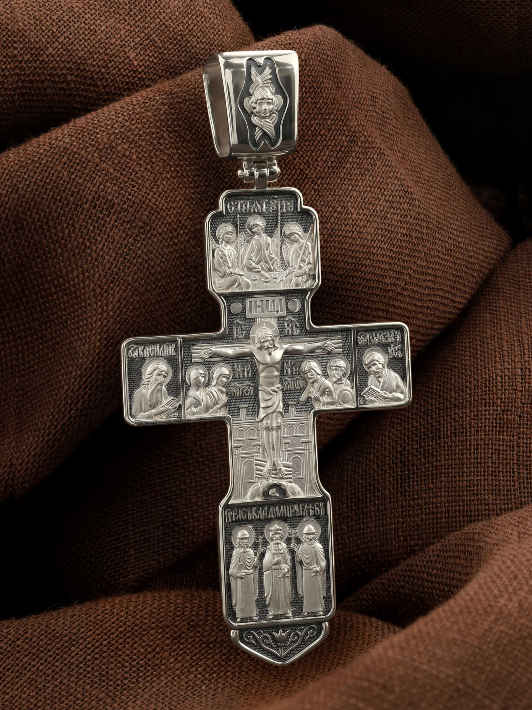 В нижней части креста изображены образы первых русских святых князей-мучеников — Бориса (князь ростовский) и Глеба (князь муромский) и святого равноапостольного князя Владимира. Страстотерпцам Борису и Глебу молятся об умиротворении Отечества, о добром нраве властей и правителей, о сохранении от междоусобицы, о даровании мужества перед лицом смертельной опасности. С Борисом и Глебом неразрывно связан образ их отца — святого равноапостольного князя Владимира, который также почитается как защитник и покровитель Русской Земли и Церкви. В молитвах его называют «отец русский» или «отец всея Руси».