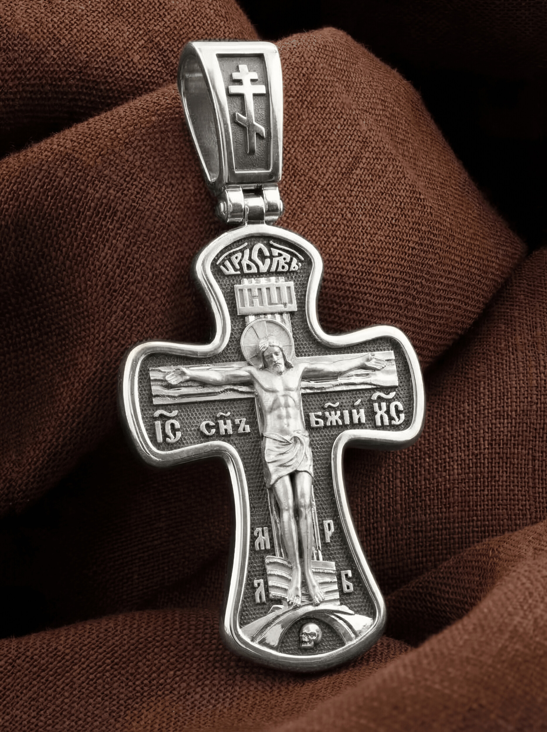 Основой композиции лицевой стороны креста является Распятие Иисуса Христа. С обеих сторон горизонтальной перекладины надписи: монограмма святого имени Христа — «ИС ХС», а под ней «Сын Божий». Над головой Господа на поперечной перекладине аббревиатура «IНЦI», что символизирует «Иисус Назорей Царь Иудейский». Венчает лицевую сторону креста надпись «Царь Славы». В подножии мы видим изображенную гору Голгофу в виде скалистой горки, а так же буквы «МЛ» «РБ», которые означают: «Место Лобное Рай Бысть». Крест стоит на горе камней, символизирующих Голгофу, в основании которой различается череп. Это голова Адама.