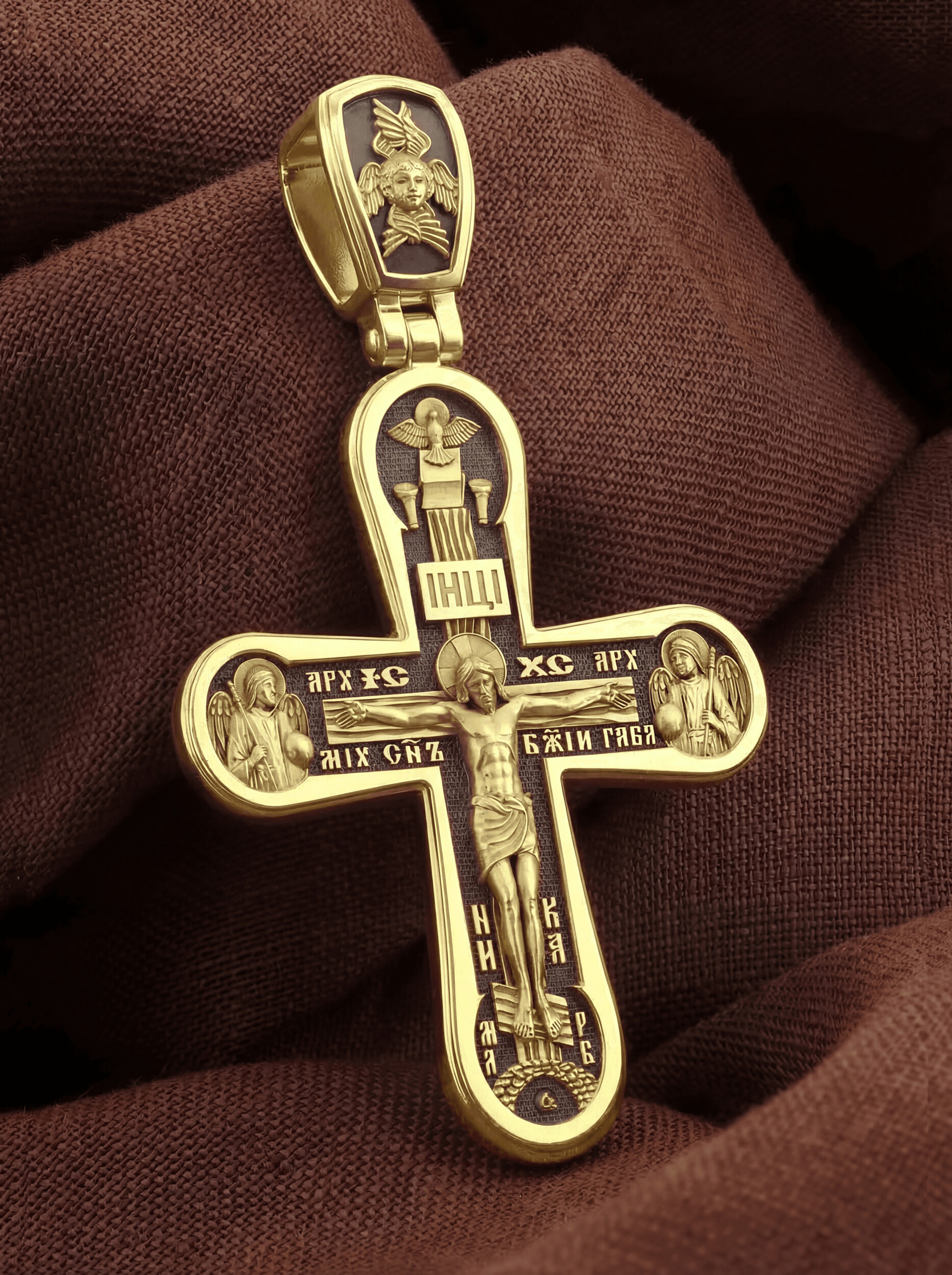 Центральную часть лицевой стороны занимает Распятие Господа Иисуса Христа. Крест стоит на горе камней, символизирующих Голгофу, в основании которой различается череп. Это голова Адама. С обеих стон Его стоят Архангелы: покровитель воинов и всех верных Богу, защитник душ умерших, страж райских ворот — Архистратиг Михаил; и Архангел Гавриил — небесный вестник, покровитель музыкантов и учителей.