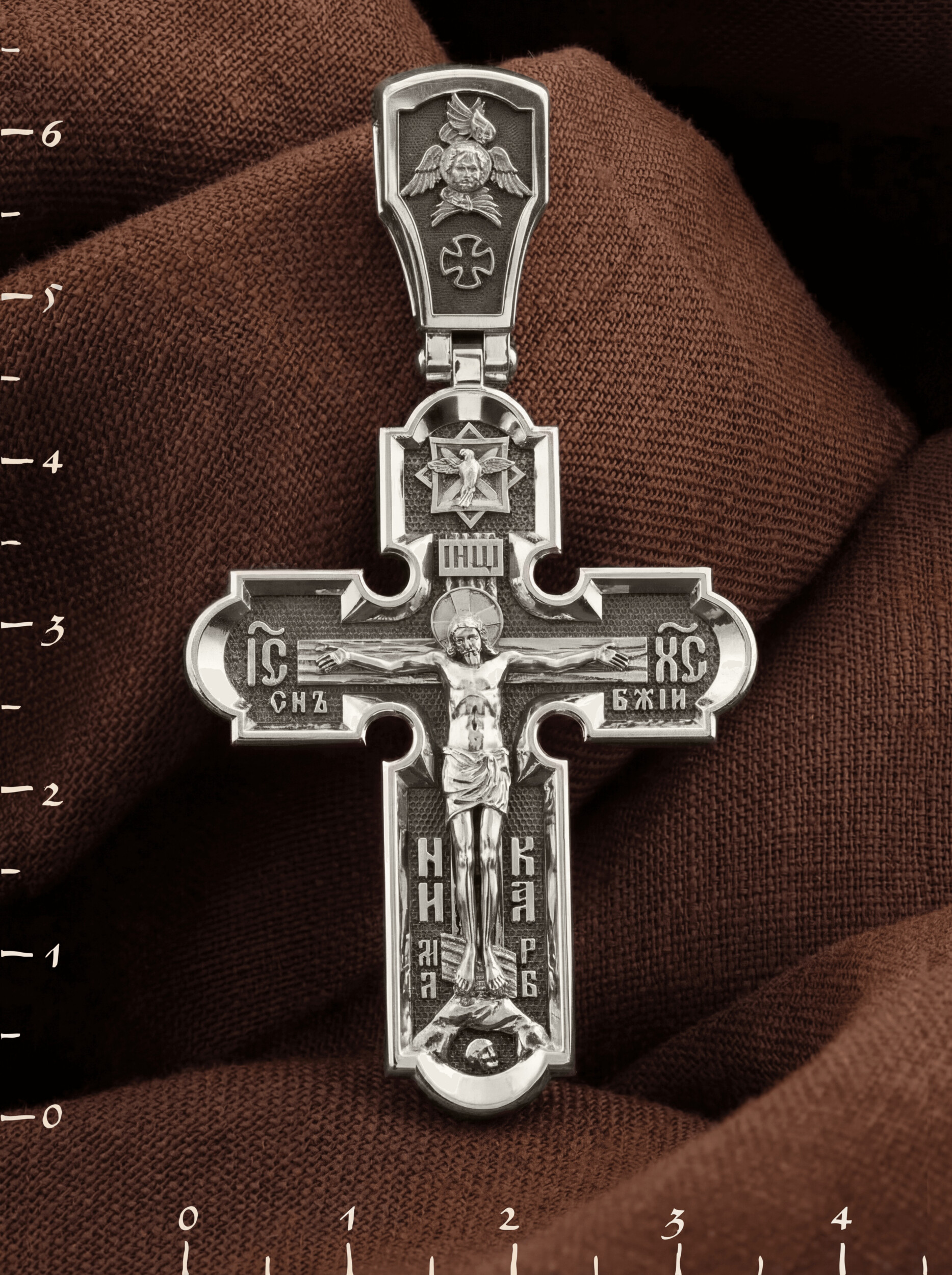 На лицевой стороне креста изображено Распятие Иисуса Христа. Господь представлен свободно покоящимся на кресте с простертыми руками и как бы обнимающим всю Вселенную. Он — Спаситель, искупивший грехи мира, «поправший смертию смерть» и призывающий к Себе «все концы земли». Поэтому рядом с Его образом помещены слова — «НИКА» и «Царь Славы». Эти слова характеризуют Господа как Великого Архиерея, победителя смерти. Верхняя перекладина символизирует титло — табличку, на которой, согласно Евангелию, было начертано: Иисус Назорей Царь Иудейский (IНЦI). Также Распятие сопровождается надписями, олицетворяющими Христа. Это святое имя Христа «IC» (Иисус) «ХС» (Христос), и словосочетание «СЫН БОЖИЙ». Крест стоит на горе камней, символизирующих Голгофу, в основании которой различается череп. Это голова Адама. На кулонном кольце помещено изображение серафима.