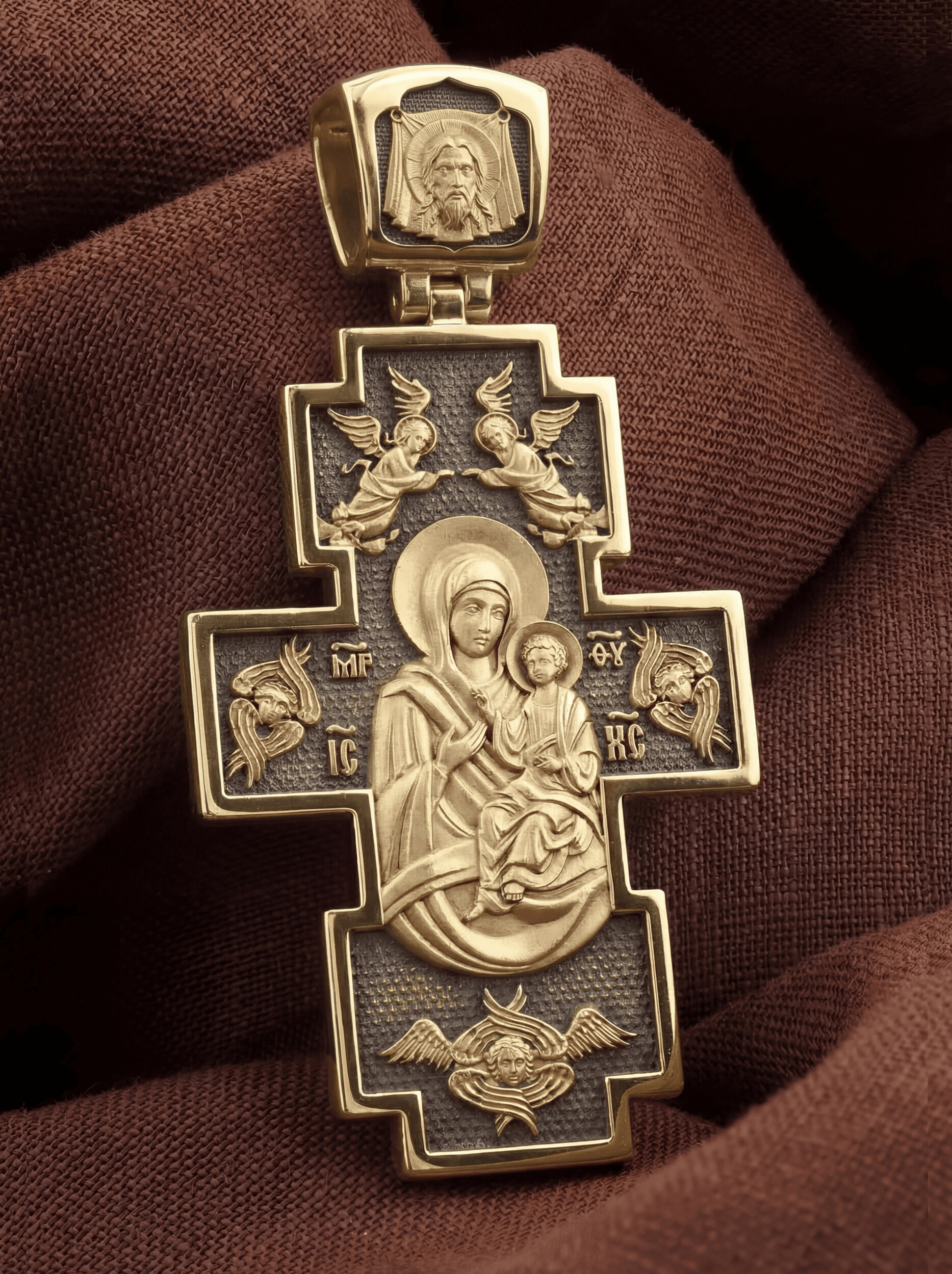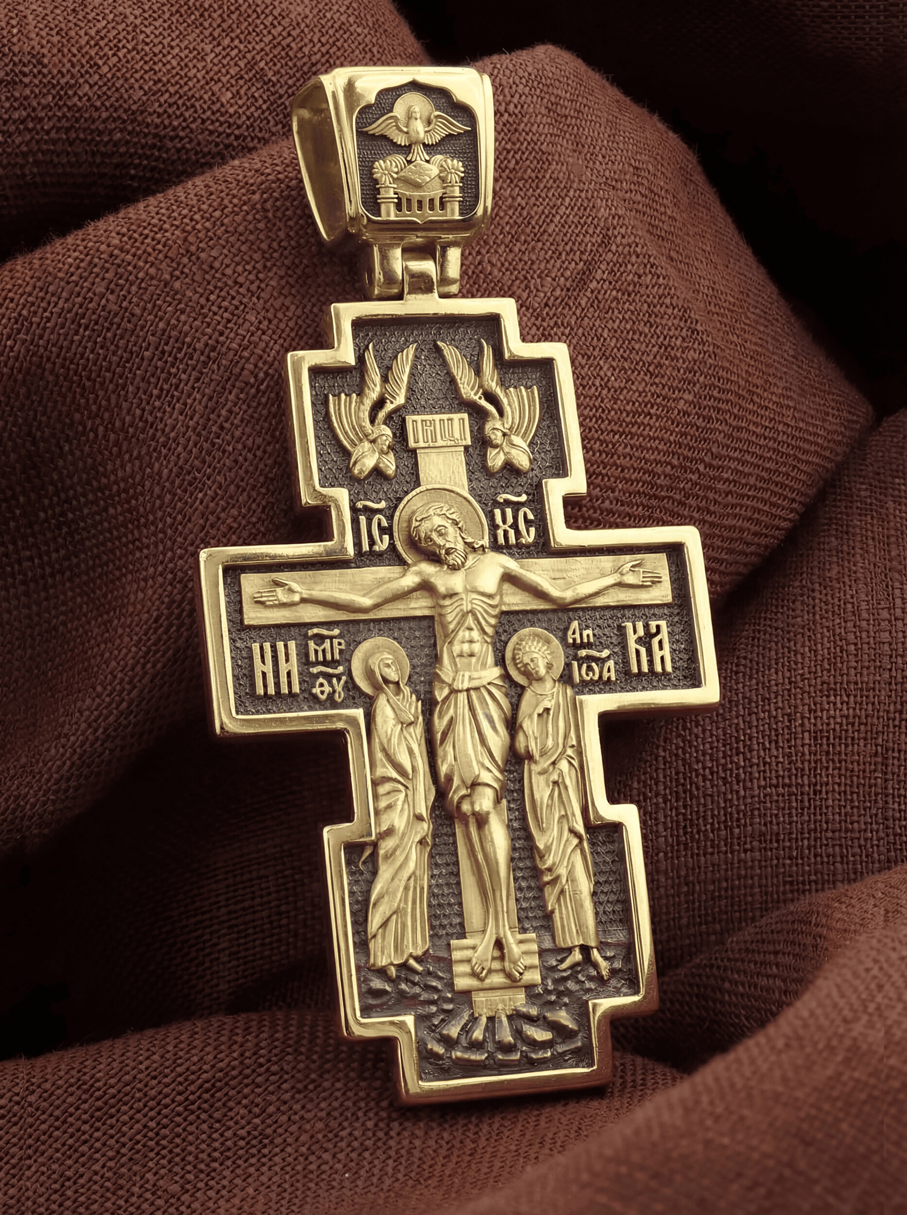 На лицевой стороне креста изображено Распятие Христово — величественный, торжественный образ христианства, знак победы над смертью. Христос, принеся Себя в Жертву на Кресте, искупил грехи всего мира и дал людям возможность обрести спасение. Слева и справа от Креста стоят Богоматерь и апостол Иоанн Богослов. По преданию, именно они до последнего не оставляли Спасителя в Его страданиях, были с Ним до самой смерти. Во главе образка изображен парящий голубь — символ Святого Духа и Его благодати. Сверху над Распятием парят Ангелы. Они изображены летящими с Небес вниз, к Кресту. Ангелы словно поддерживают табличку над головой Спасителя, на которой написано IНЦИ — «Иисус Назарянин Царь Иудейский». Эта табличка — титло — была приколочена римскими палачами как указание на «вину» Христа, то, за что Он был казнен.