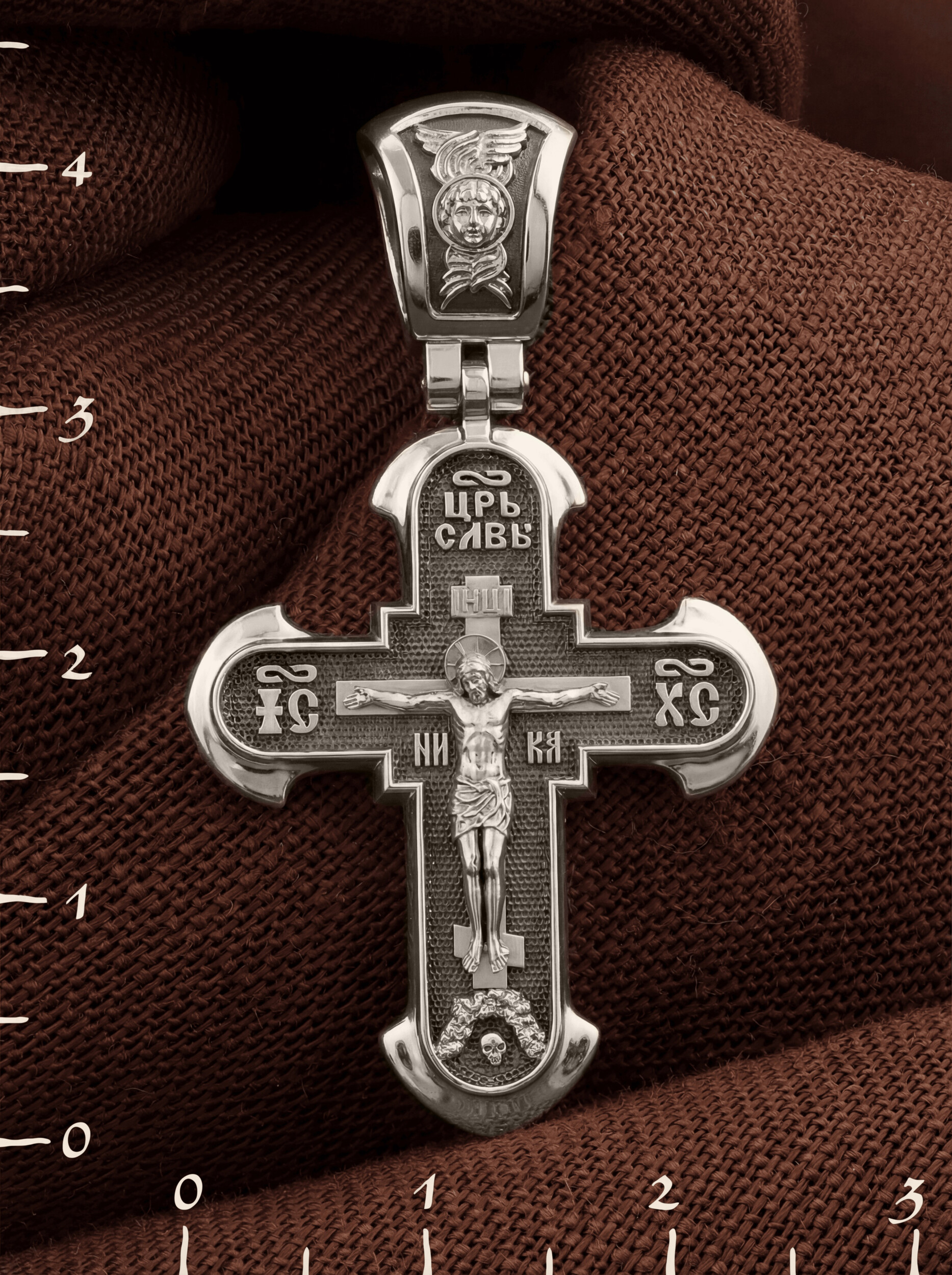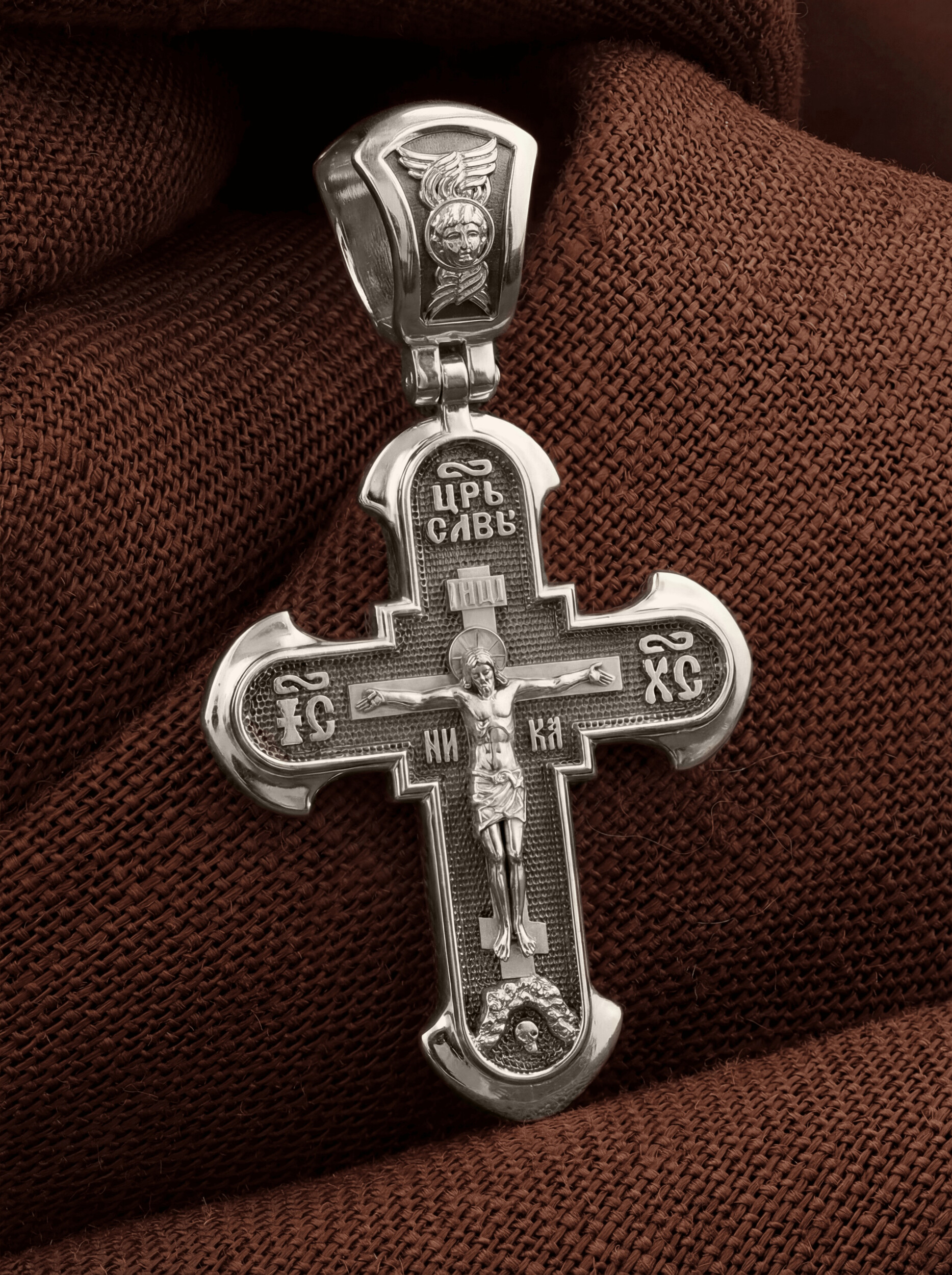 На лицевой стороне креста изображено Распятие Господа нашего Иисуса Христа. В традиции Православия — принято изображать Спасителя как Воскресшего Крестоносителя, призывающего в Свои объятия все концы мира. Его руки имеют горизонтальное положение, открытые ладони пробиты гвоздями, голова наклонена вправо, вокруг головы крестчатый нимб. Крест стоит на горе камней, символизирующих Голгофу, в основании которой различается череп. Это голова Адама. По преданию, тело Адама было погребено Симом, сыном Ноя, на месте, где впоследствии возникла гора Голгофа. Над головой Господа на поперечной перекладине аббревиатура «IНЦI», что символизирует табличку, которая была прибита к Кресту, с надписью «Иисус Назорей Царь Иудейский». Этим иудеи хотели посмеяться над Христом, не зная, что распинают истинного Царя всех царей. По бокам поперечной перекладины титлы святого имени Христа «IC» (Иисус) «ХС» (Христос), и слово «НИКА», что в переводе с греческого означает «победитель». Венчает лицевую сторону креста надпись «Царь Славы».