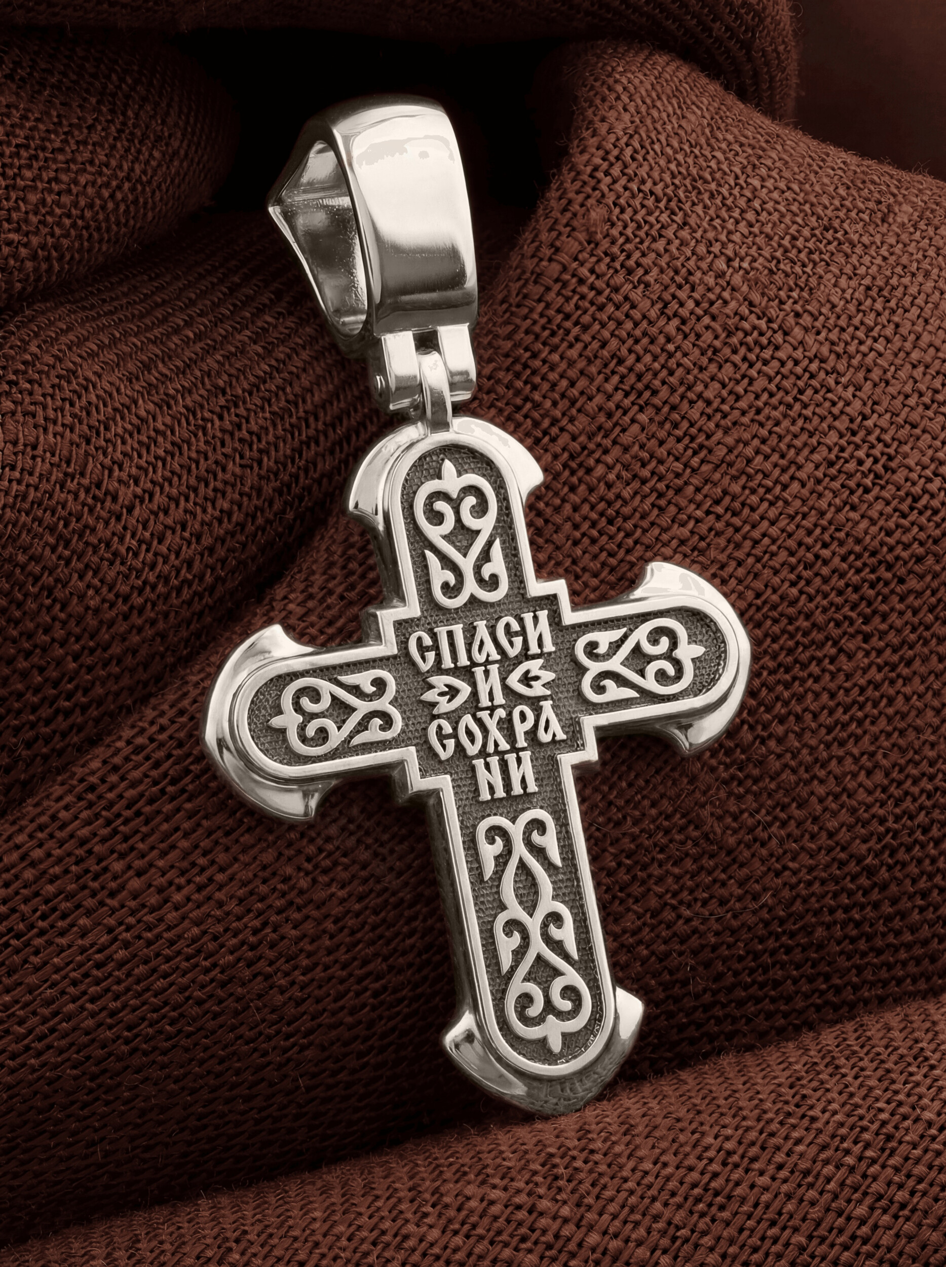Обратная сторона креста выполнена с использованием растительного орнамента. Такой крест с растительным узором вводит мотив процветшего креста и символизирует Древо Жизни. Умерев за наши грехи, Христос возродил всех для Жизни Вечной, «Смертию смерть поправ…». Своими страданиями Он искупил грехи человечества, умерев и сошествовав во ад, победил сатану, освободил души праведников от вечной смерти и открыл им небесные врата рая. Поэтому на обороте данного креста написано молитвенное славословие: «Спаси и сохрани».