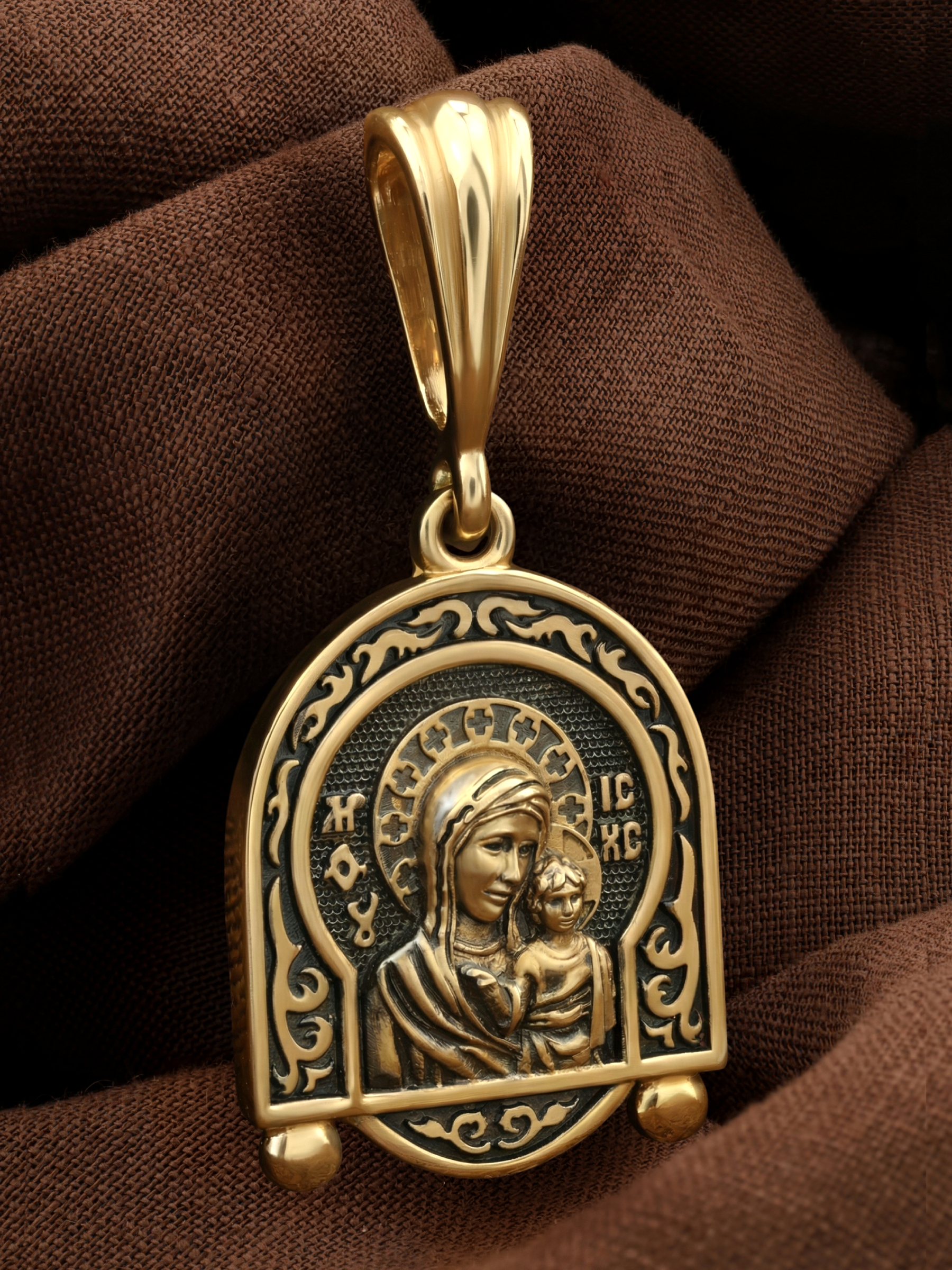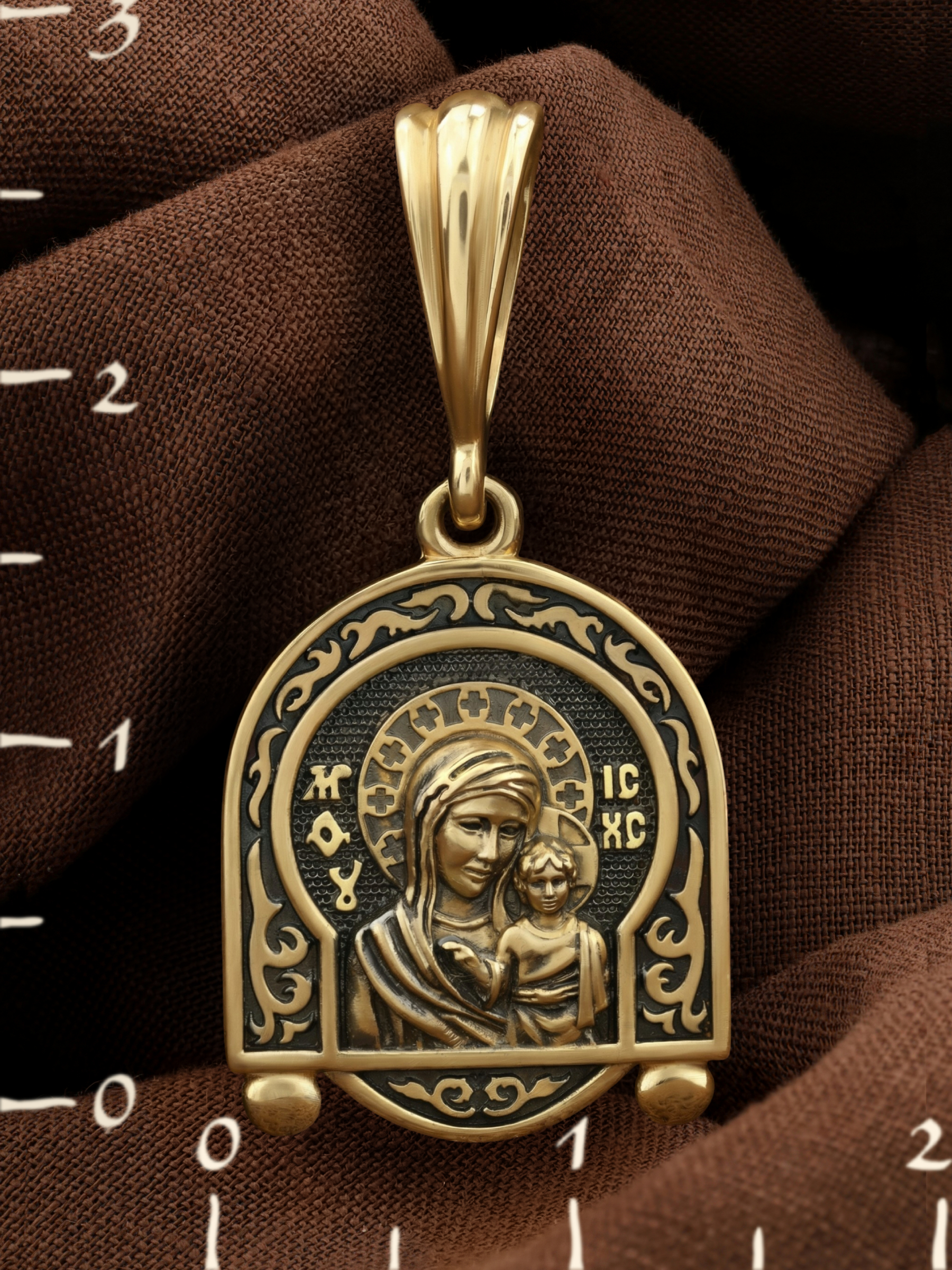 На лицевой части образка изображена Казанская икона Божией Матери — одна из самых почитаемых в России чудотворных икон Богородицы. Богословское значение Казанской иконы — указать верующим истинный Путь к спасению, который лежит через Христа. Только Божия Матерь имеет настолько сильное дерзновение к Спасителю, что может ходатайствовать перед Ним за всех верных. Именно этот образ дарится новой повенчанной паре, как хранитель очага и семейная реликвия. Молитва перед Казанской иконой Божьей Матери помогает во всех сложных случаях жизни, в болезнях, во всех печалях, невзгодах, скорбях. Уникальная история появления, чудеса, случившиеся по молитвам православных людей возле образа — все это делает Казанскую Богородицу особенной, среди тысяч других икон.