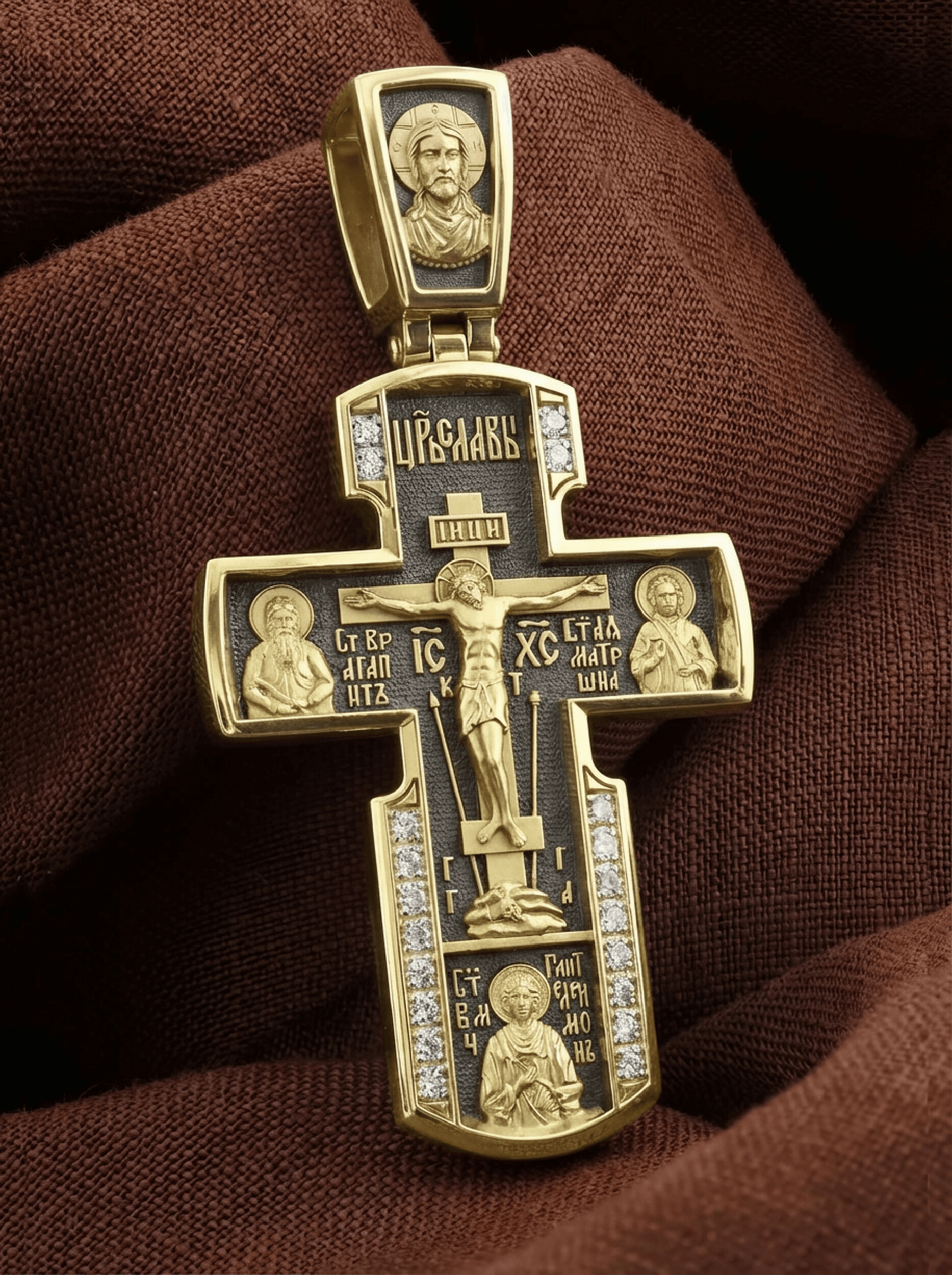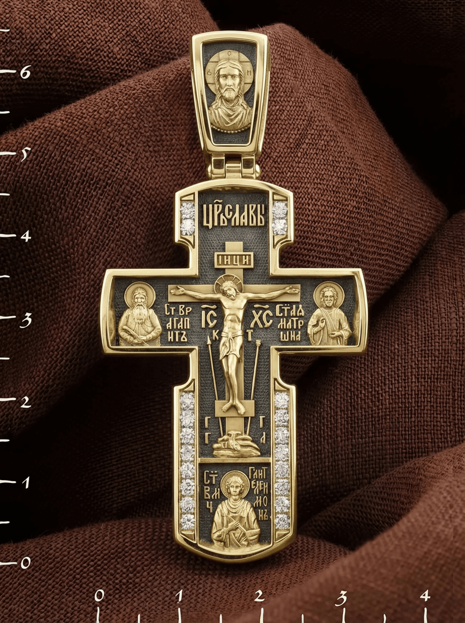 На лицевой стороне креста изображено Распятие Иисуса Христа на Голгофском Кресте, над вершиной которого помещена надпись «Царь Славы». Справа от Распятия помещен образ прославленной святой блаженной Матроны. «Матронушка», — ласково называют эту святую православные за удивительную любовь и помощь, которую она подает всем нуждающимся в ее поддержке. Слева — икона прп. Агапита. Этот святой жил в пещерах Киево-Печерского монастыря в XI веке и бескорыстно врачевал мирян и монахов.