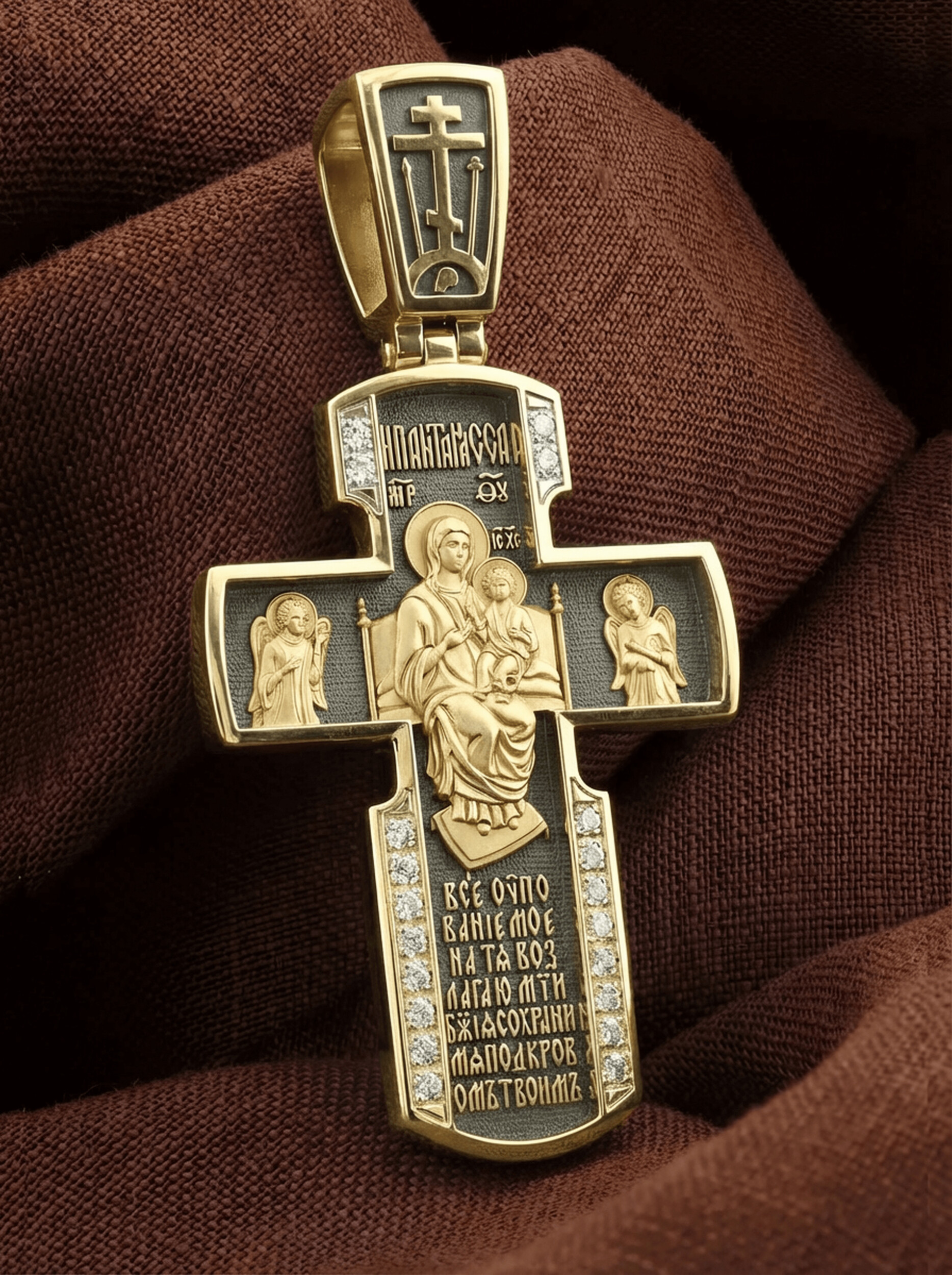 Внизу креста написана молитва обращенная к Божией Матери «Все упование мое на Тя возлагаю, Мати Божия, сохрани мя под кровом Твоим».