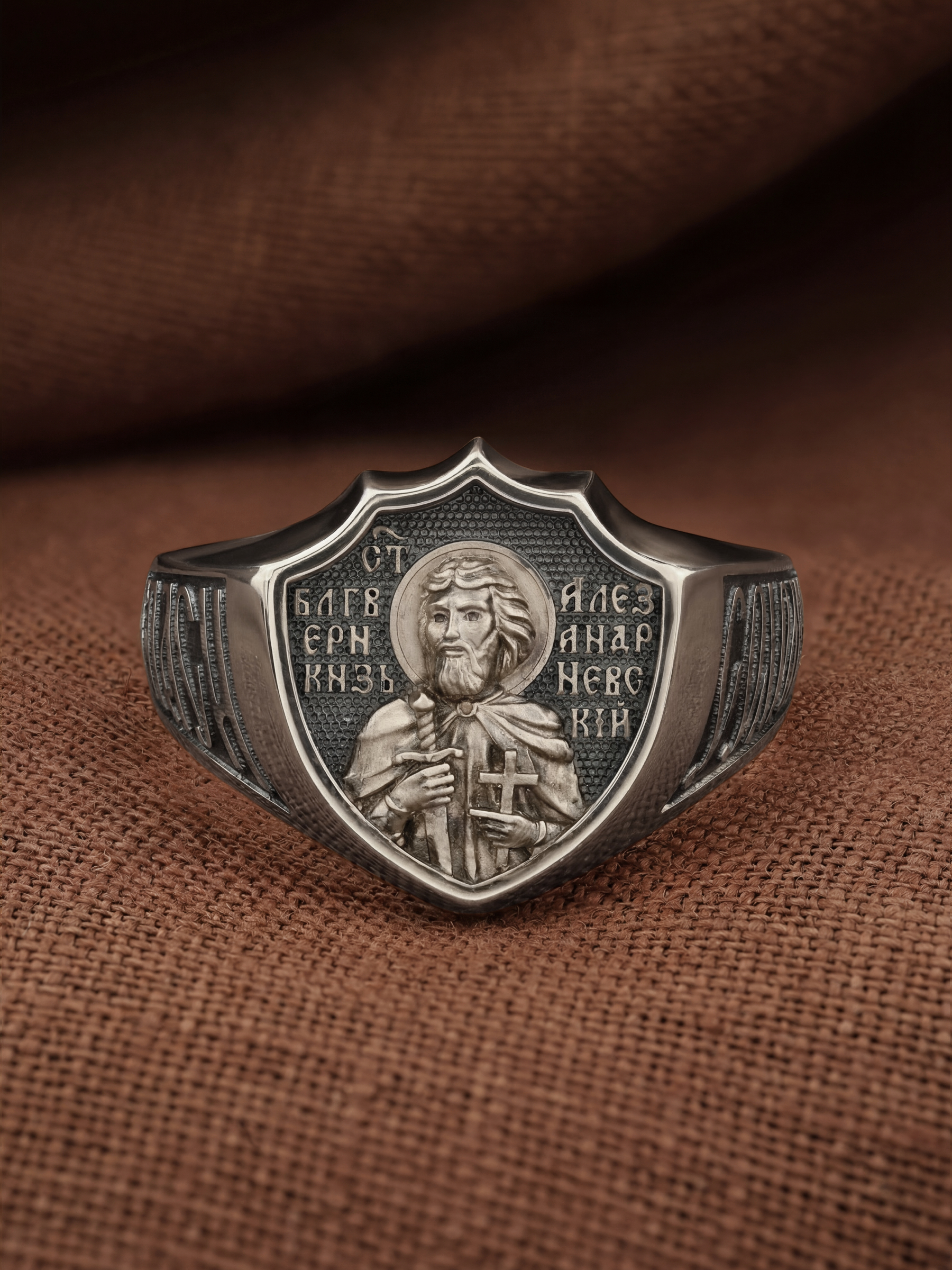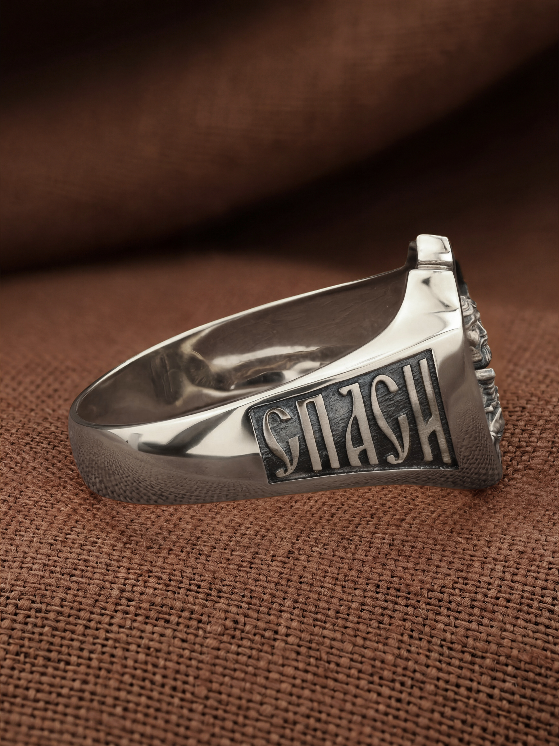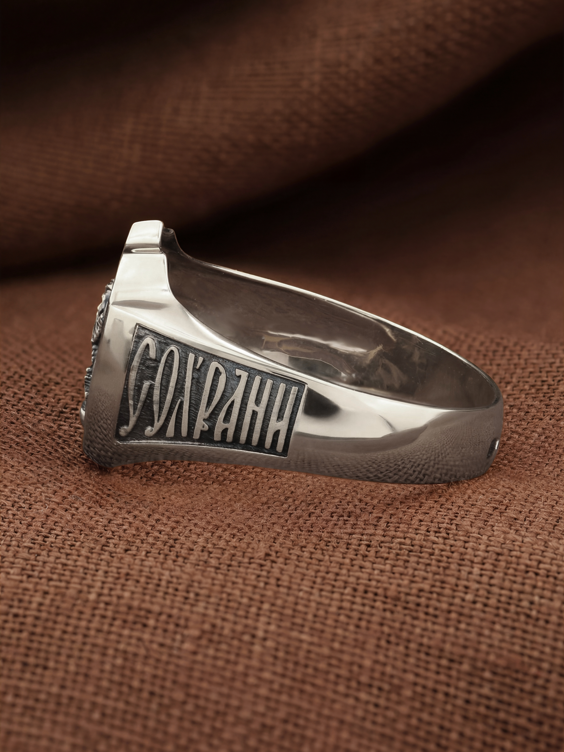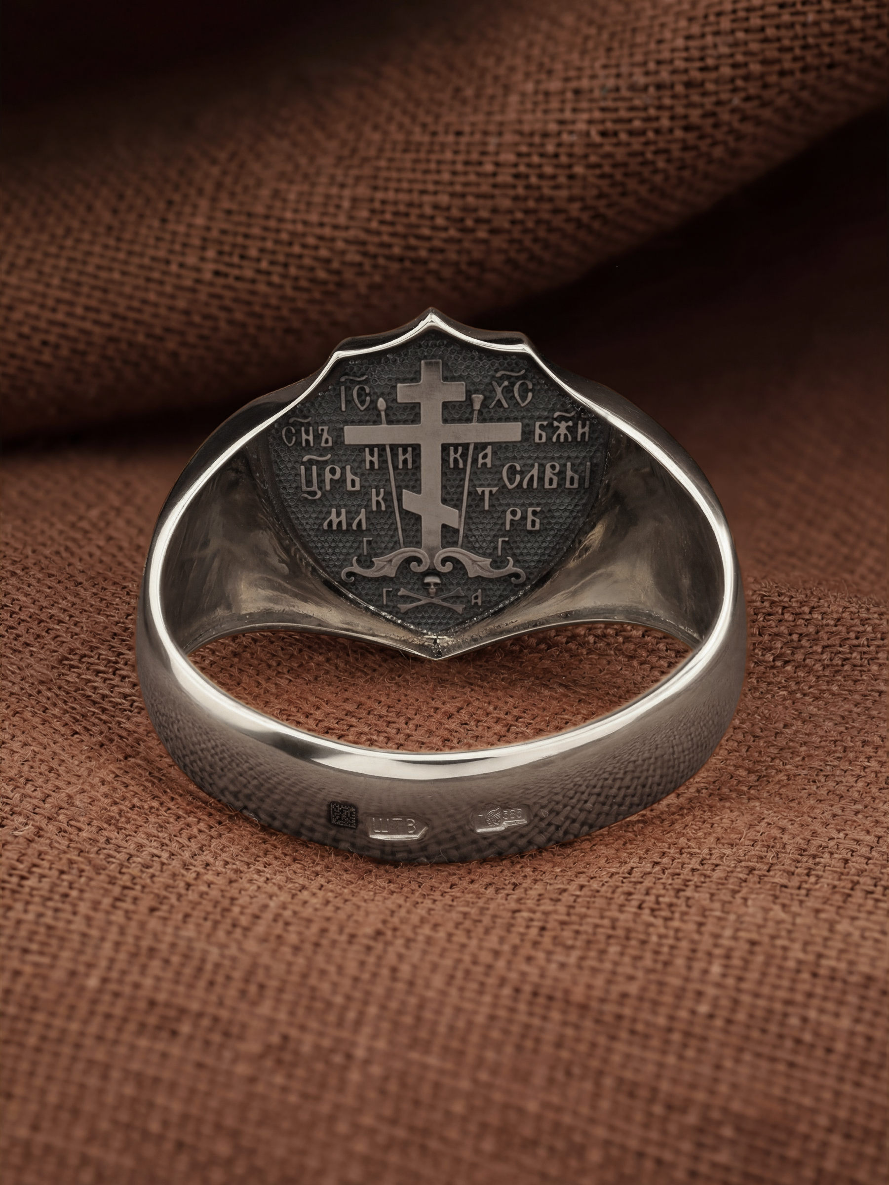 С внутренней стороны кольца изображен «Голгофский крест». Центральным и главным элементом композиции лицевой стороны является восьмиконечный крест — образ Честного и Животворящего Креста Господня, установленного на горе Голгофе. В основании креста изображена гора Голгофа, на которой был распят Спаситель и череп Адама, чьи кости по приданию омыла кровь Иисуса Христа. Перед головой располагаются лежащие кости рук, изображаются правая на левой, как при погребении или причащении. В XVI веке на Руси около изображения Голгофы появились обозначения «М.Л.Р.Б.» — Место Лобное Рай Бысть (Голгофа в переводе с еврейского — Лобное место). Чуть ниже справа и слева буквы «Г.Г.» — гора Голгофа.