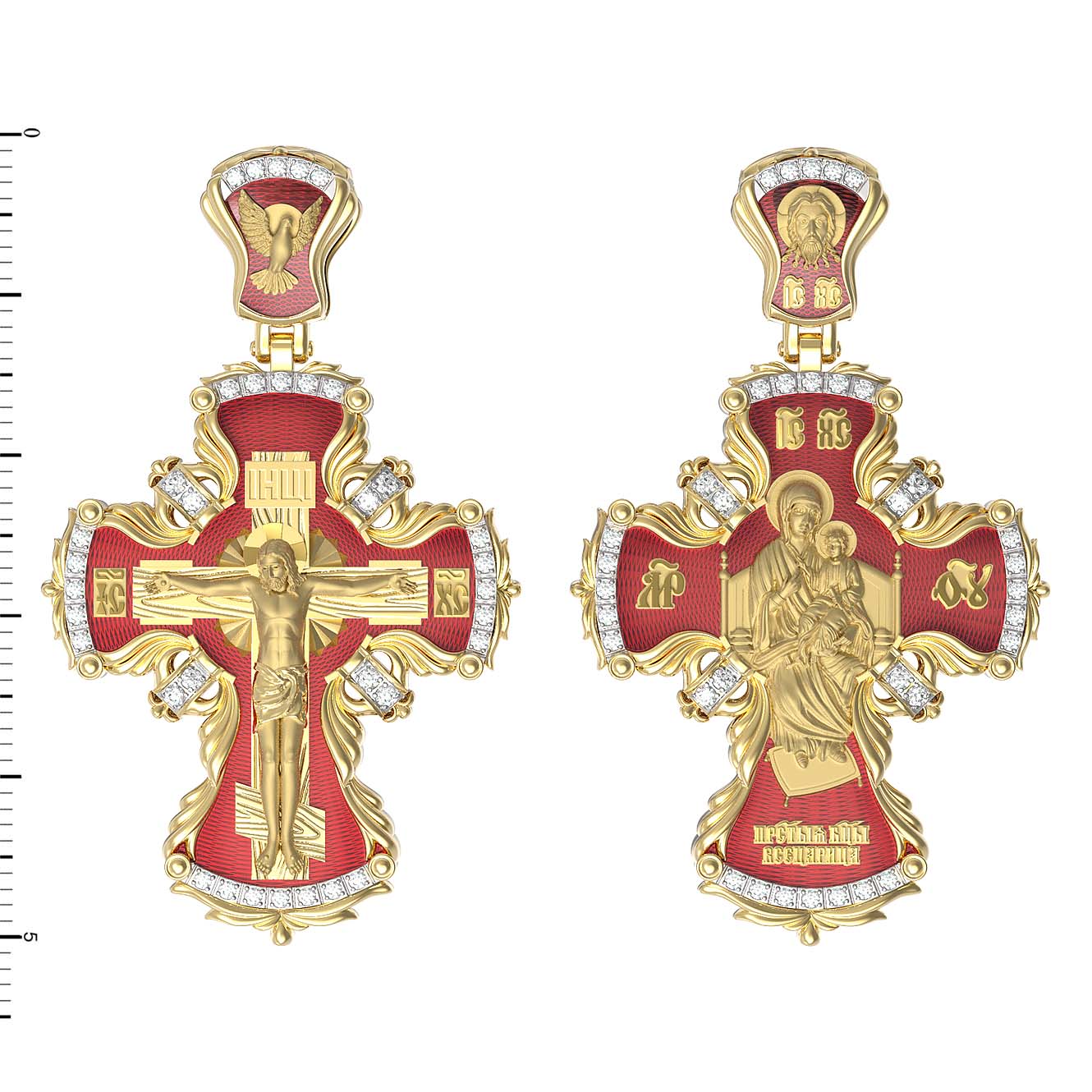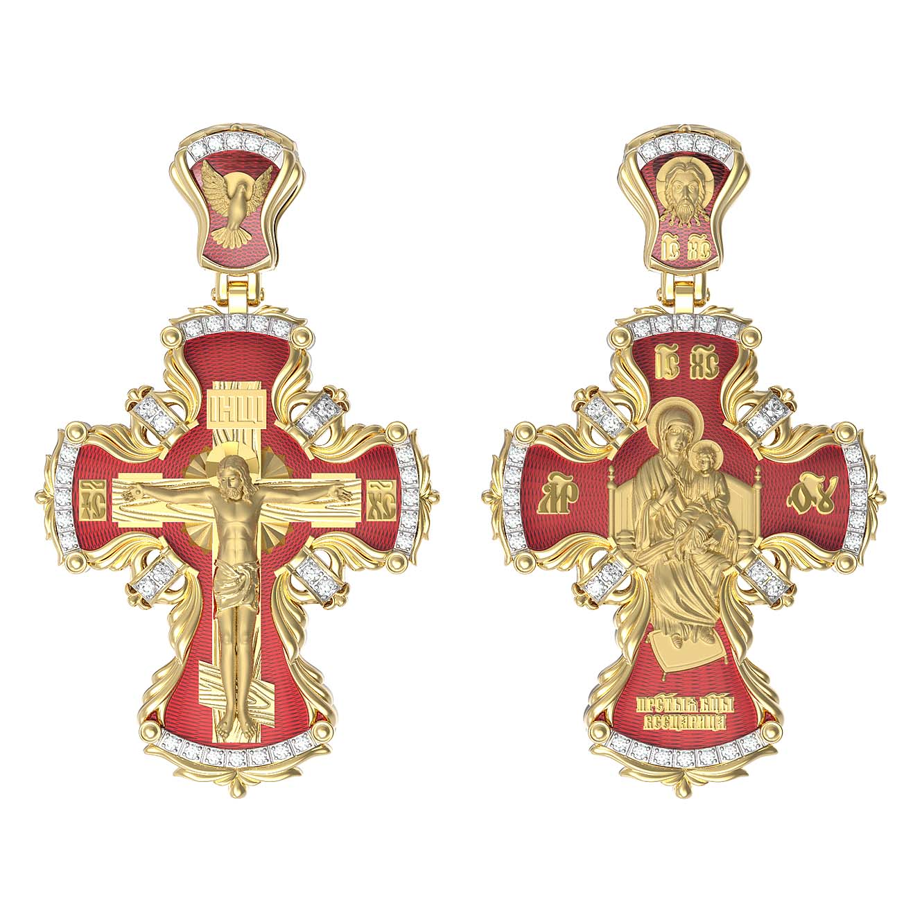 На лицевой стороне креста изображено Распятие Господа и Спасителя нашего Иисуса Христа, отдавшего Себя на смерть, чтобы другие могли жить — жить вечной жизнью, жить с Богом. Своею кровью Господь освятил крест и сделал его проводником Своей благодати, источником освящения верующих. На верхней табличке, выше головы Иисуса, расположена надпись, составленная Понтием Пилатом — «ИНЦИ». Она означает «Иисус Назорей, Царь Иудейский». Надпись «IС ХС» означает Иисус Христос помещается на разных сторонах поперечной (большой) перекладины креста. На кулонном кольце помещено изображение Духа Святого в виде голубя, сходящего с Небес.