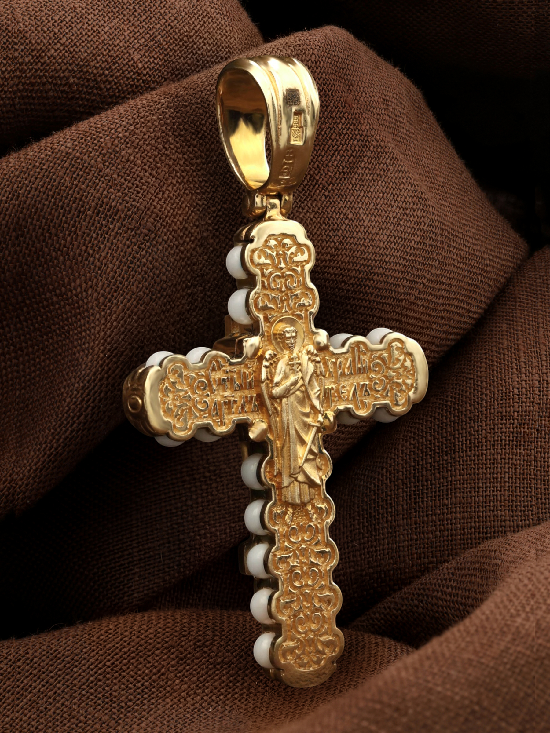 На оборотной стороне креста изображен святой Ангел-Хранитель в виде прекрасного юноши держащего в правой руке крест, а в левой — сферу. Ангел-Хранитель — это Ангел приставляемый Богом к человеку при крещении для охраны и помощи в добрых делах. Невидимо пребывая при нас постоянно, он, руководствуя нас ко спасению, не только по нашему желанию таинственно наставляет нас на все доброе и полезное, не только возносит наши молитвы к Богу, но еще и сам от себя охраняют и защищают нас от врагов видимых и невидимых, ходатайствует за нас пред Богом.